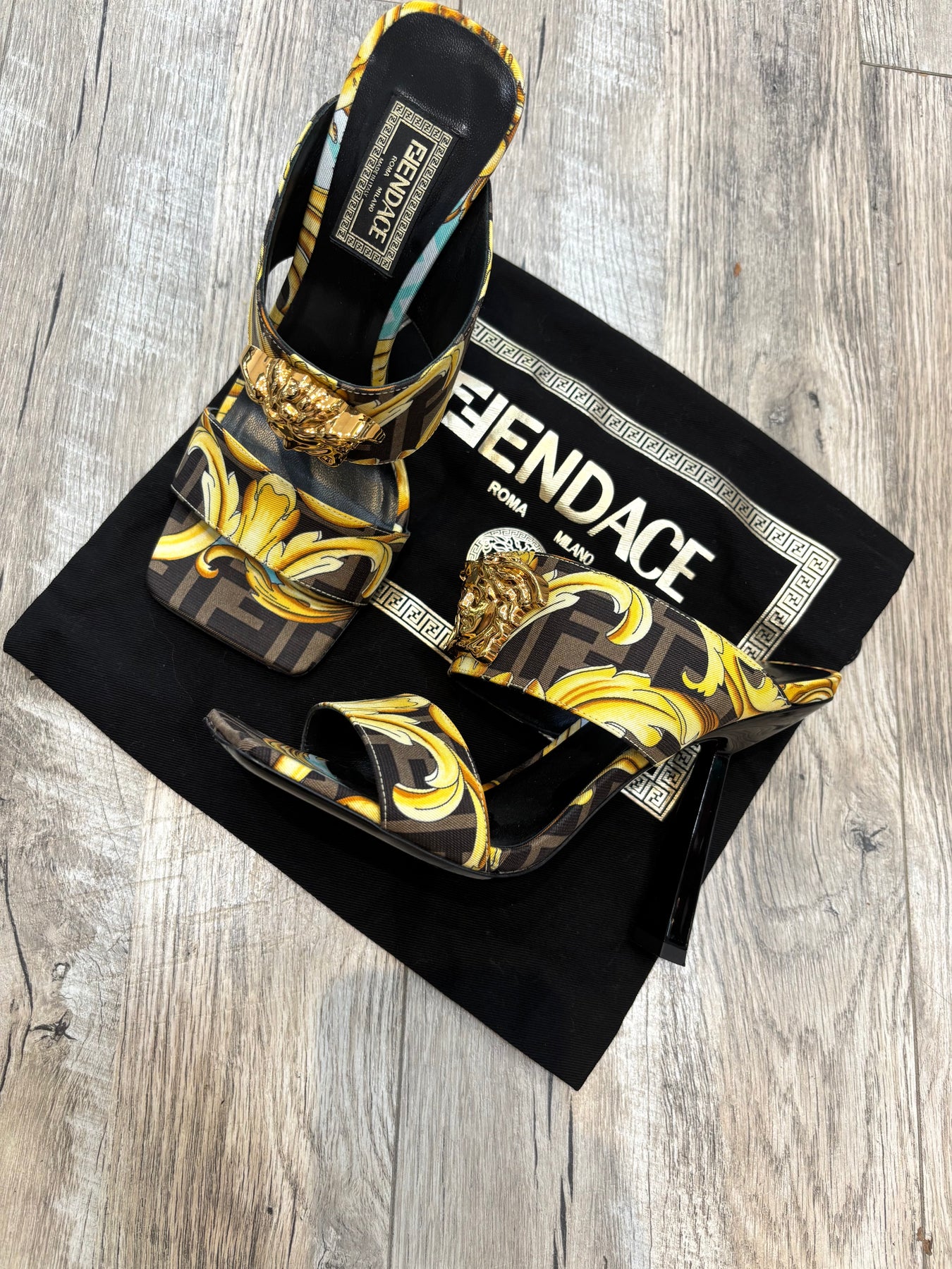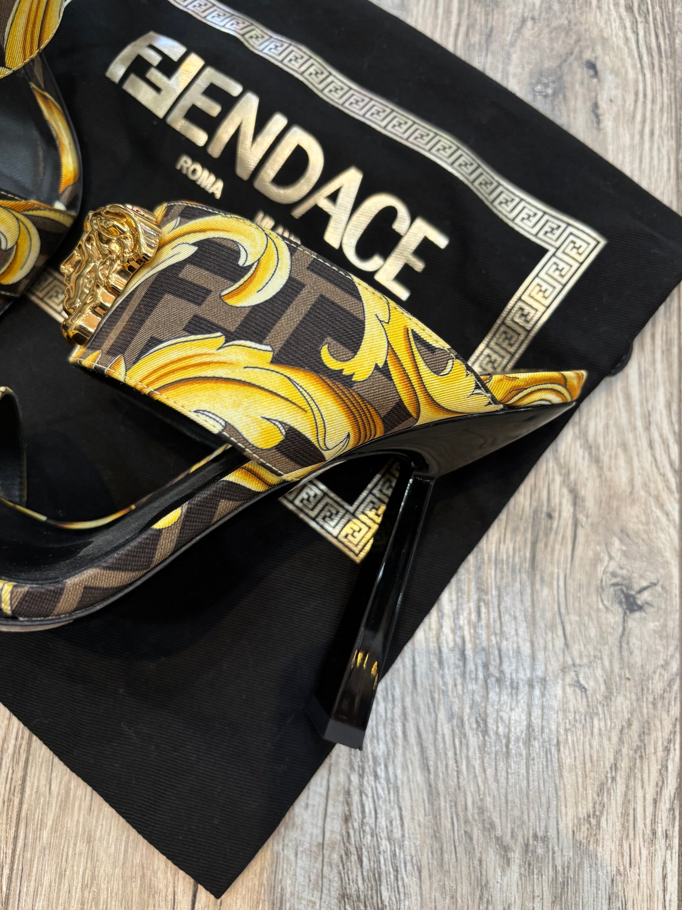 These Striking Fendace Baroque High Heel Mules are part of the iconic Fendi X Versace Collaboration, a Limited-Edition Collection that merges the signature aesthetics of both luxury houses. Crafted from woven silk and calfskin leather, the design features the bold Fendi FF motif interlaced with Versace’s unmistakable golden Baroque pattern.