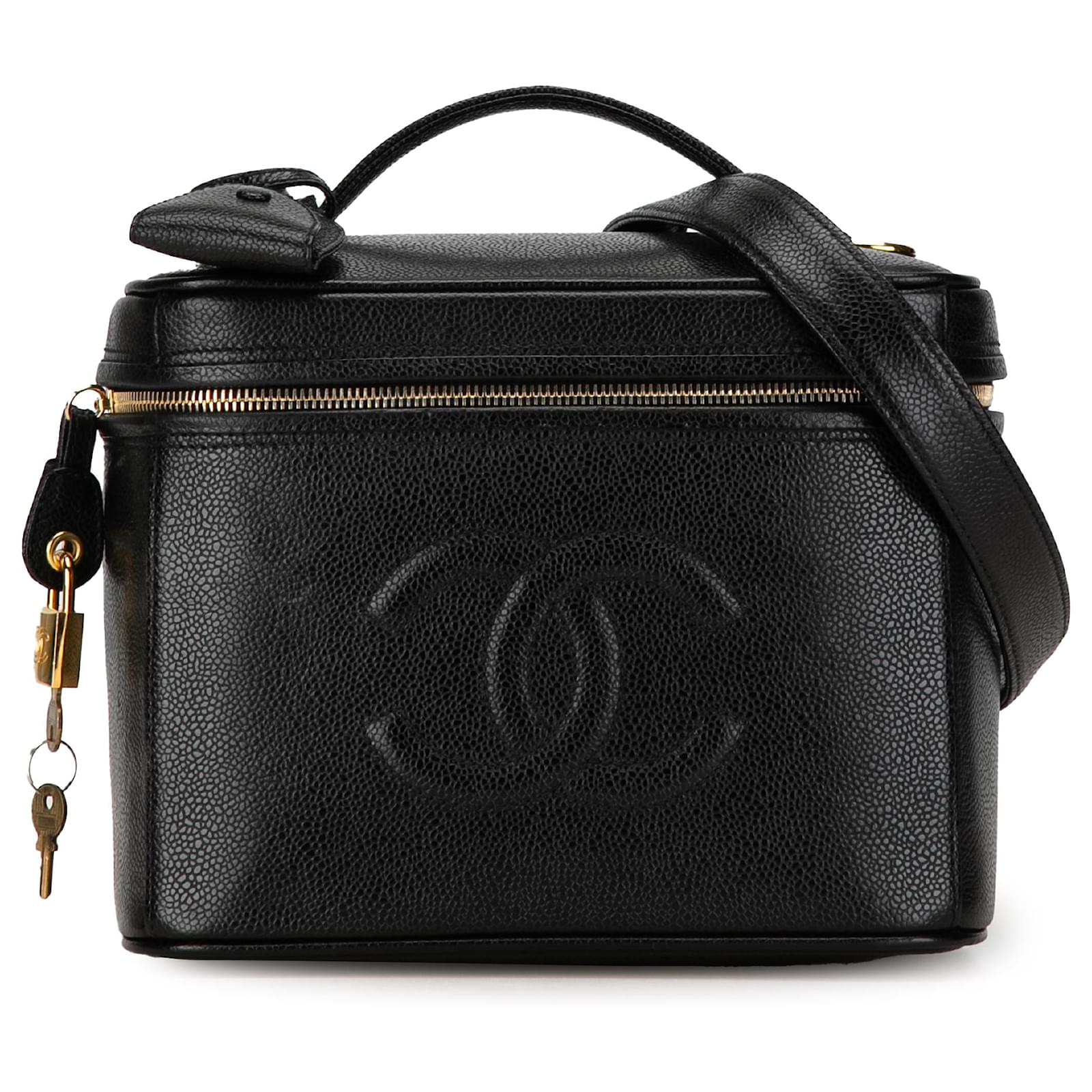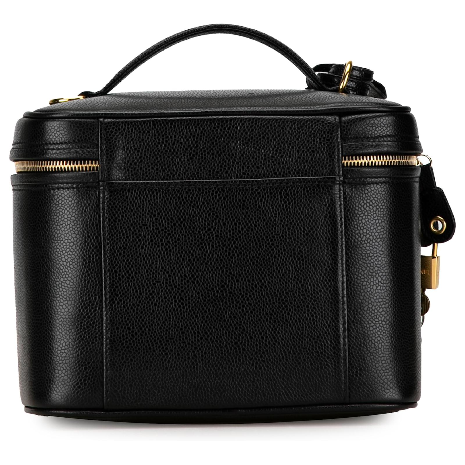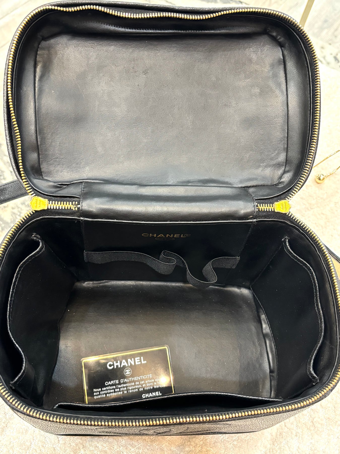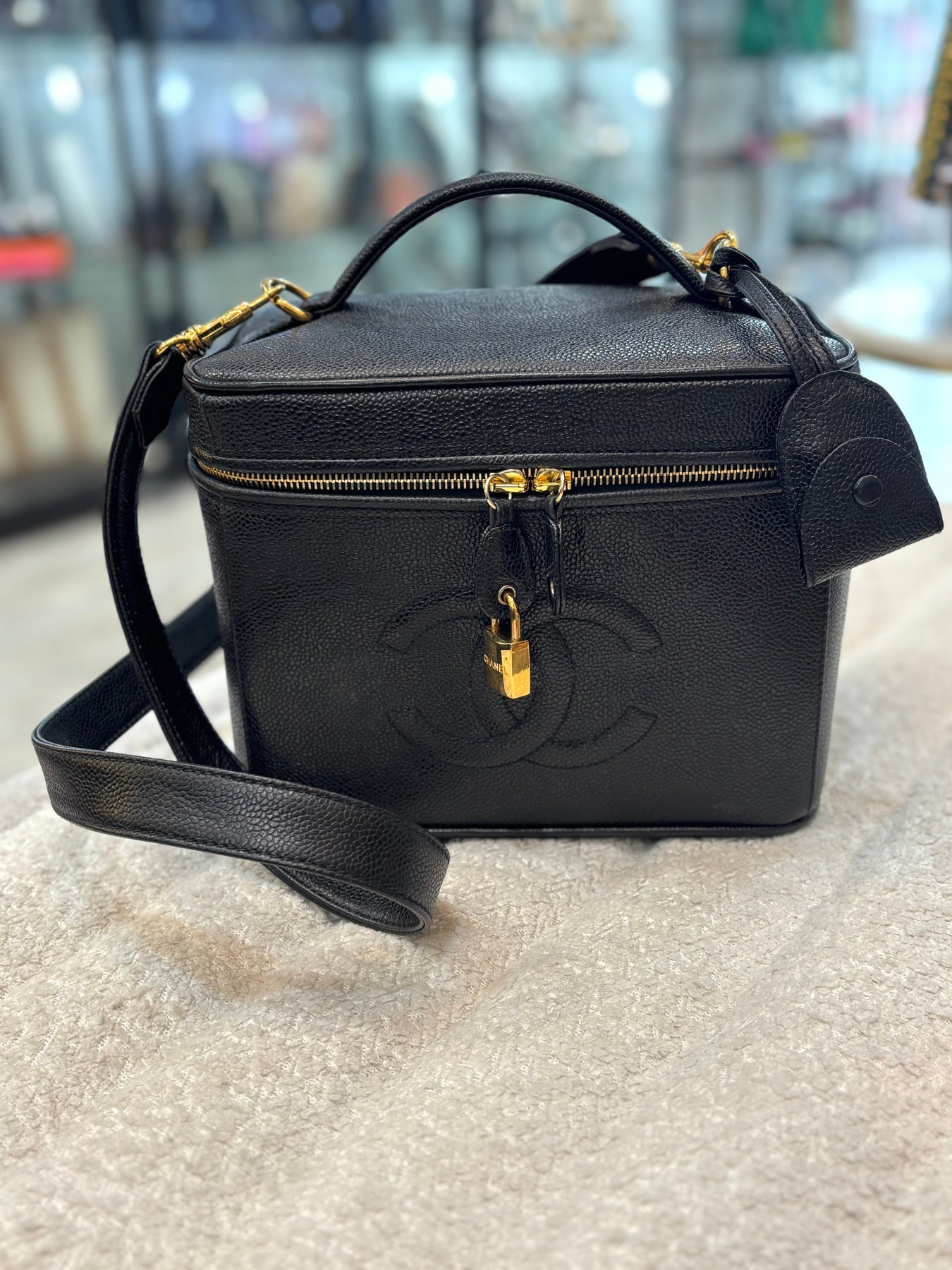 Timeless and refined, this vintage Chanel vanity bag is crafted from durable black caviar leather and accented with elegant gold-tone hardware. Designed under the creative direction of Karl Lagerfeld, the structured silhouette offers both style and functionality, making it a versatile addition to any luxury collection.