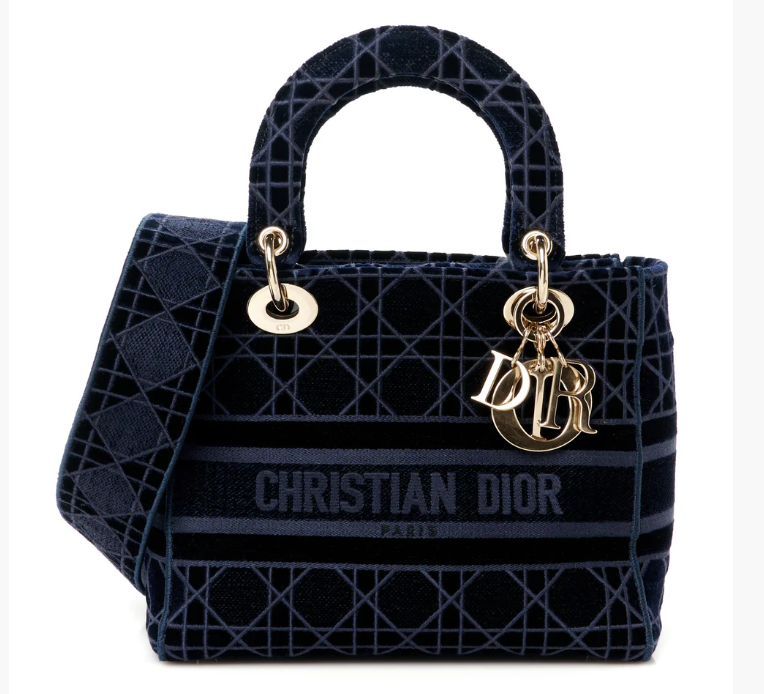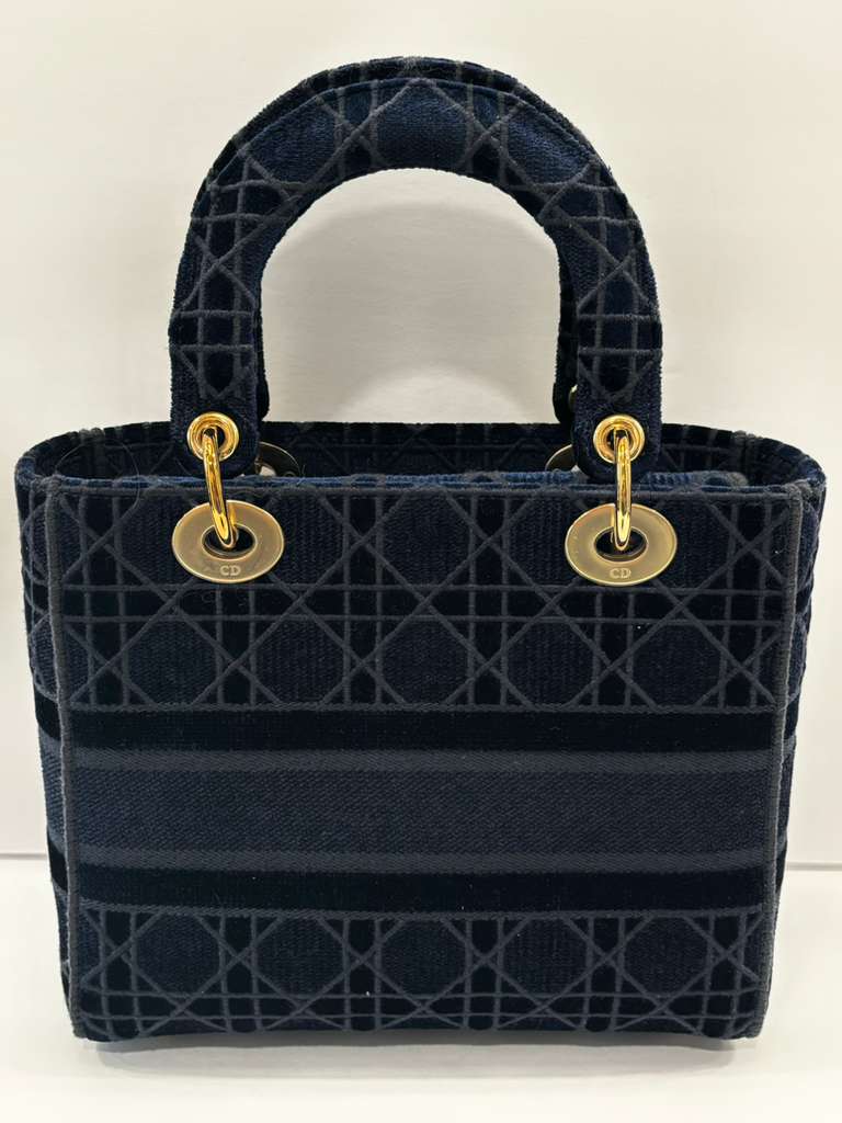 The Dior Velvet Cannage Medium Lady D-Lite Bag is a refined expression of the House’s timeless elegance. Crafted in plush velvet, the bag is adorned with Dior’s signature Cannage embroidery, offering rich texture and a sophisticated finish. The structured silhouette is elevated by the iconic “D.I.O.R.” charms, while the spacious interior makes it as functional as it is elegant. A statement piece that effortlessly transitions from day to evening.