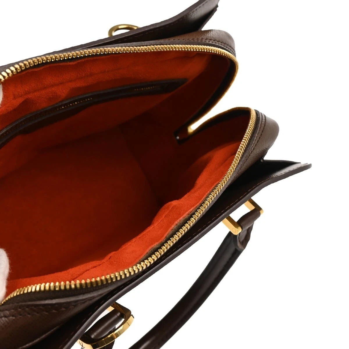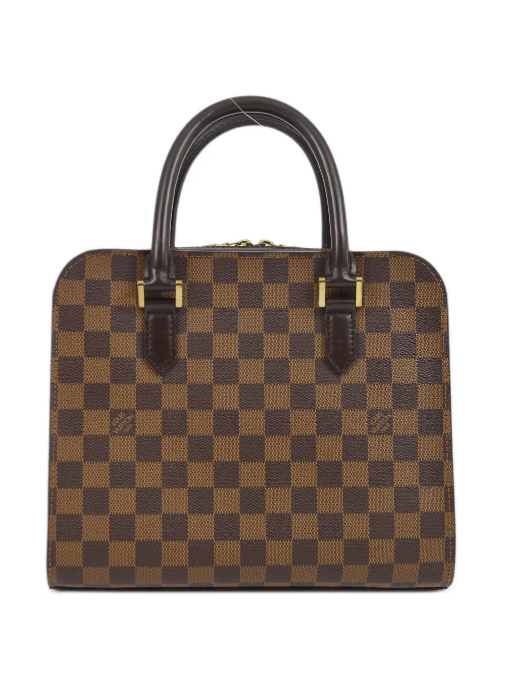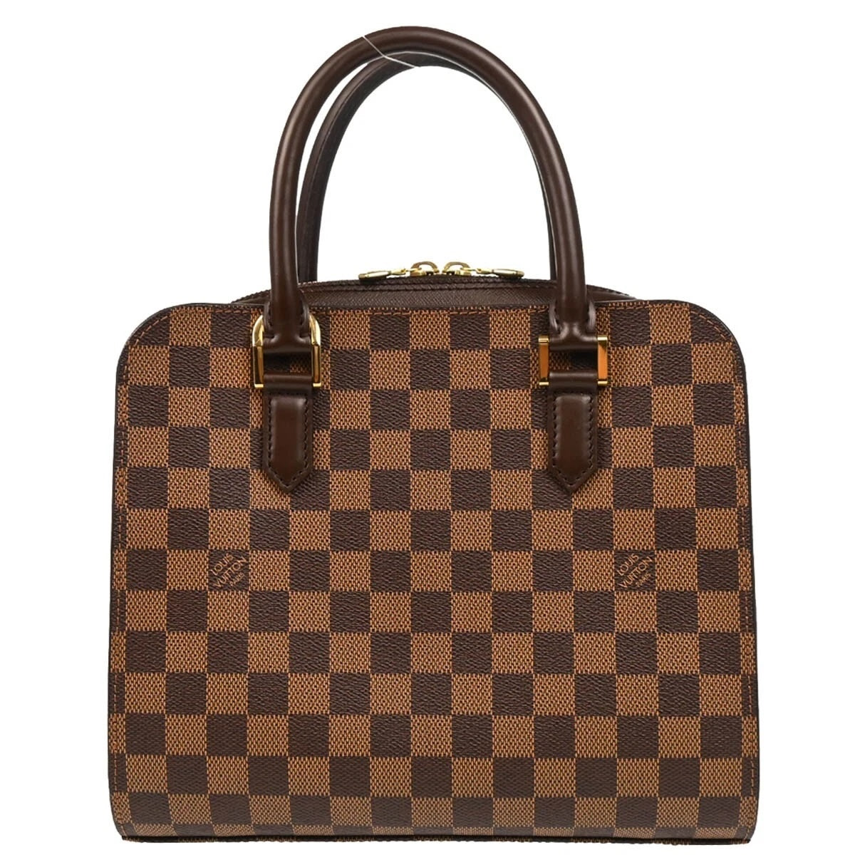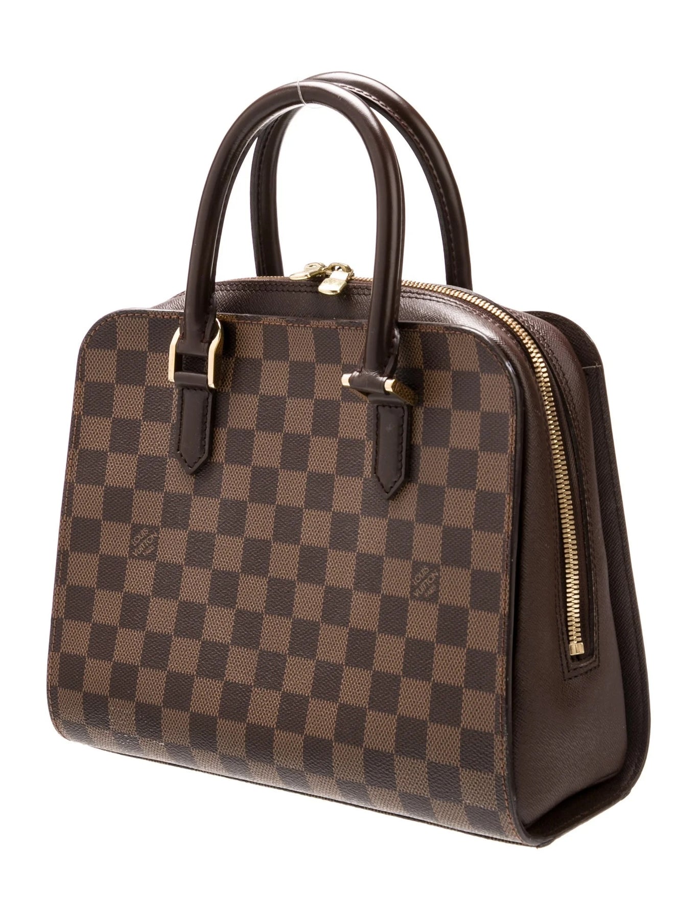 Refined sophistication meets everyday elegance in this Damier Ebene-canvas Handbag from Louis Vuitton. Crafted in the signature checker-board coated canvas—rich chocolate-and-espresso tones that embody understated luxury— the Tirana style features polished leather trim and rolled leather top handles for a comfortably elevated carry. A full-zip closure spans the top, securing a thoughtfully designed interior lined in deep red microfiber or fabric, offering one interior zip pocket and open compartments for organization. With its balanced proportions—ideal for urban style or weekend sophistication—it becomes a versatile partner for both work and evening looks.