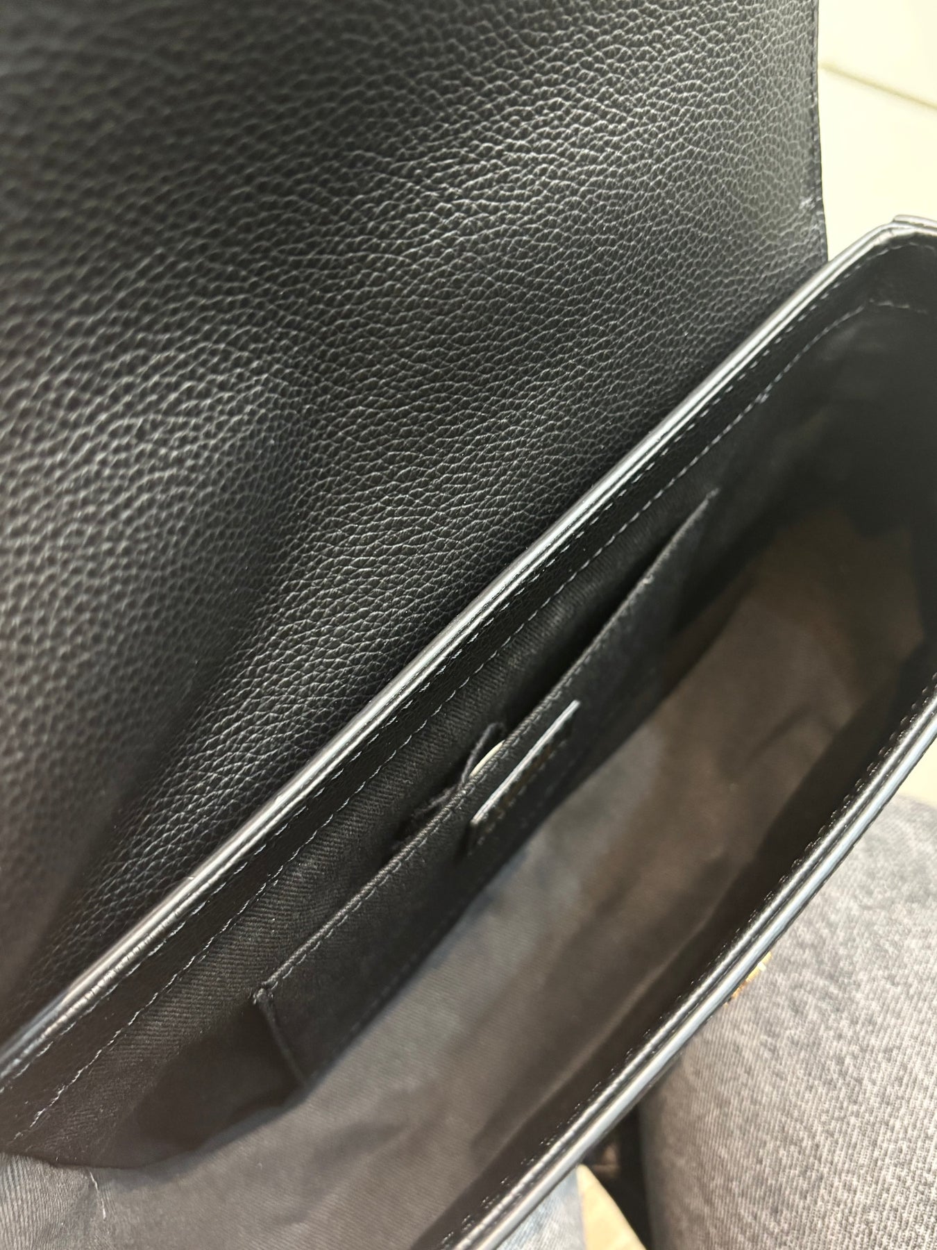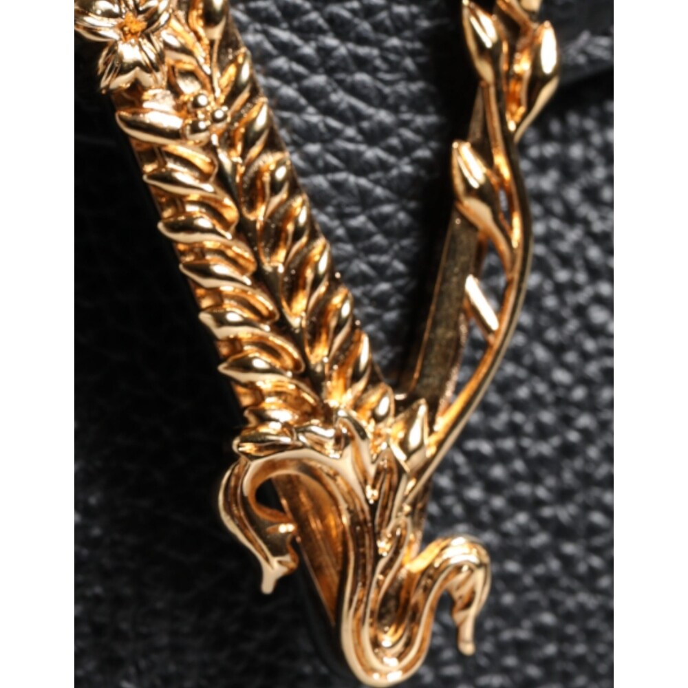 A bold expression of modern elegance, the Versace Virtus Leather Handbag is expertly crafted from smooth, premium leather with a structured and sophisticated silhouette. The front is adorned with the iconic Virtus V baroque emblem, symbolizing strength and confidence, and finished in polished metal for a striking contrast. Designed with versatility in mind, the handbag features a refined interior that offers ample space for daily essentials while maintaining a sleek profile. Elevated by signature Versace detailing and impeccable craftsmanship, this piece transitions seamlessly from day to evening with effortless glamour.