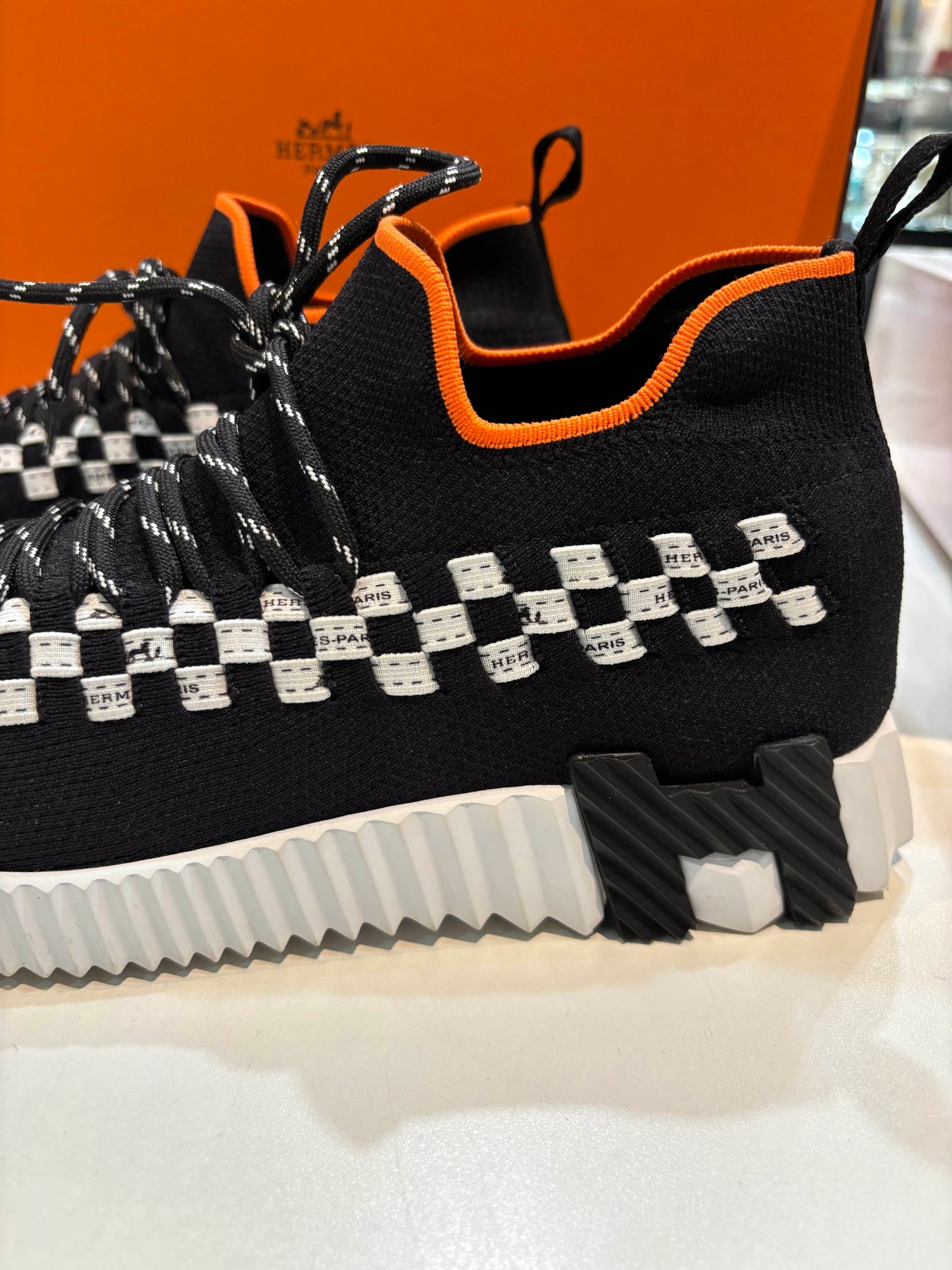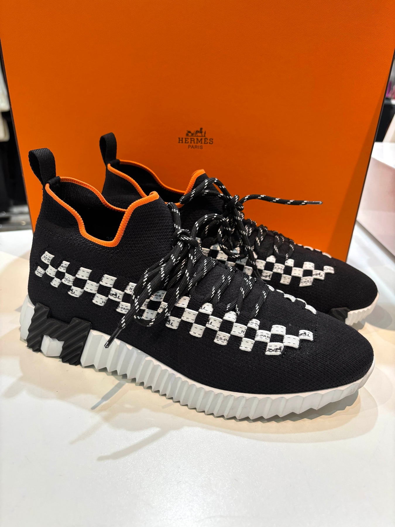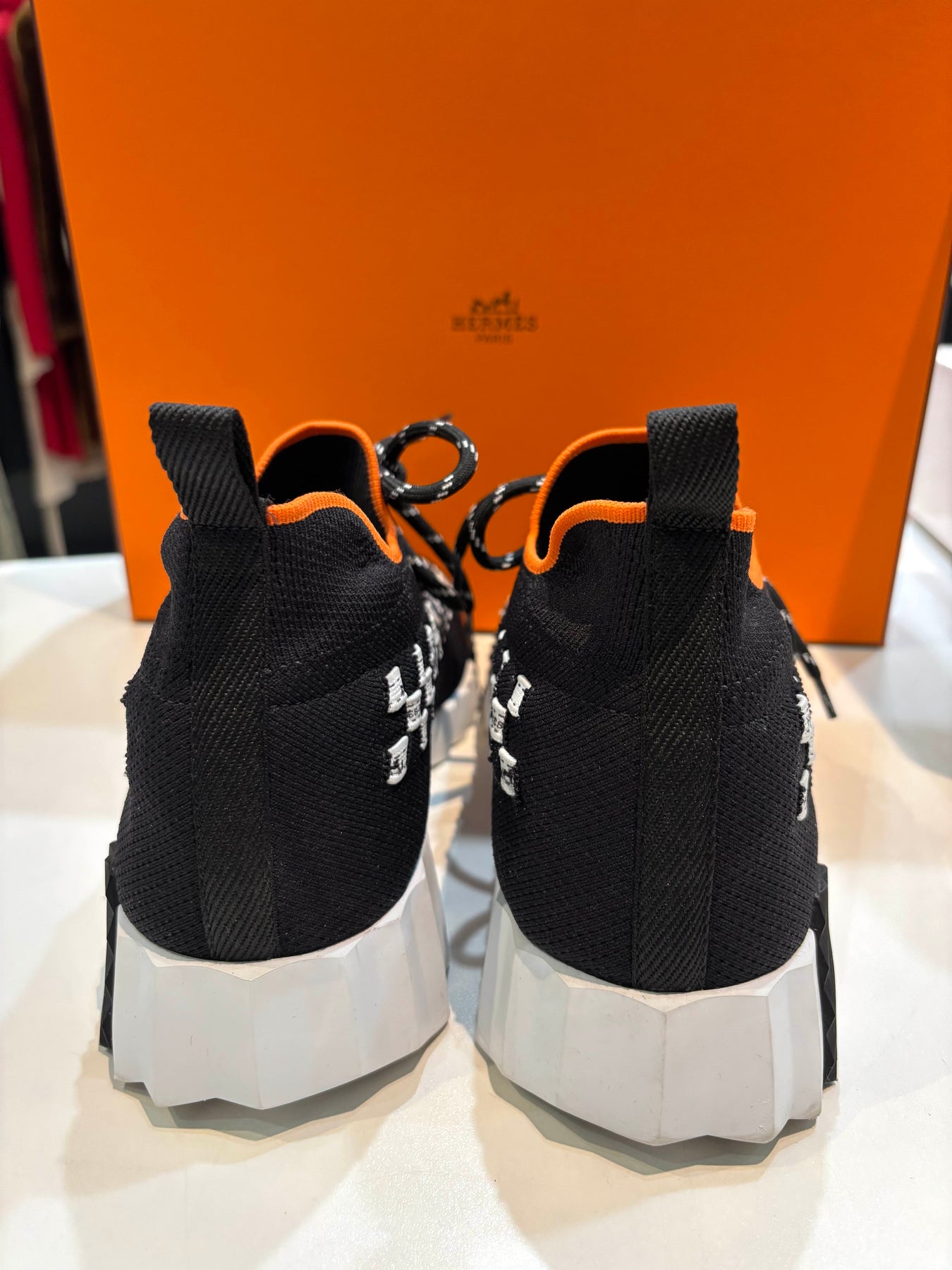 The lightweight, sock-style upper offers a comfortable, flexible fit, while the sculpted rubber sole provides modern edge and everyday wearability. Finished with contrasting Hermès orange lining and detailed laces, these sneakers balance sporty functionality with refined Parisian design.