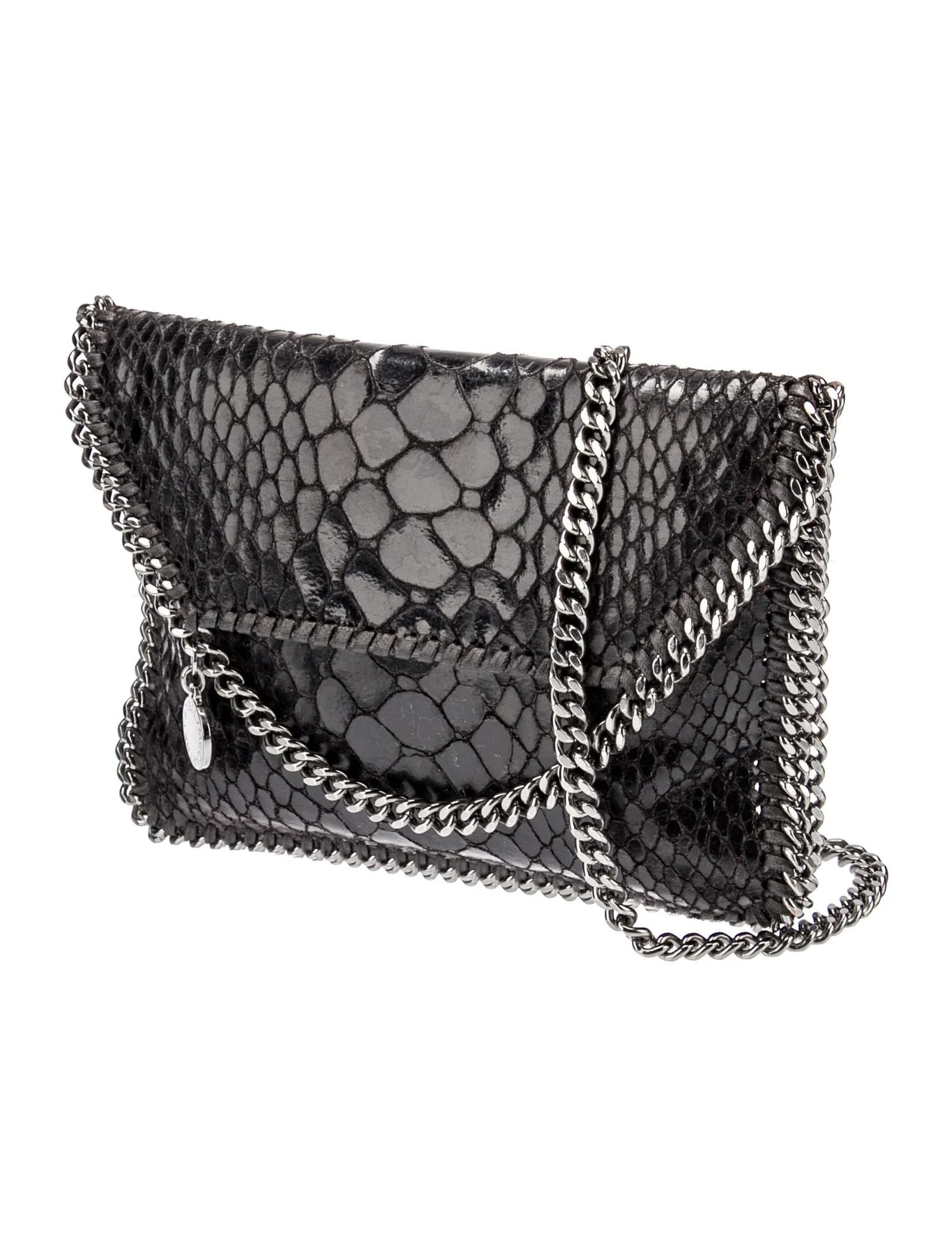 Embrace a fusion of edgy design and ethical luxury with the Falabella Fold-Over Bag. Crafted from a vegan alternative to snakeskin, this tote features the iconic diamond-cut chain and can be worn in multiple ways, offering versatility and style.