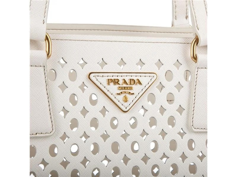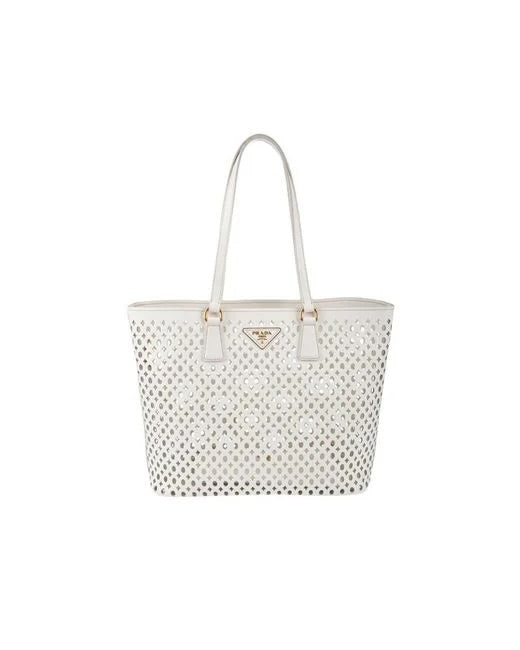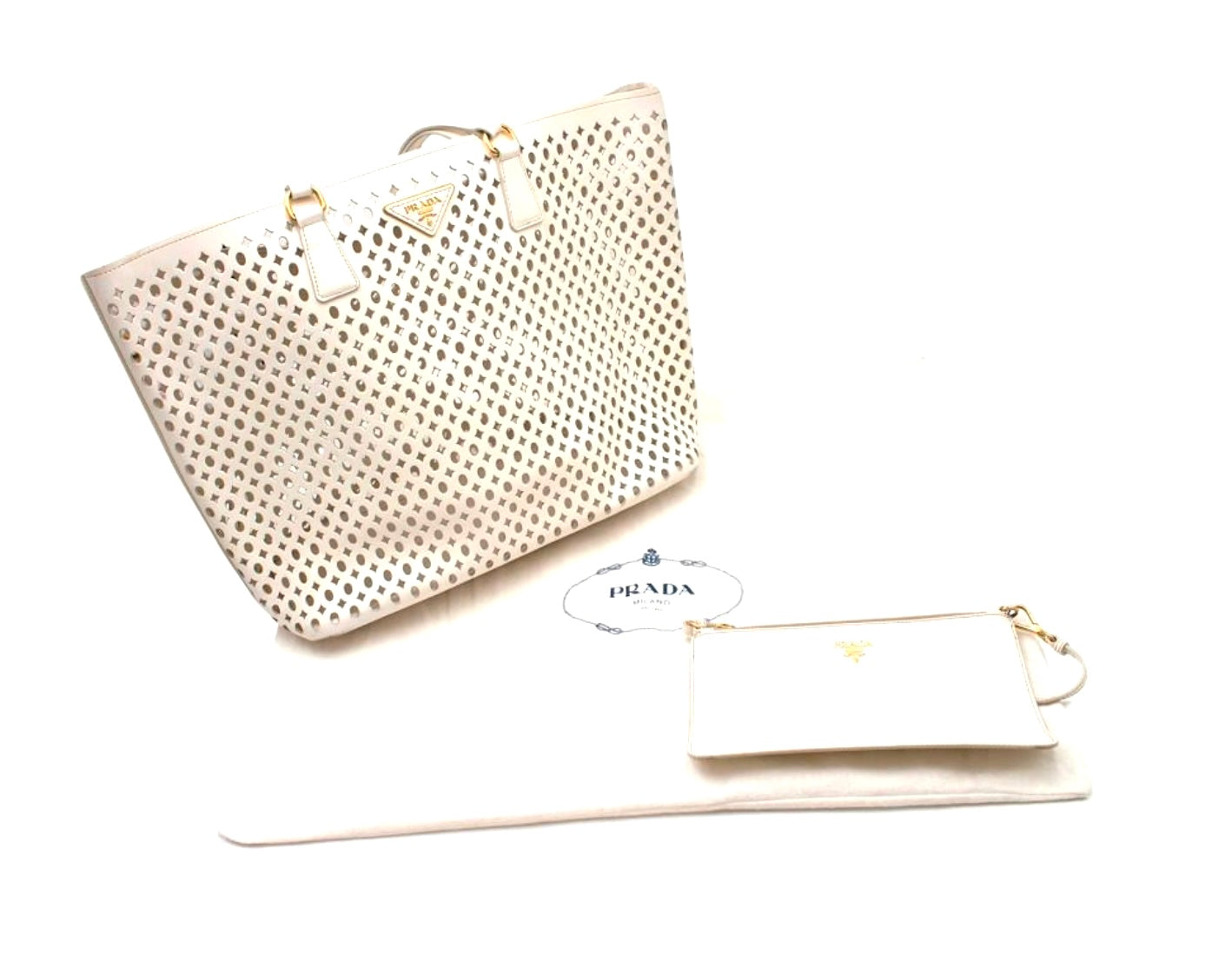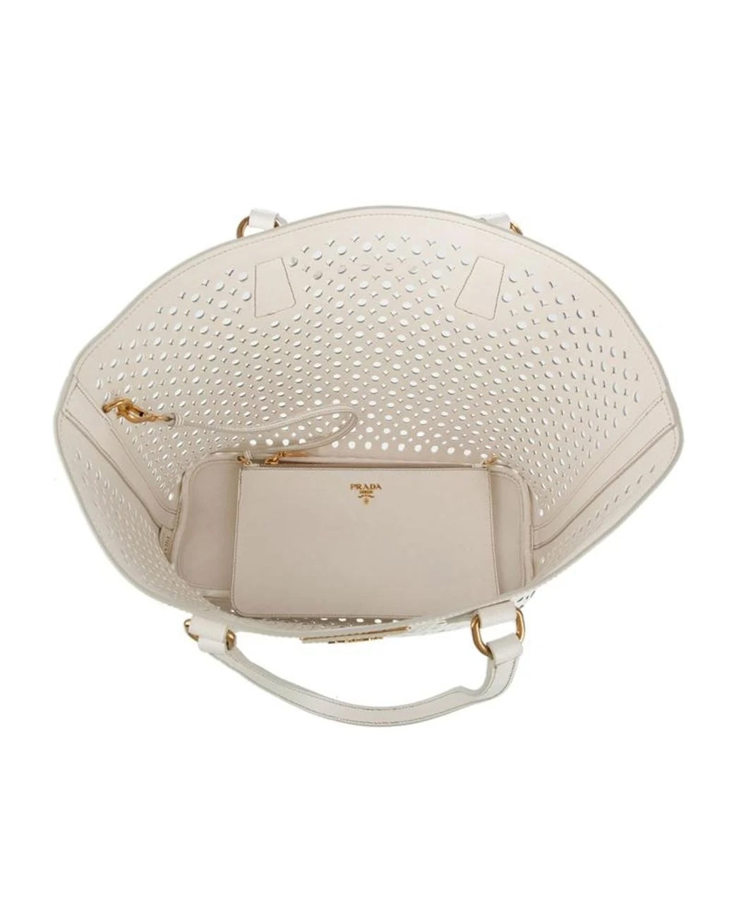 PRADA PERFORATED OFF WHITE LEATHER TOTE WITH POUCH