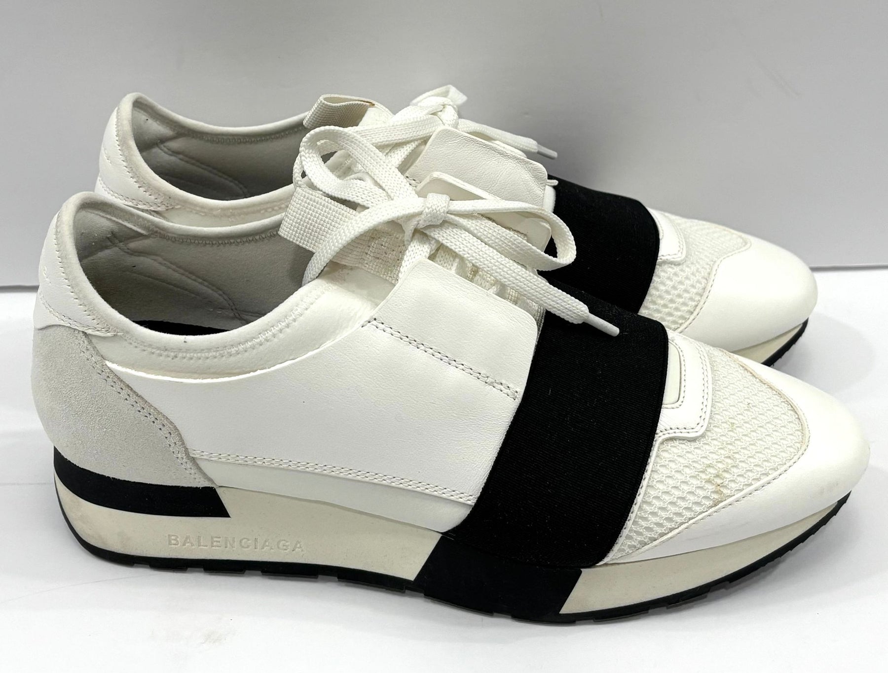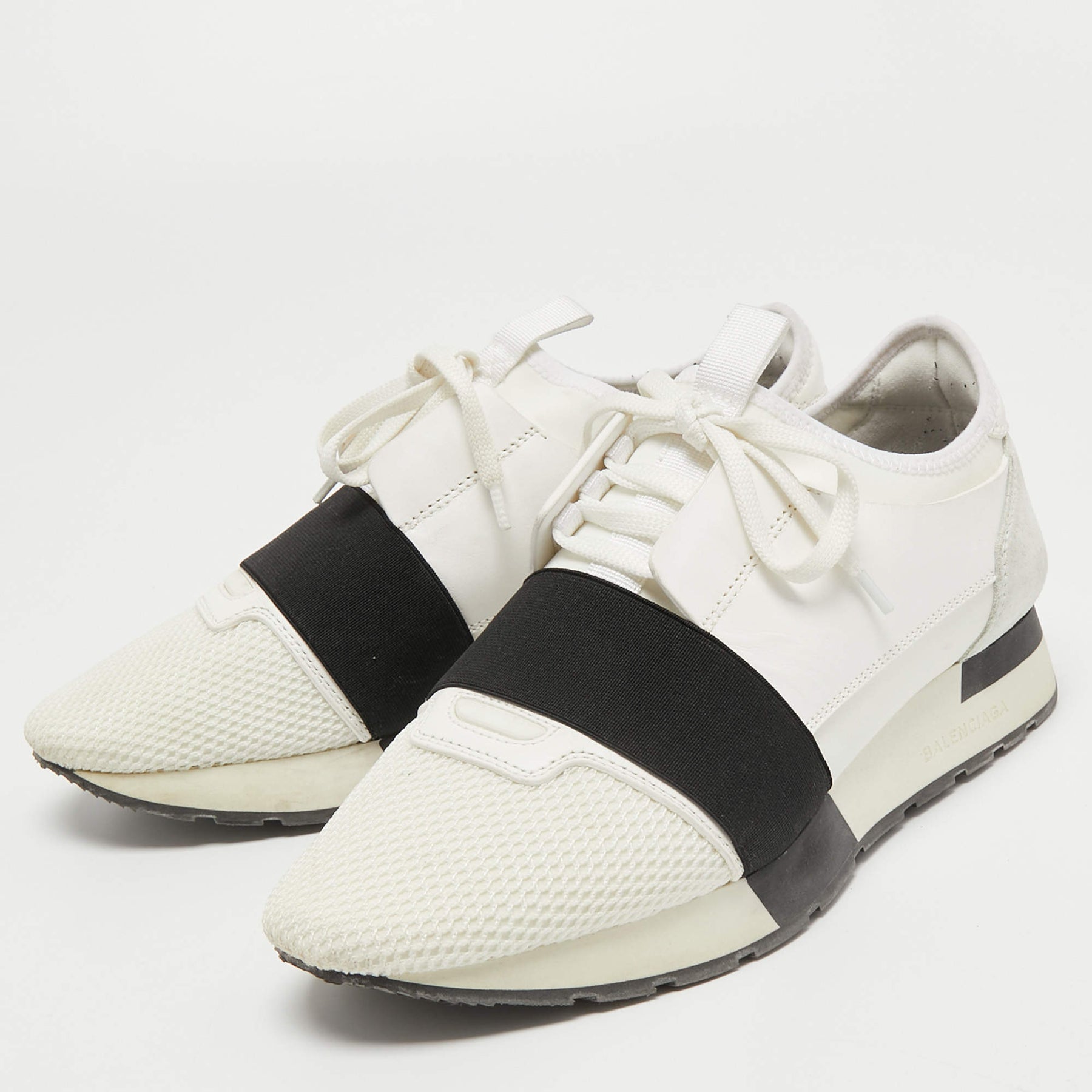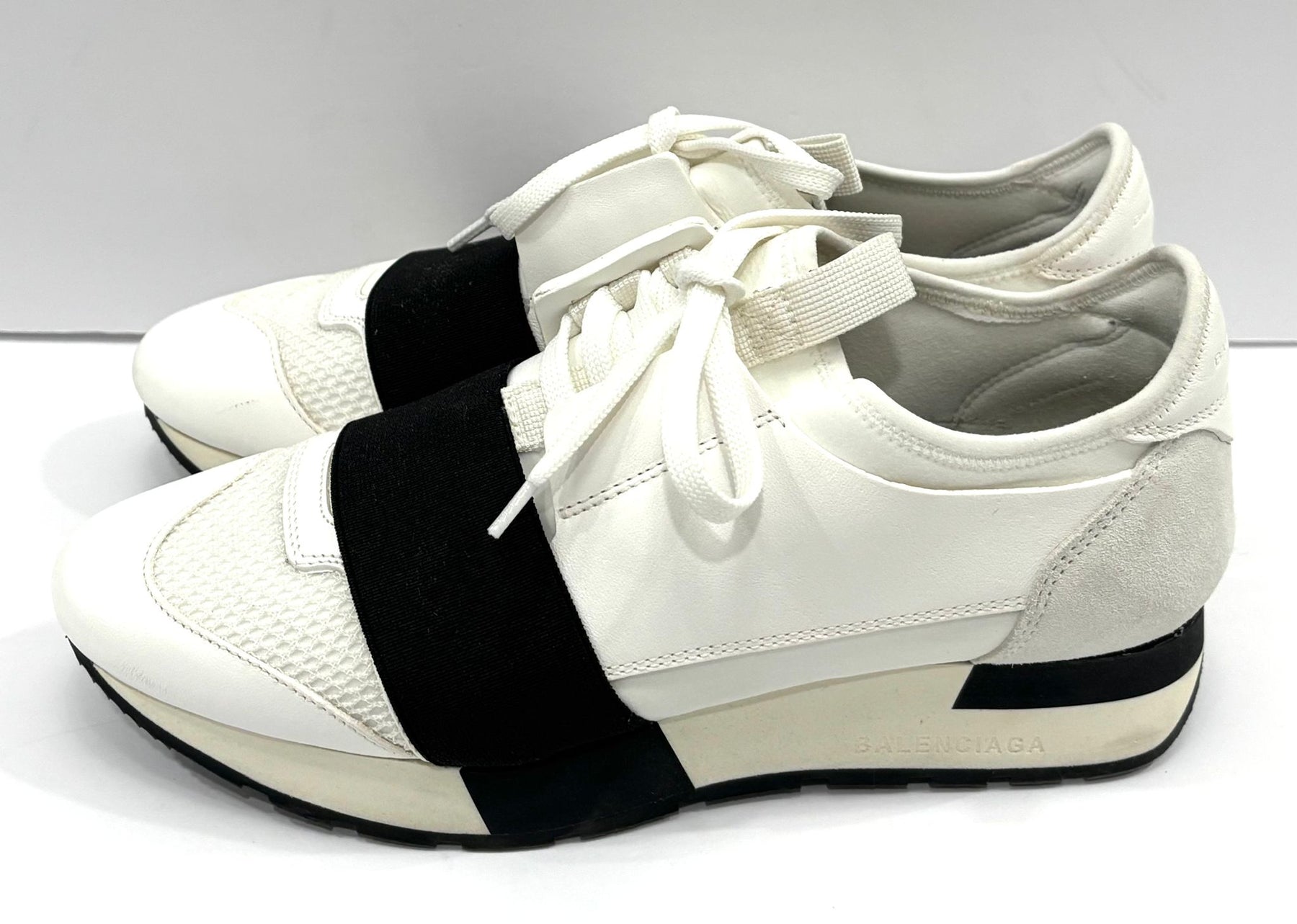 Sporty, sleek, and unmistakably modern, the Balenciaga Black & White Race Runner Sneakers blend luxury craftsmanship with athletic-inspired design. This iconic silhouette features a dynamic mix of materials—mesh, neoprene, leather, and suede—creating striking contrast and texture in classic monochrome tones.
