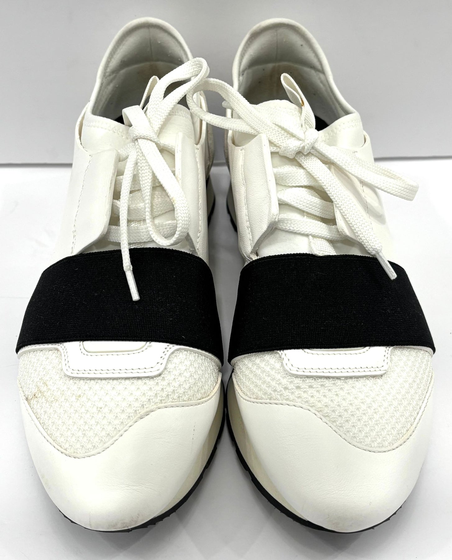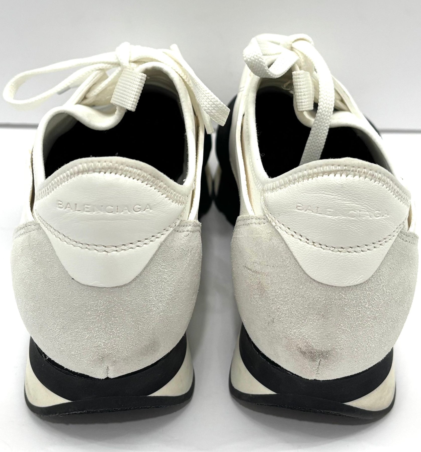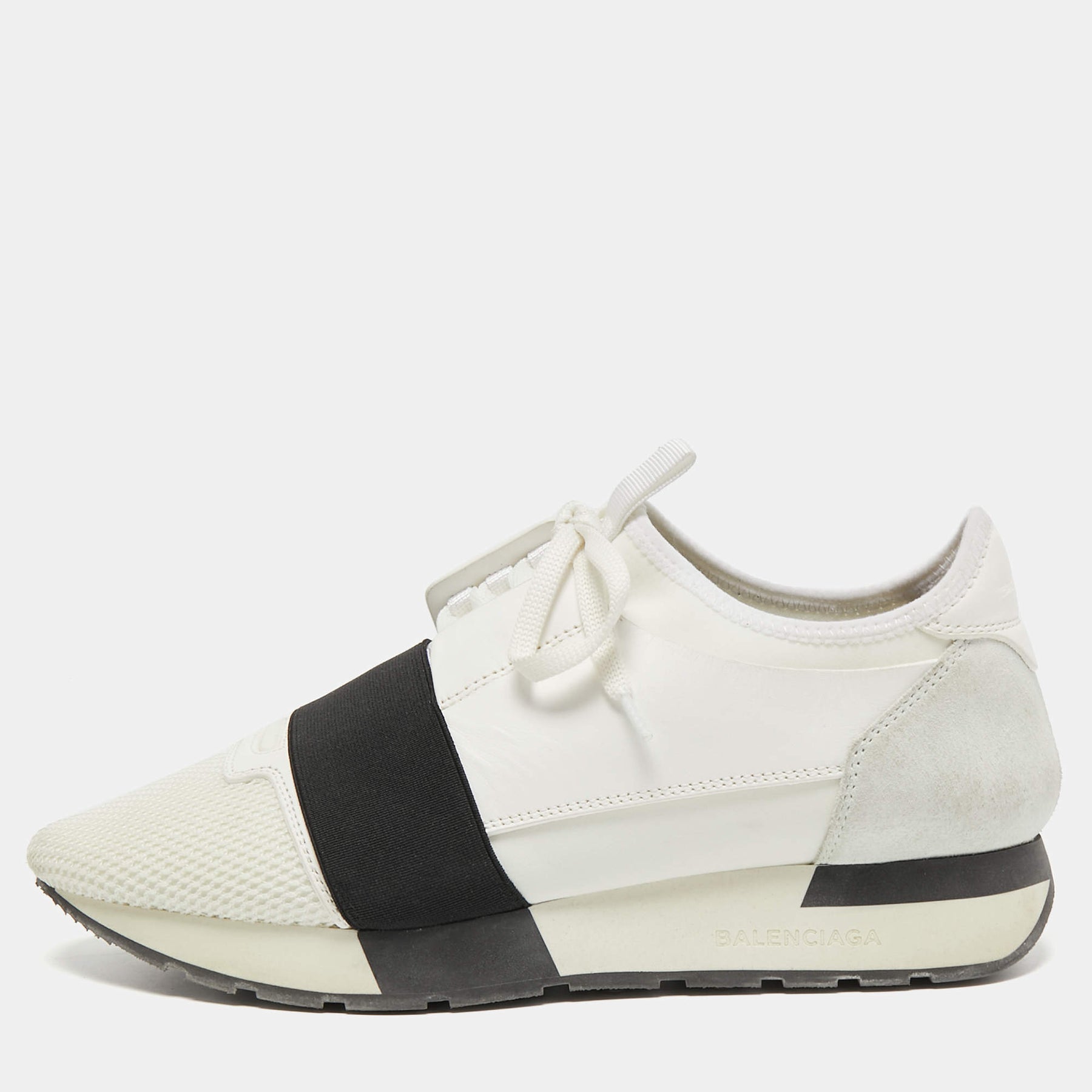 Sporty, sleek, and unmistakably modern, the Balenciaga Black & White Race Runner Sneakers blend luxury craftsmanship with athletic-inspired design. This iconic silhouette features a dynamic mix of materials—mesh, neoprene, leather, and suede—creating striking contrast and texture in classic monochrome tones.