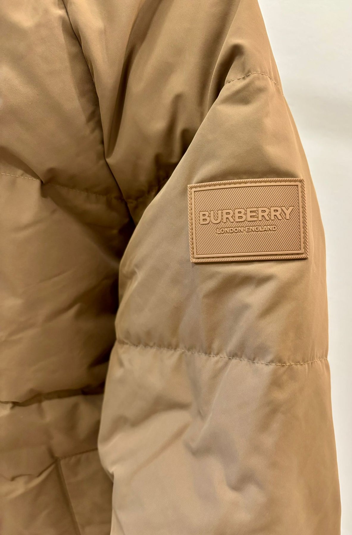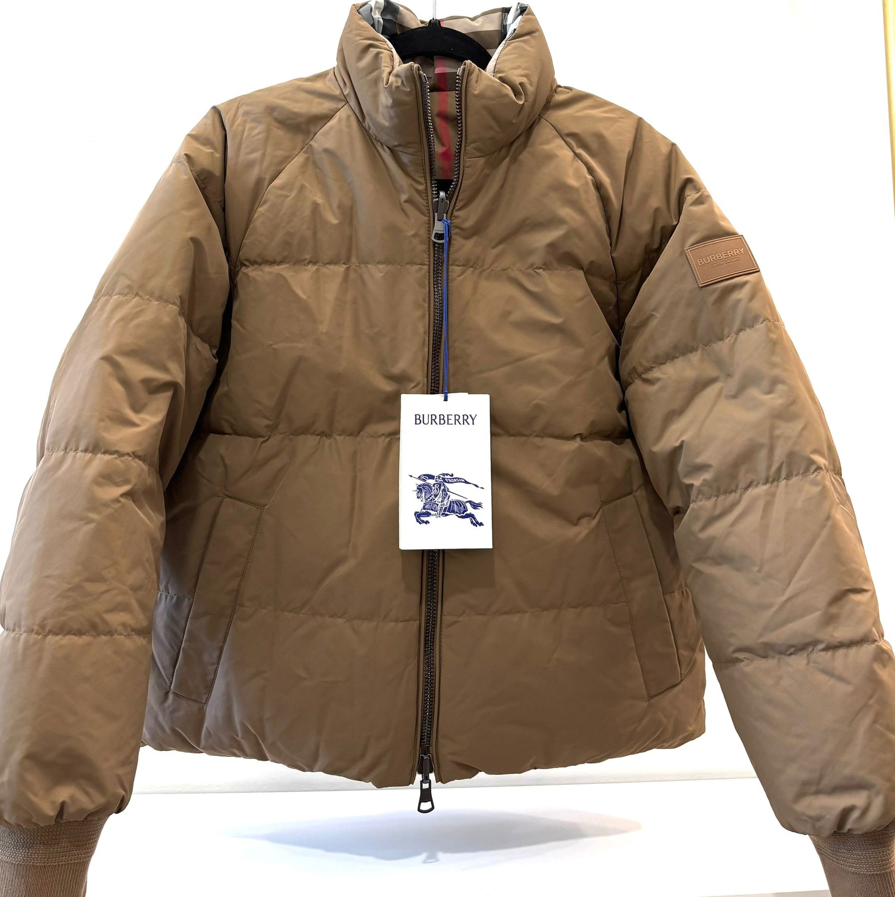 The jacket features a plush down-filled construction, offering exceptional insulation without bulk. A high stand collar, detachable drawcord hood, and cinched waist detailing lend a flattering silhouette, while Burberry’s signature checked lining adds an iconic touch of heritage.