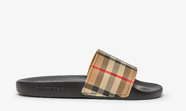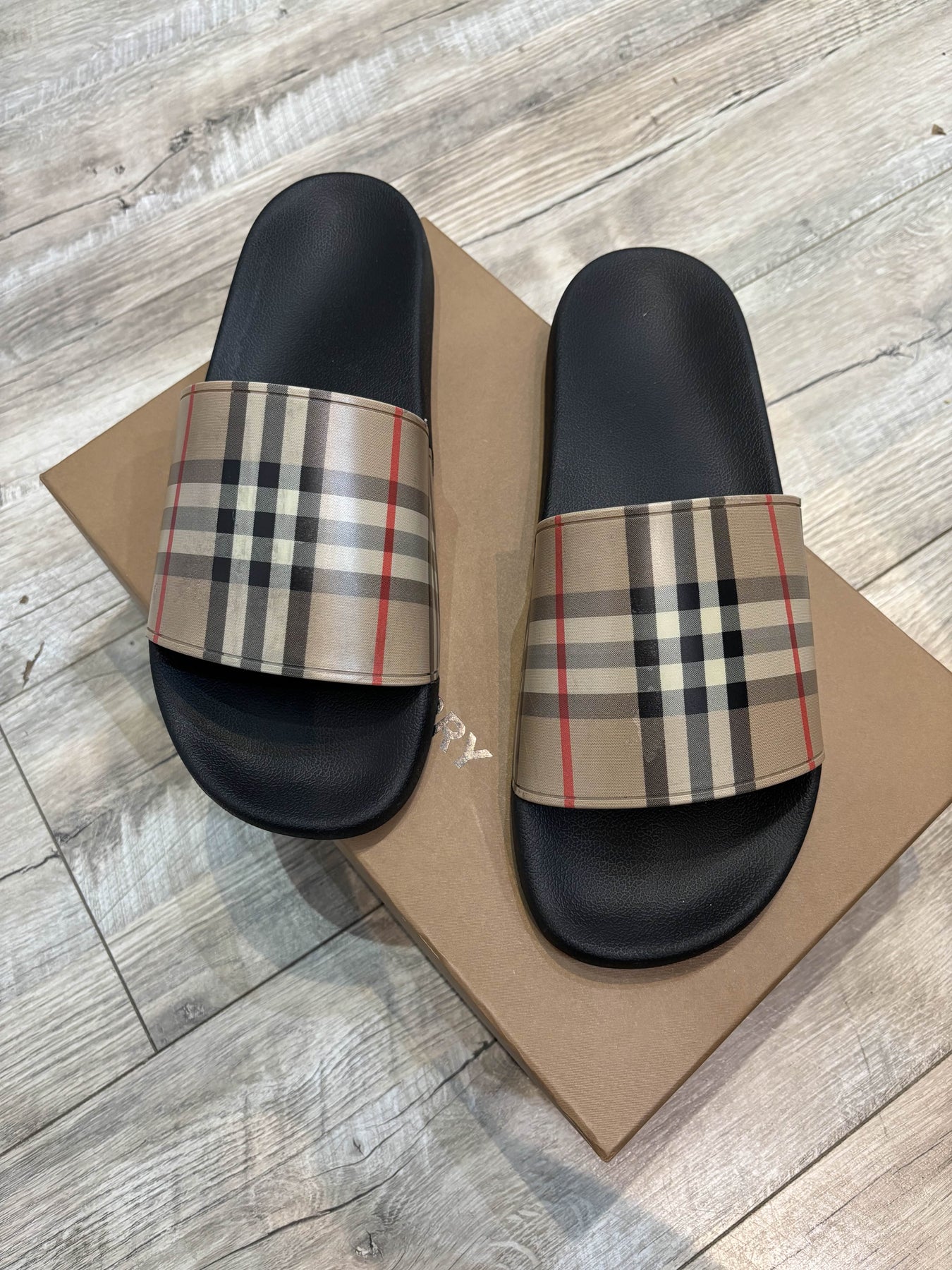 A modern essential infused with iconic British heritage, the Burberry Men’s Check Slides showcase the brand’s signature check pattern in a sleek, contemporary silhouette. Crafted from premium materials, these slides feature a comfortable molded footbed and an easy slip-on design for effortless wear. Versatile and stylish, they are perfect for casual outings, travel, or poolside lounging, delivering understated luxury with everyday comfort.