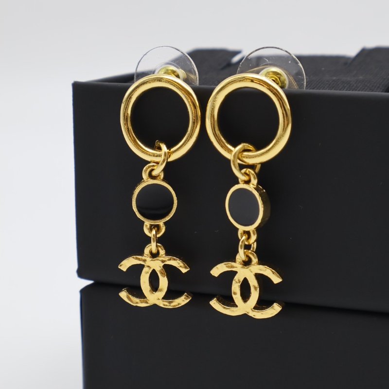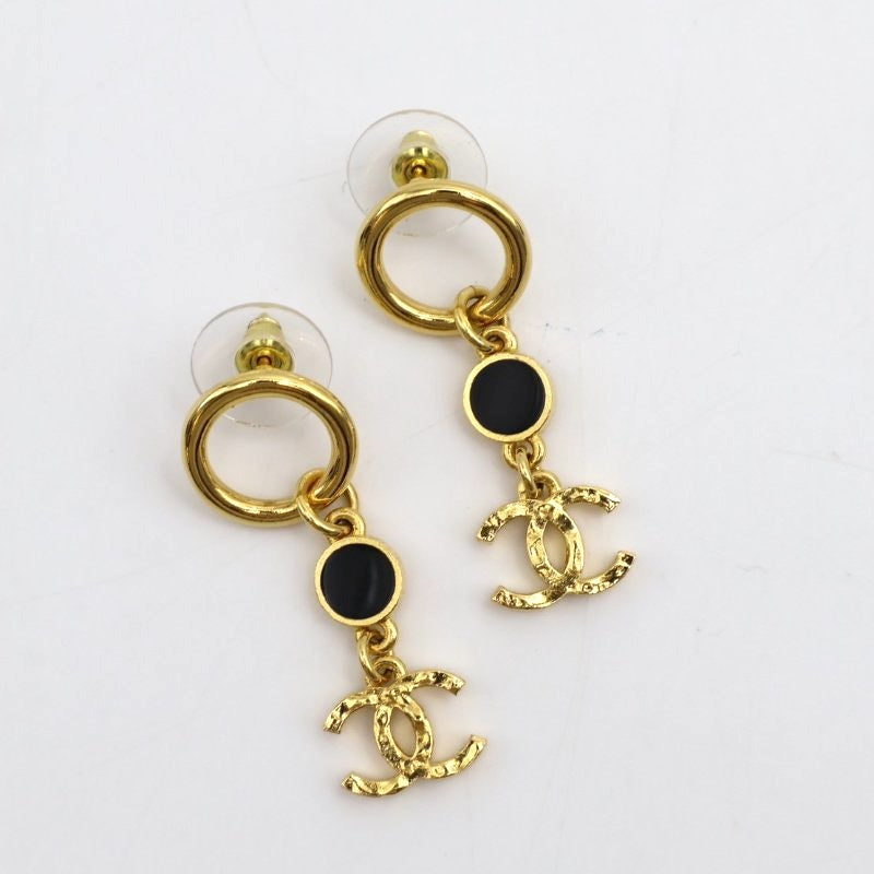 Elegant and iconic, These Stunning Chanel dangle earrings feature the classic interlocking CC logo in a luxurious Gold-tone finish. At the center of each earring is a striking Round black enamel medallion, adding bold contrast and timeless appeal. The refined combination of gold and black makes these earrings a versatile statement piece perfect for both day and evening wear.