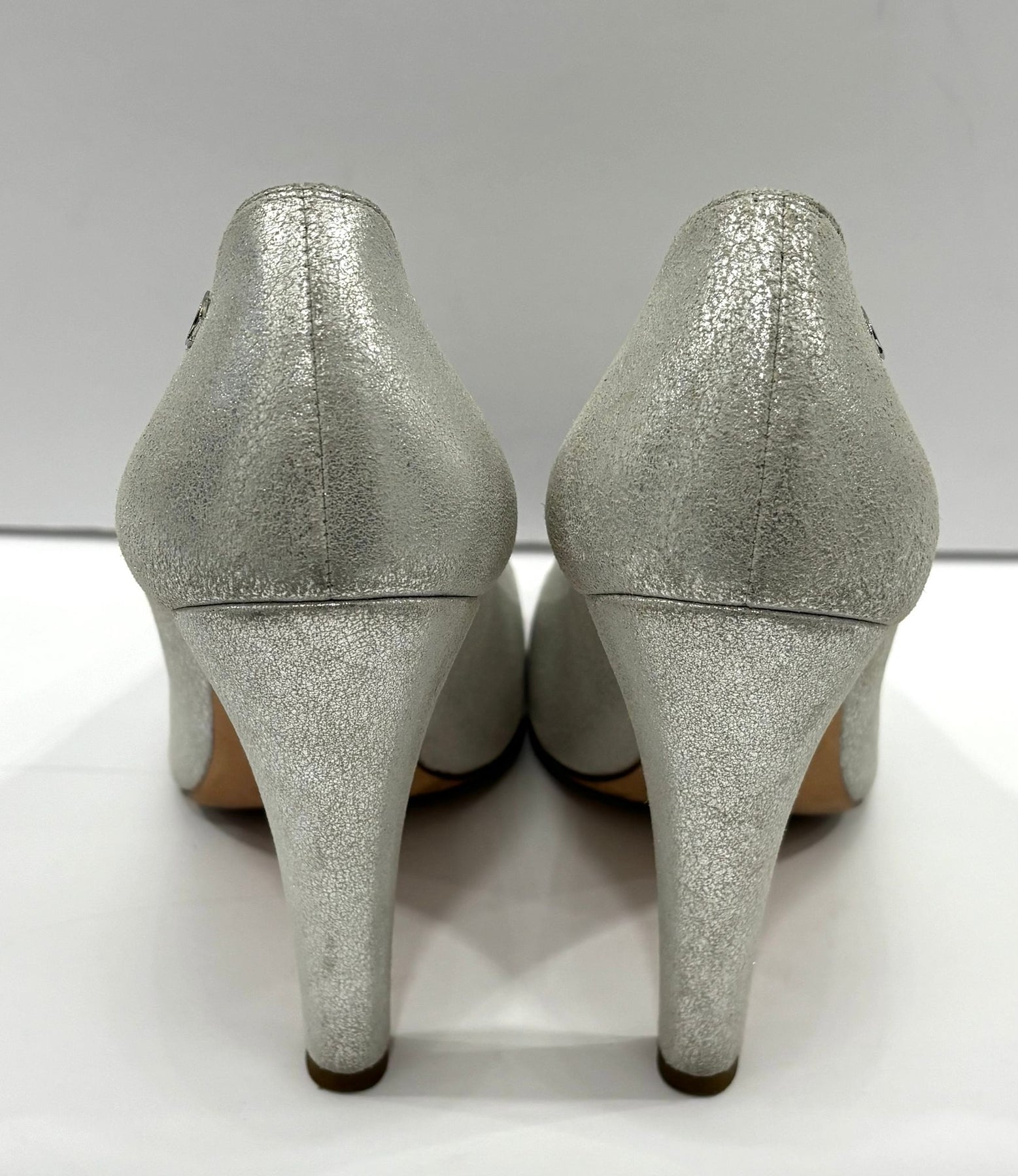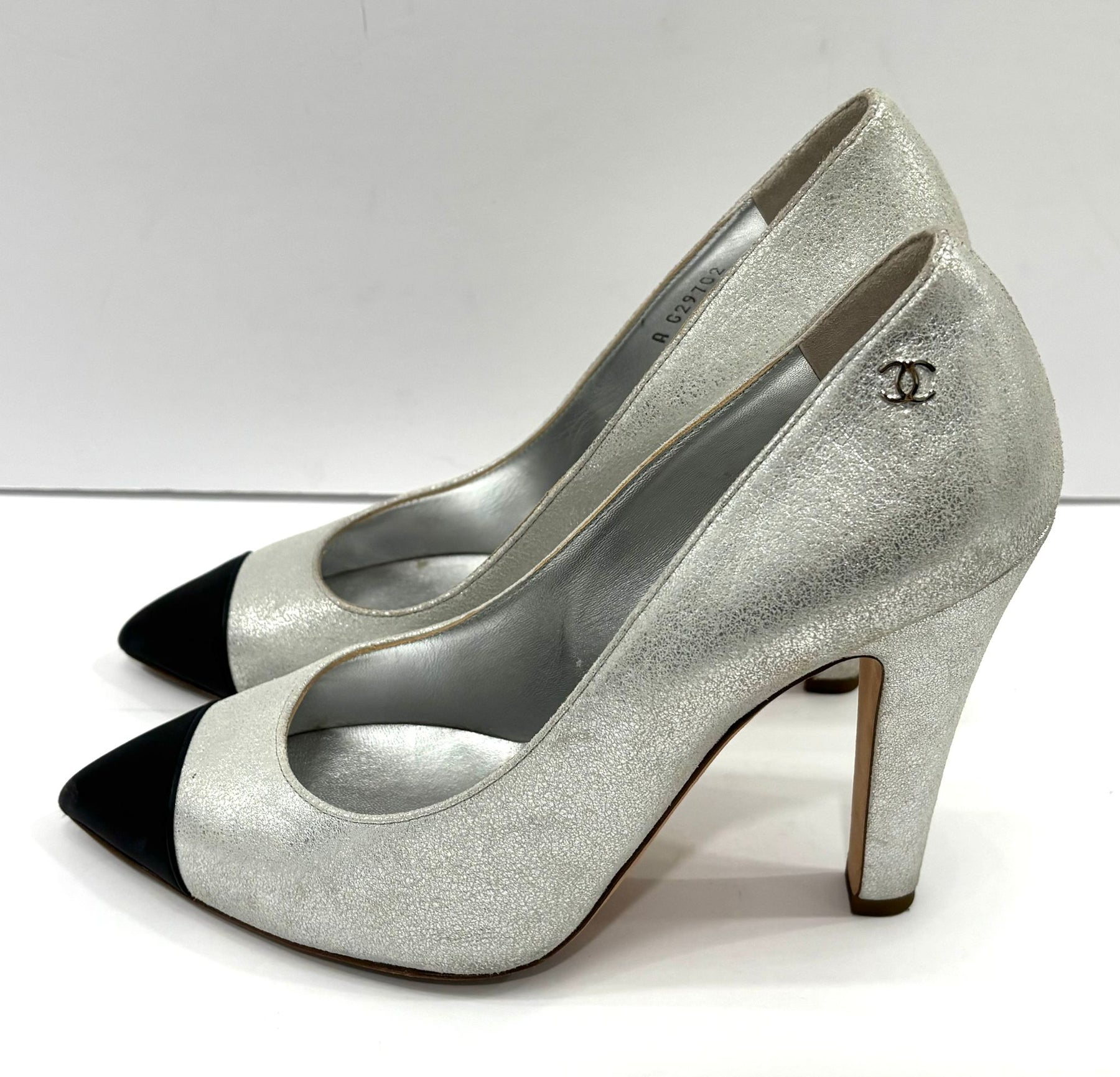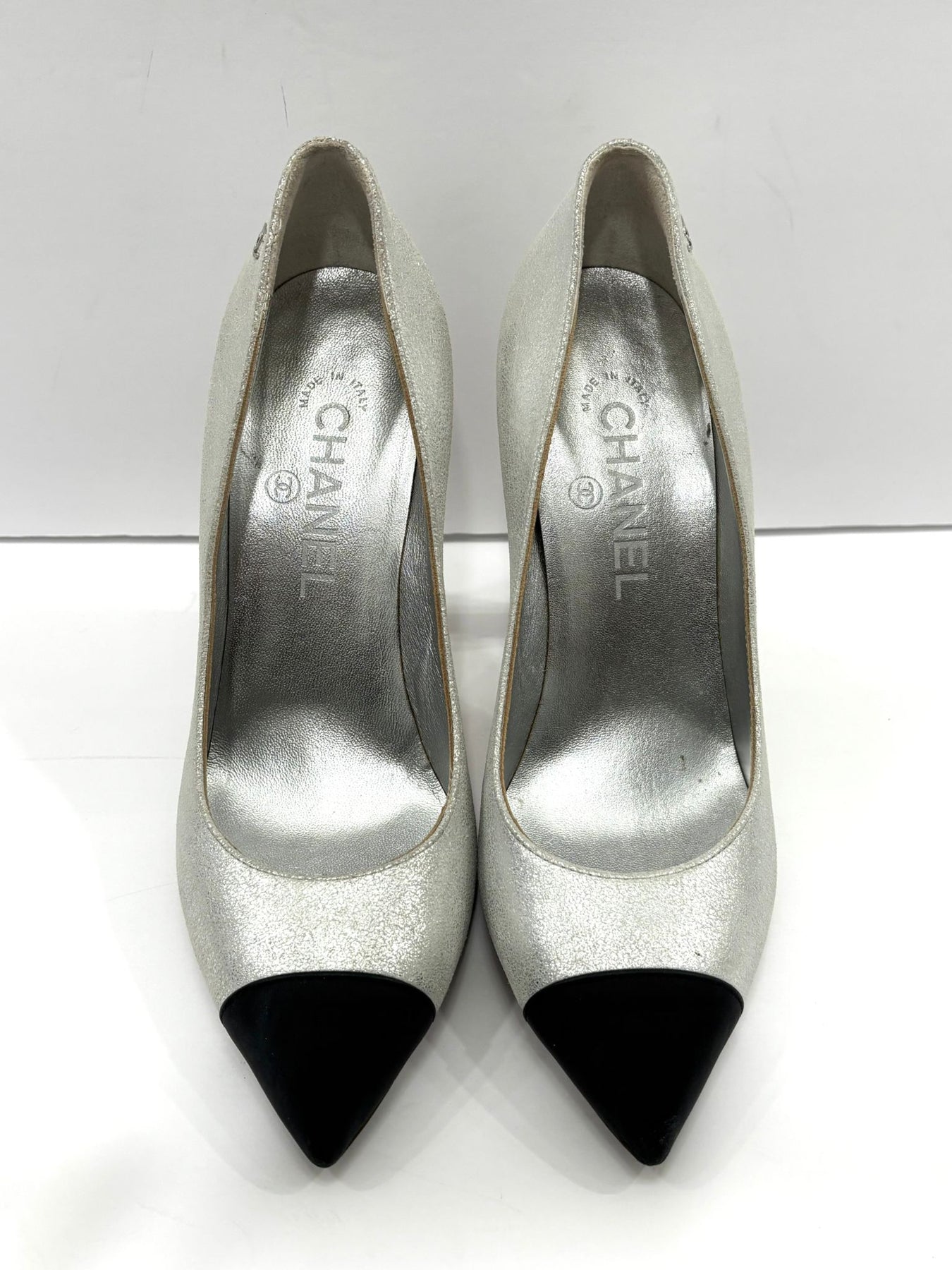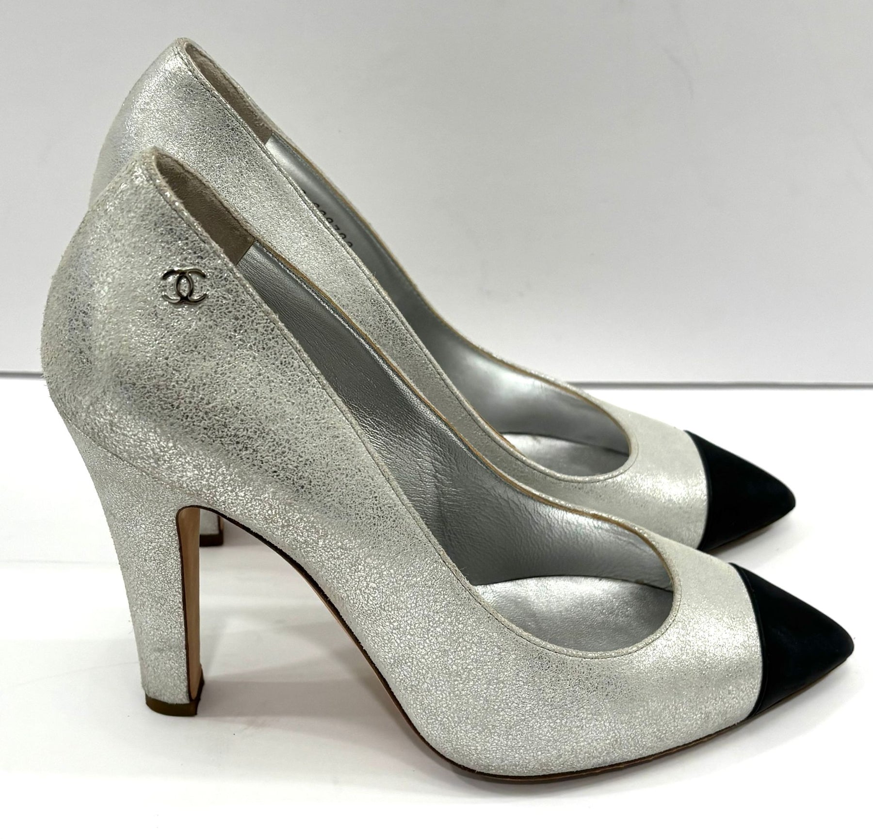 CHANEL METALLIC SILVER CC CAP TOE PUMPS