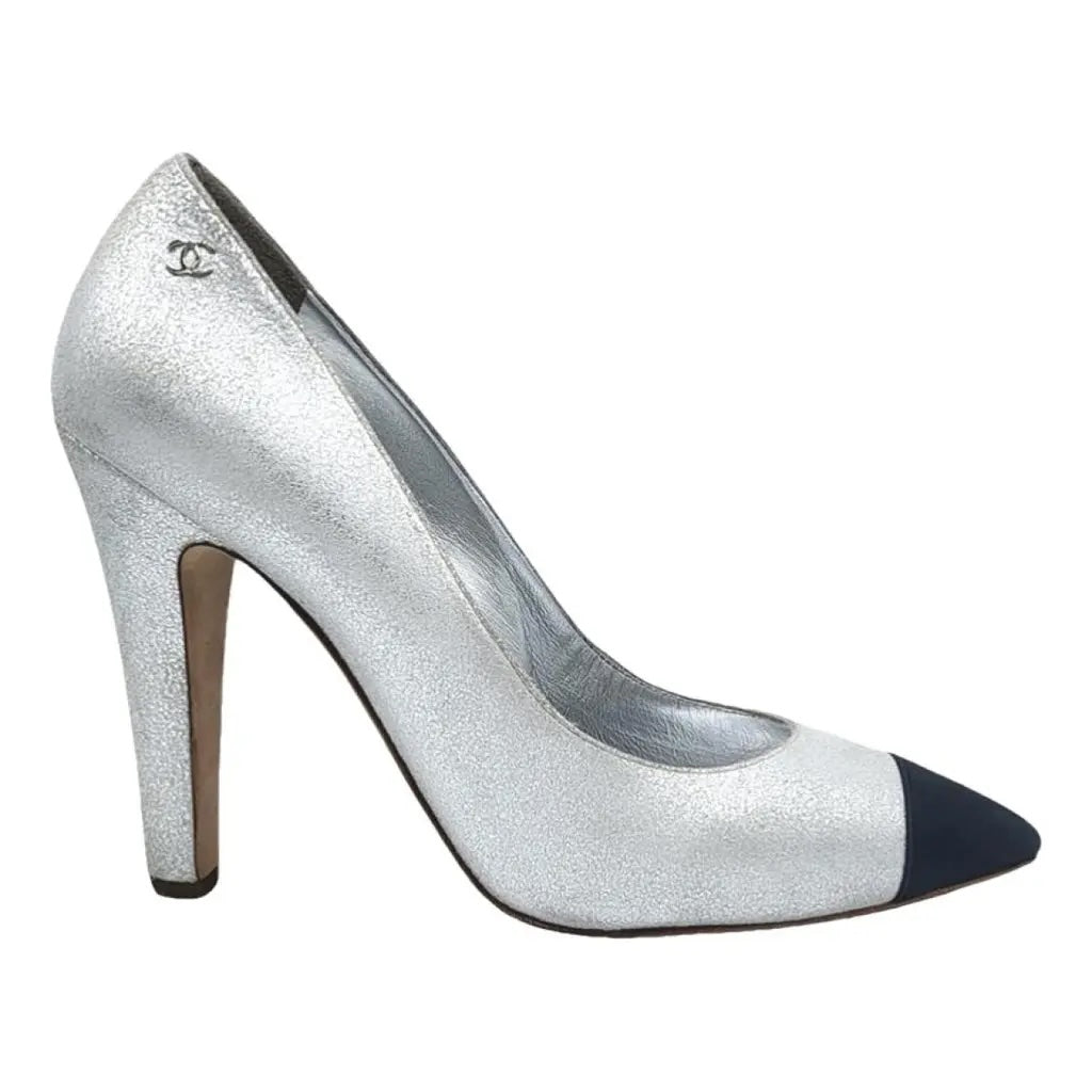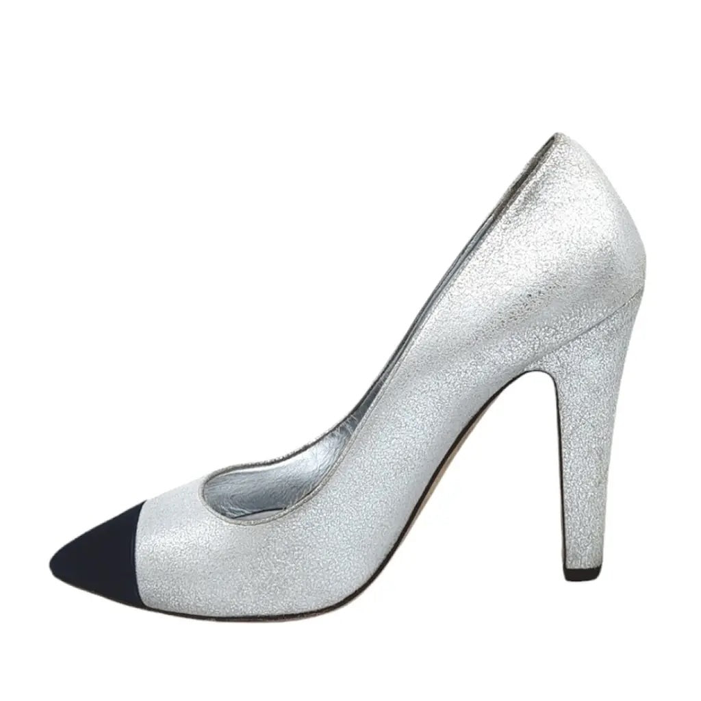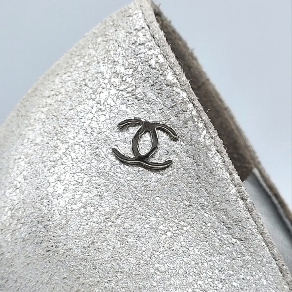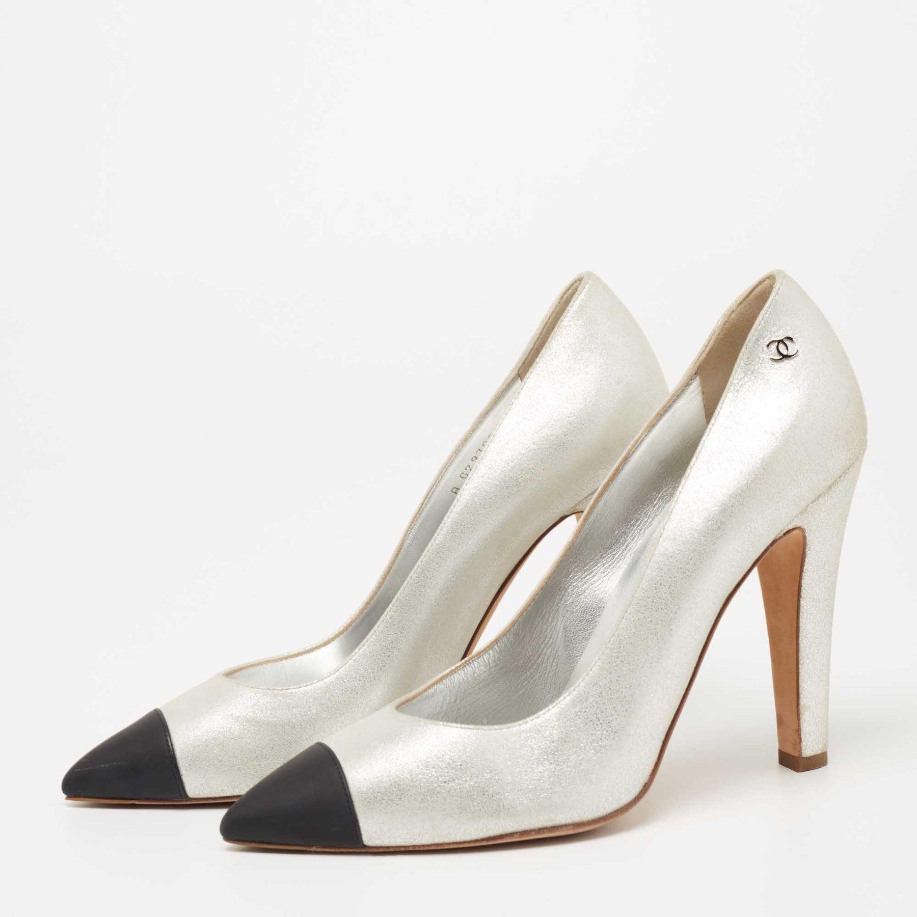 CHANEL METALLIC SILVER CC CAP TOE PUMPS