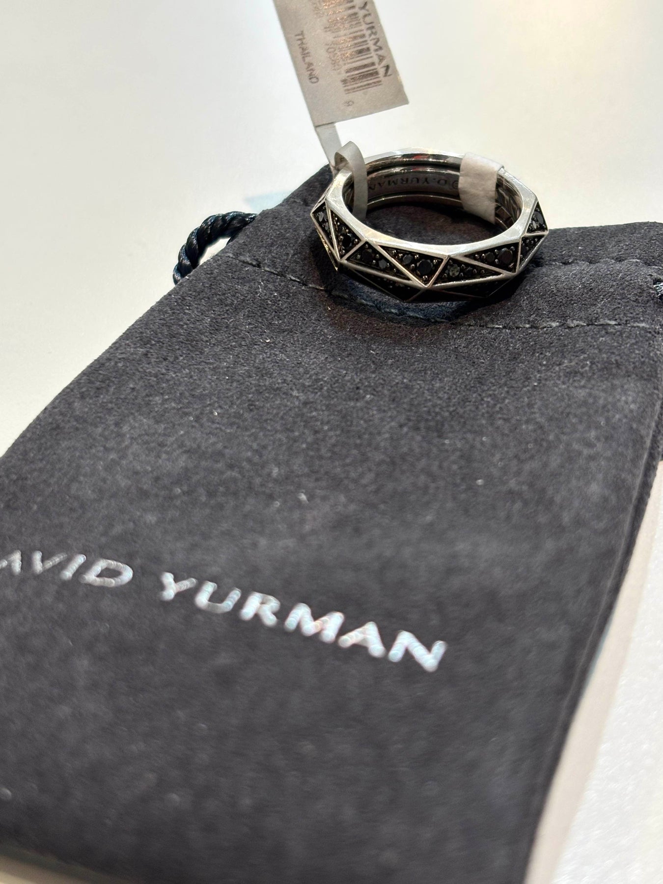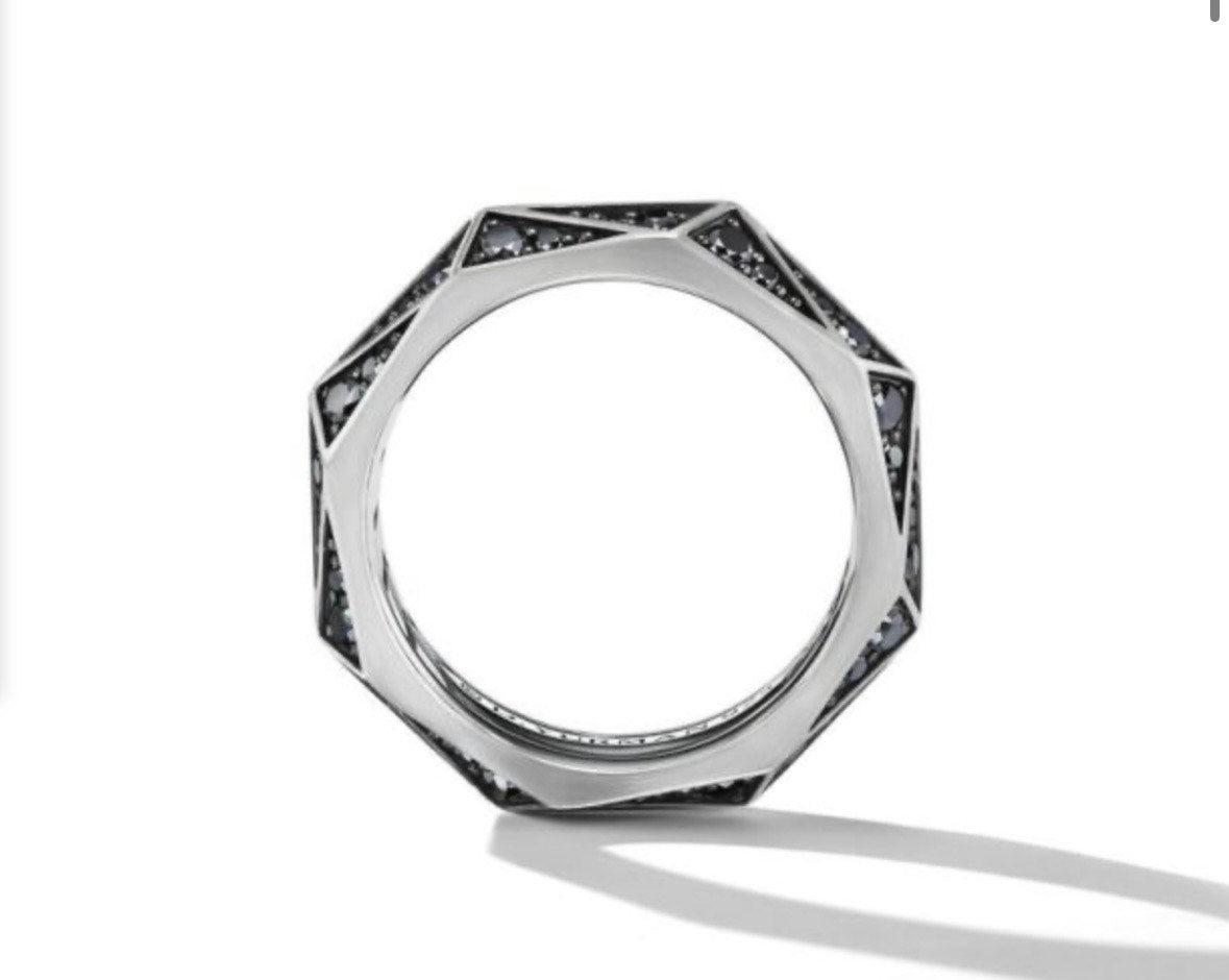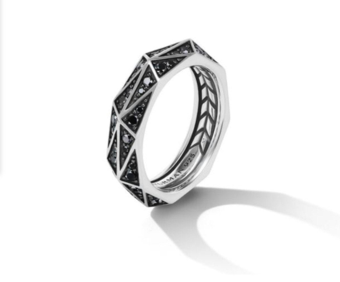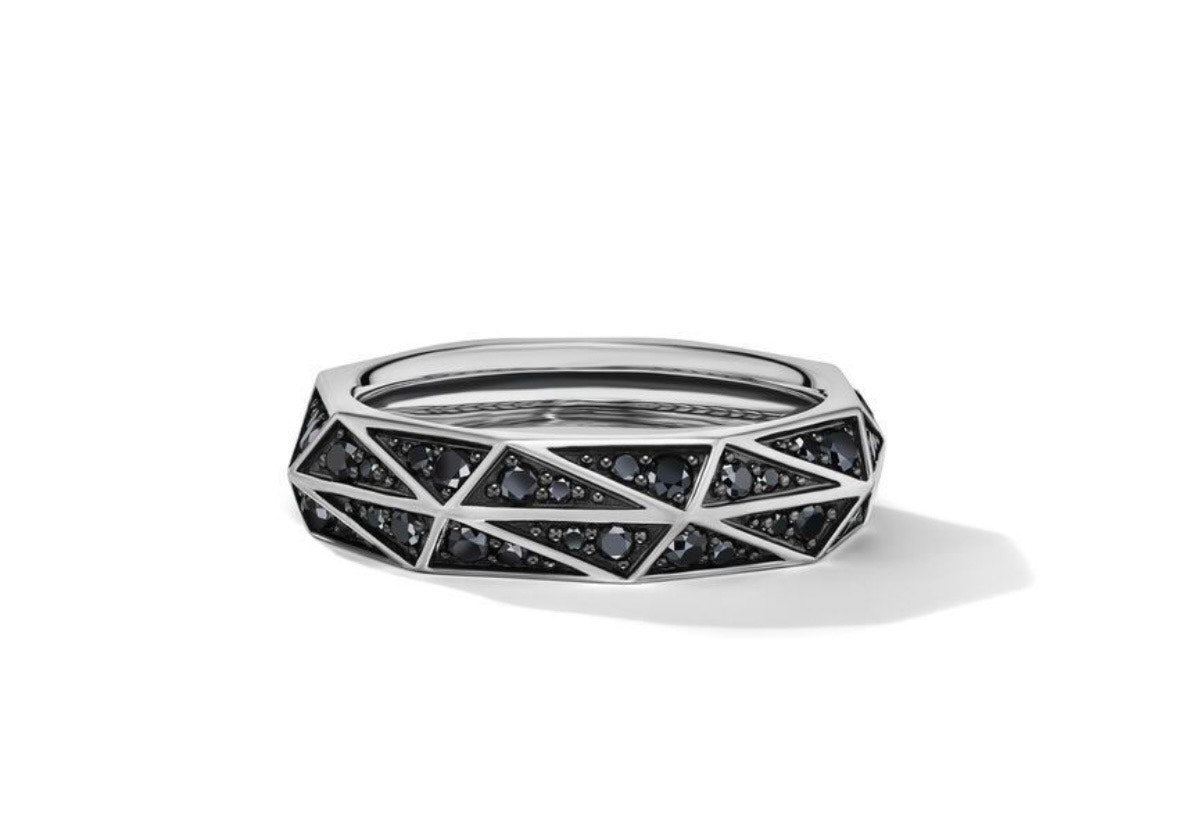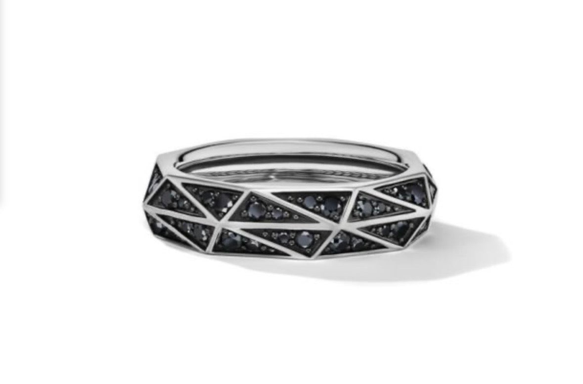 Bold, sculptural, and undeniably modern—this David Yurman ring fuses architectural design with luxurious detail. Crafted in sterling silver, the faceted torqued silhouette catches the light from every angle, creating dynamic reflections and depth. A stripe of pavé-set black diamonds adds dramatic contrast and understated elegance.