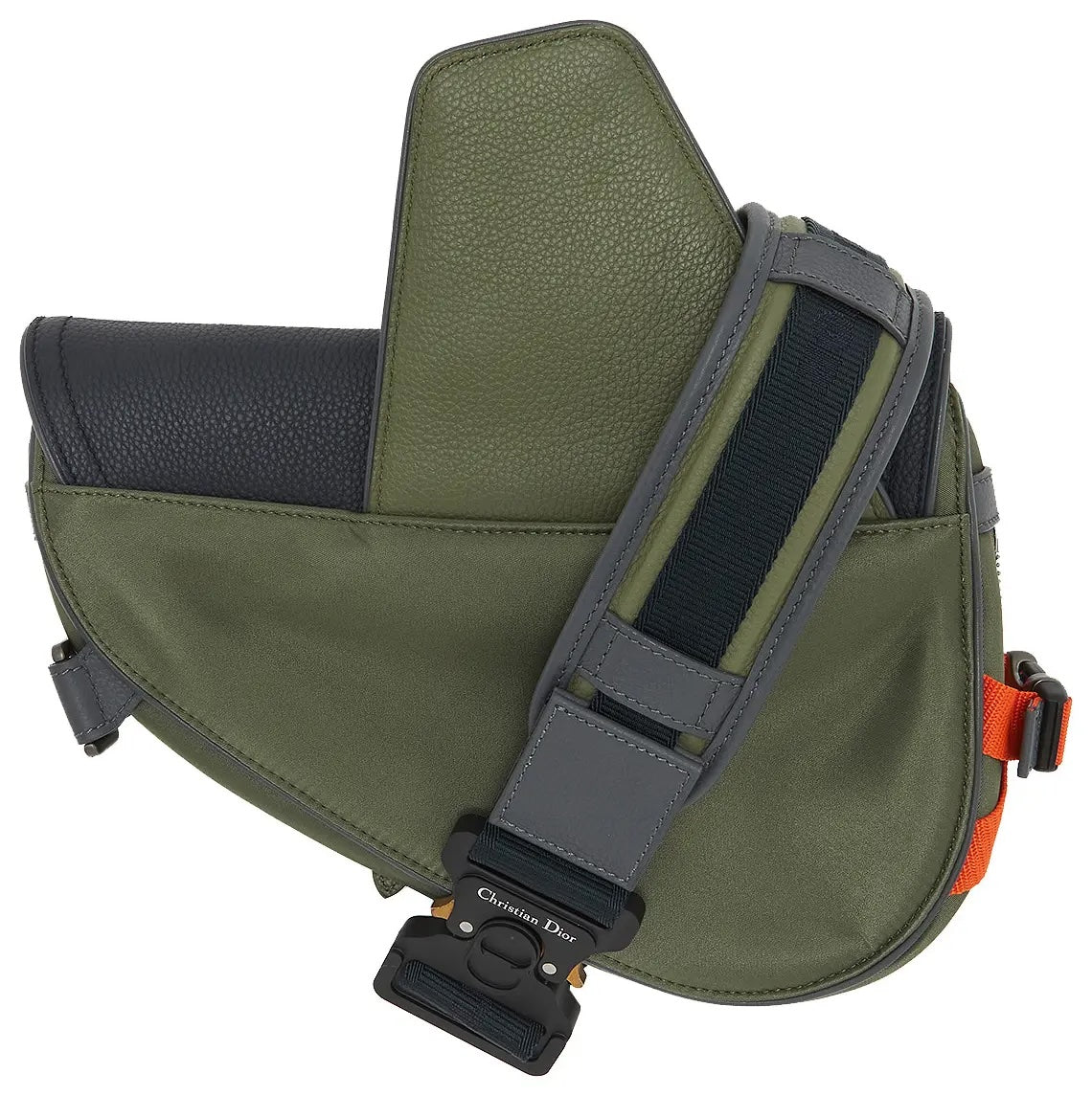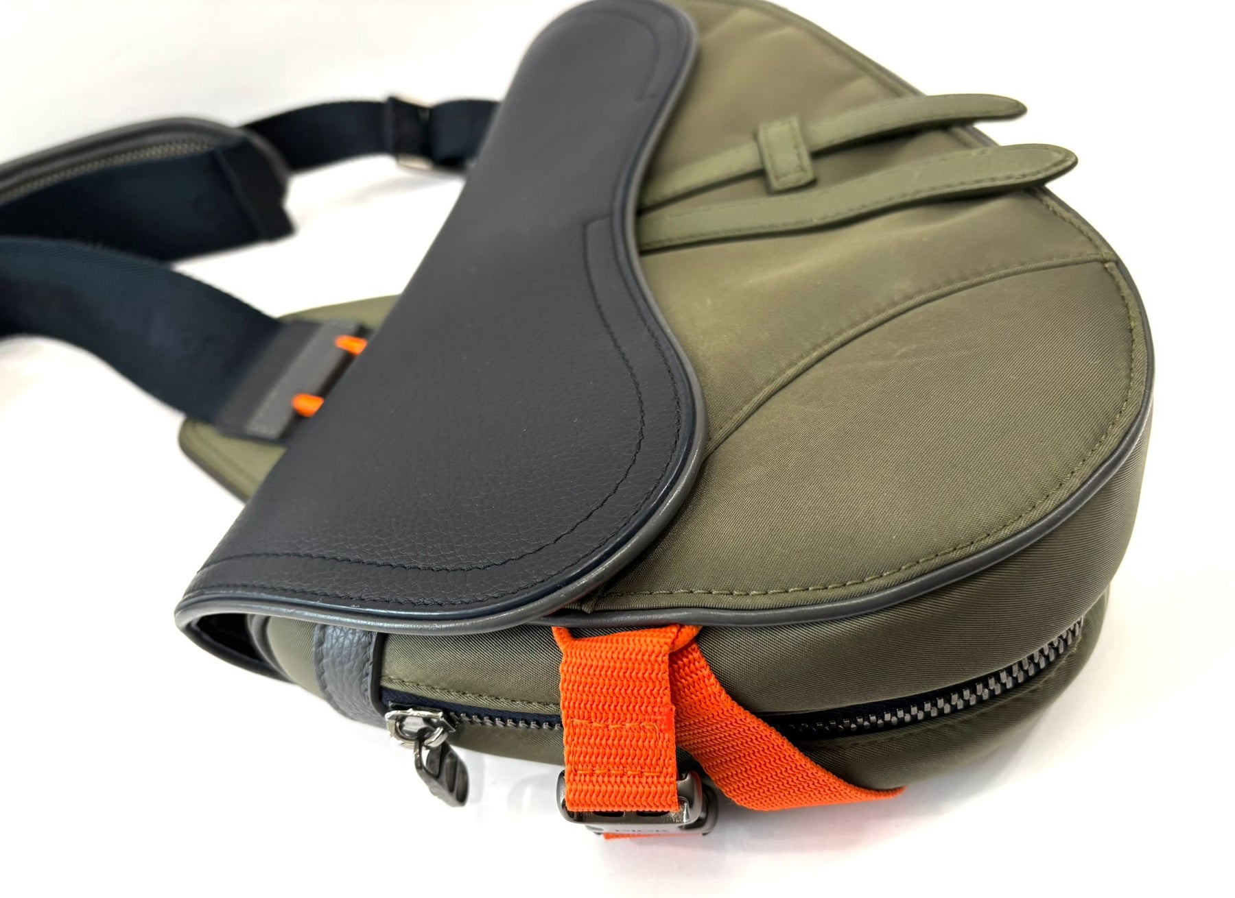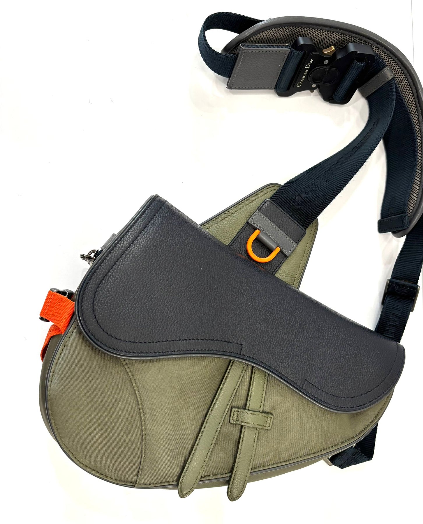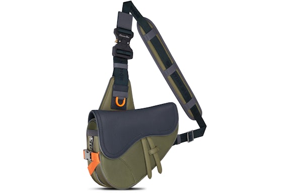 A Rare and Highly sought-after collaboration, the Dior x Sacai Saddle Bag merges the iconic silhouette of Dior’s classic Saddle design with Sacai’s utilitarian, hybrid aesthetic. Crafted in premium calfskin with contrasting textures and functional detailing, this limited-edition piece is both a collector’s item and a versatile luxury accessory. A bold combination of navy, olive, and orange accents creates a modern, elevated streetwear-meets-couture look.