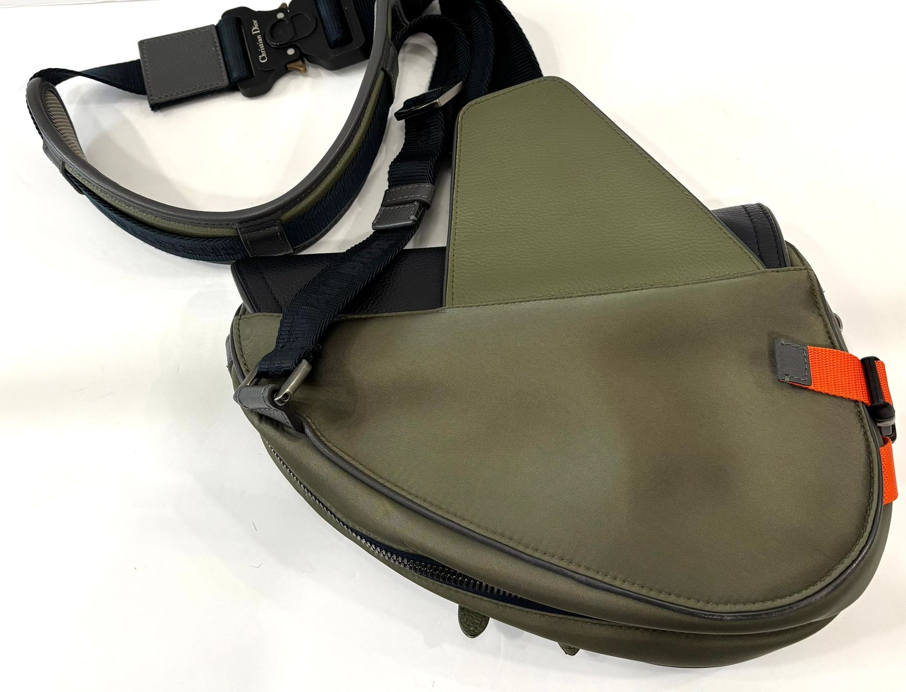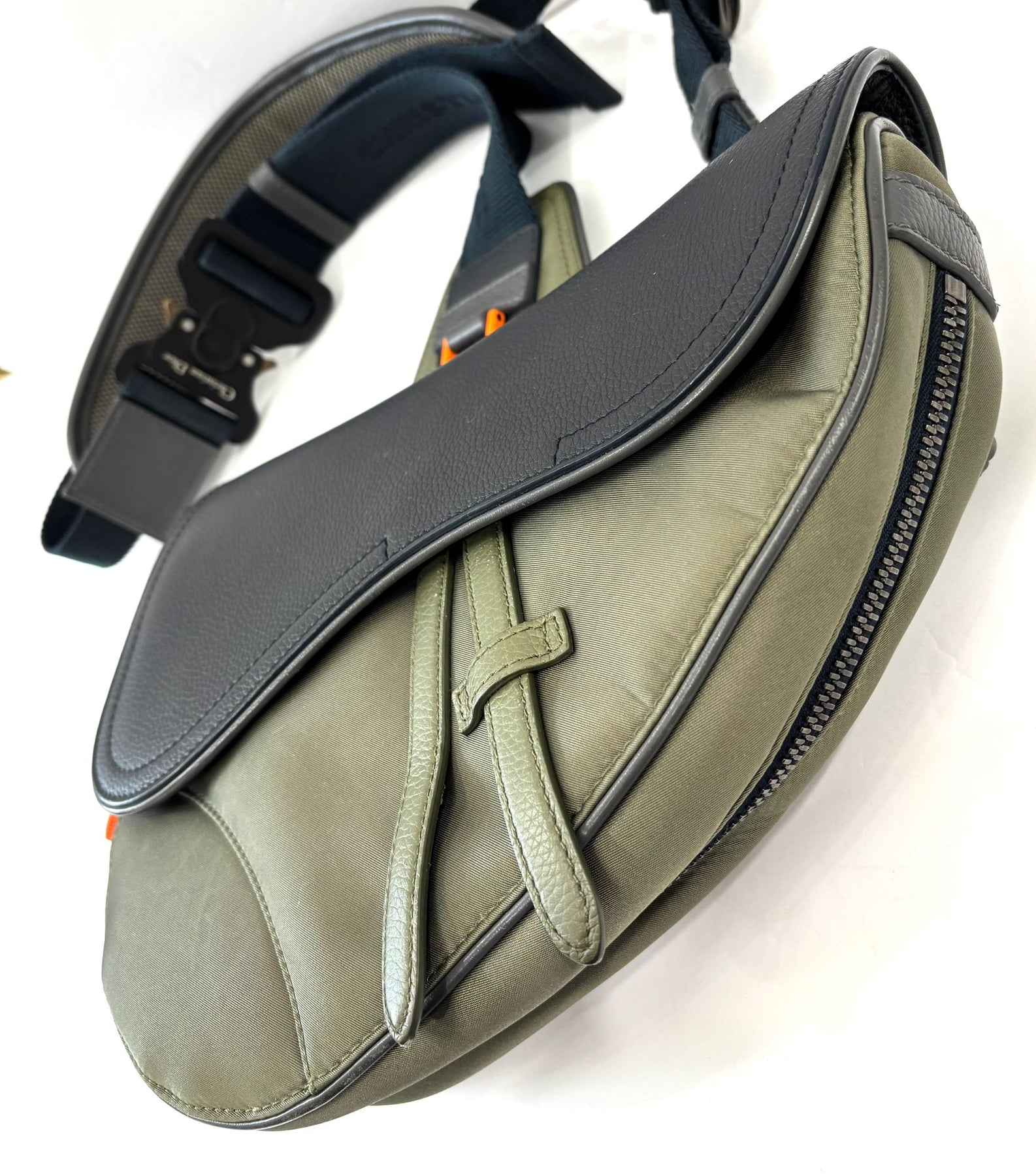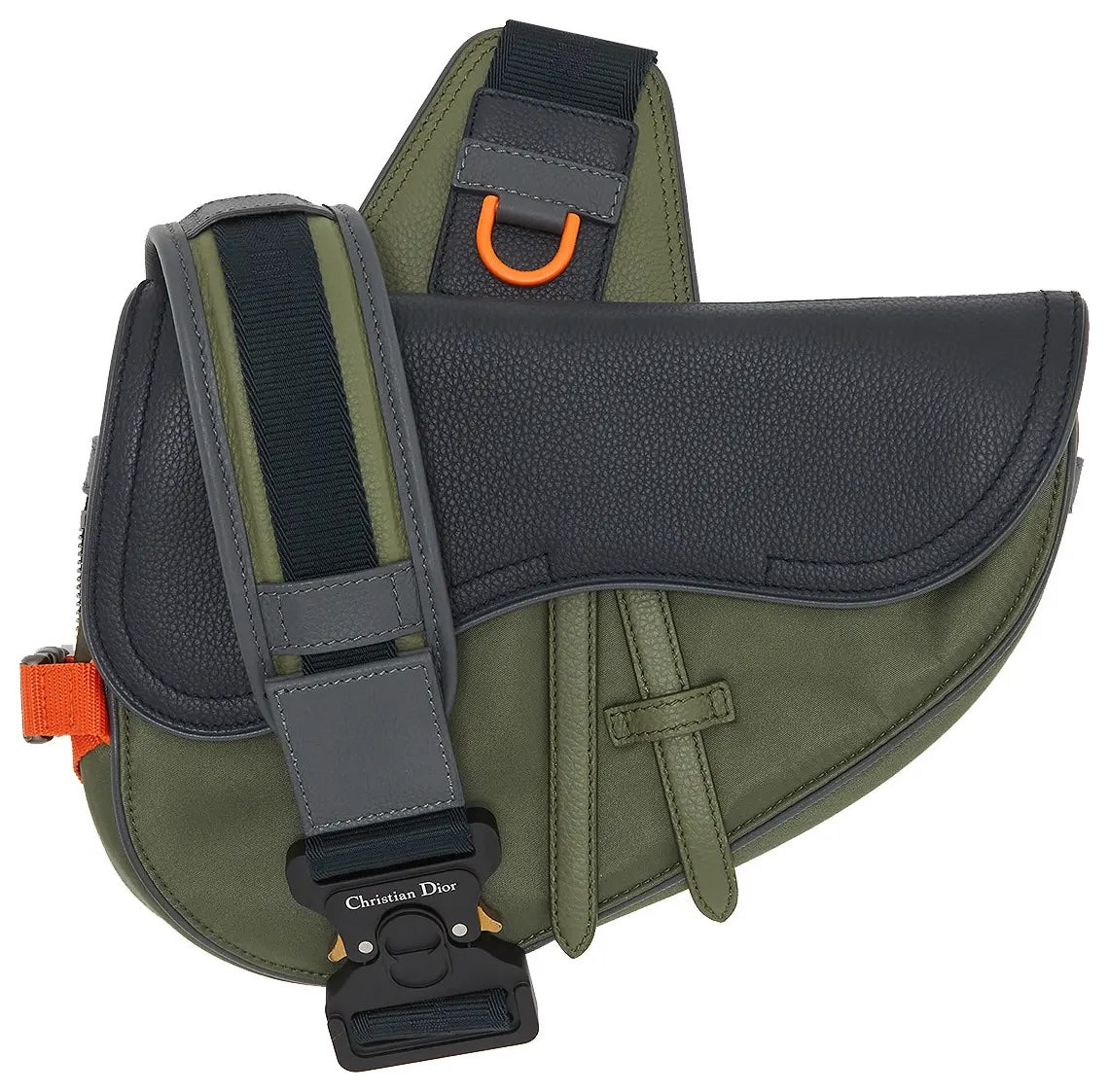 A Rare and Highly sought-after collaboration, the Dior x Sacai Saddle Bag merges the iconic silhouette of Dior’s classic Saddle design with Sacai’s utilitarian, hybrid aesthetic. Crafted in premium calfskin with contrasting textures and functional detailing, this limited-edition piece is both a collector’s item and a versatile luxury accessory. A bold combination of navy, olive, and orange accents creates a modern, elevated streetwear-meets-couture look.