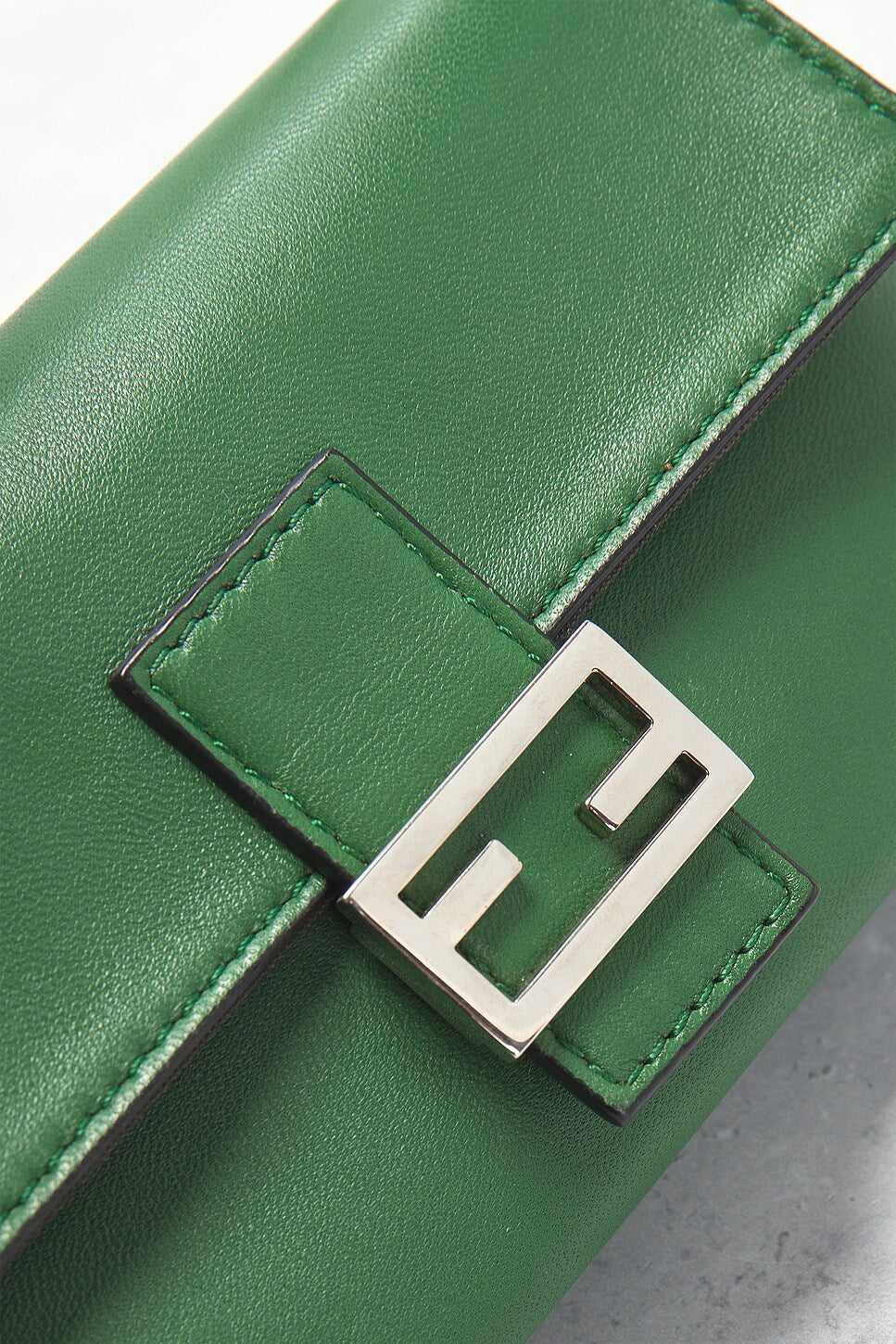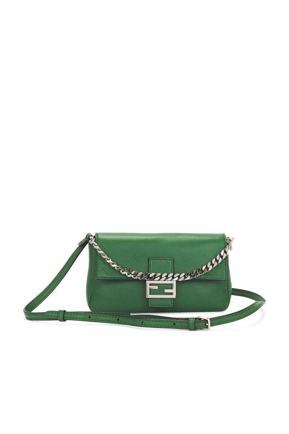 Small in size, big on style — the Fendi Nappa Micro Baguette is a bold statement in a compact silhouette. Crafted from ultra-soft nappa leather in a striking green hue, this mini version of the iconic Baguette bag brings playful elegance to any look.