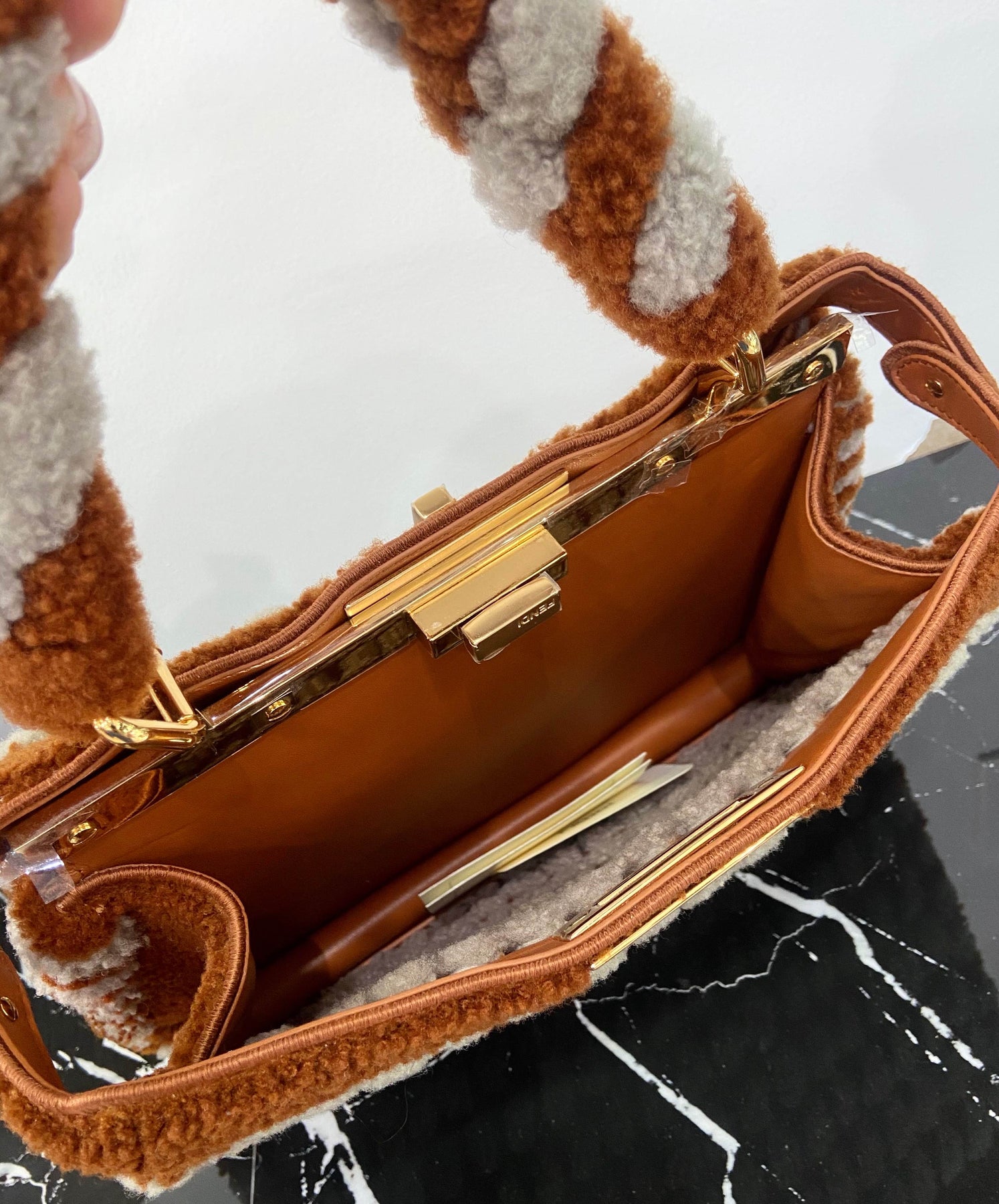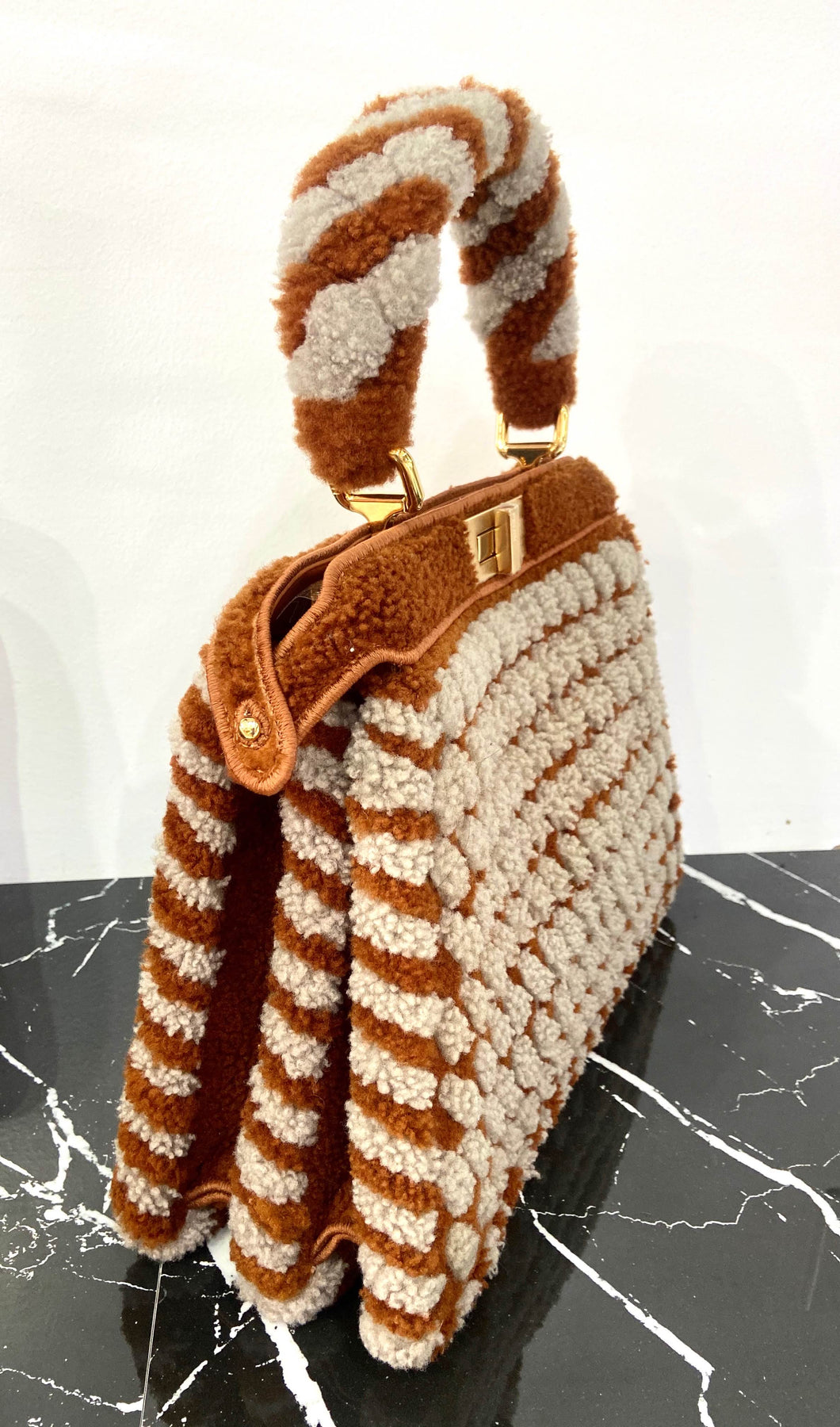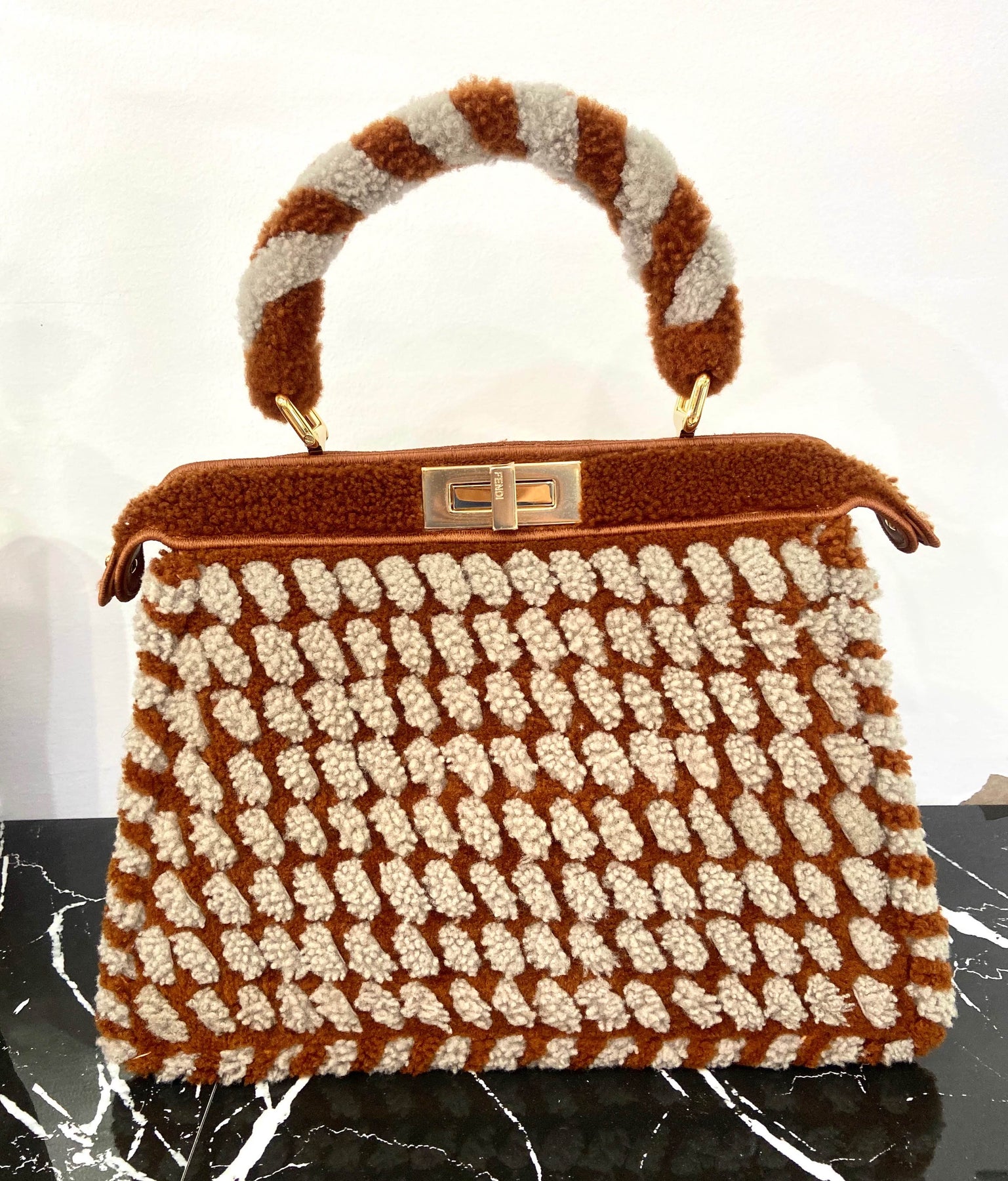 The Fendi Peekaboo Shearling Interlace Bag is a true collector’s piece—where artisanal detail meets timeless luxury.