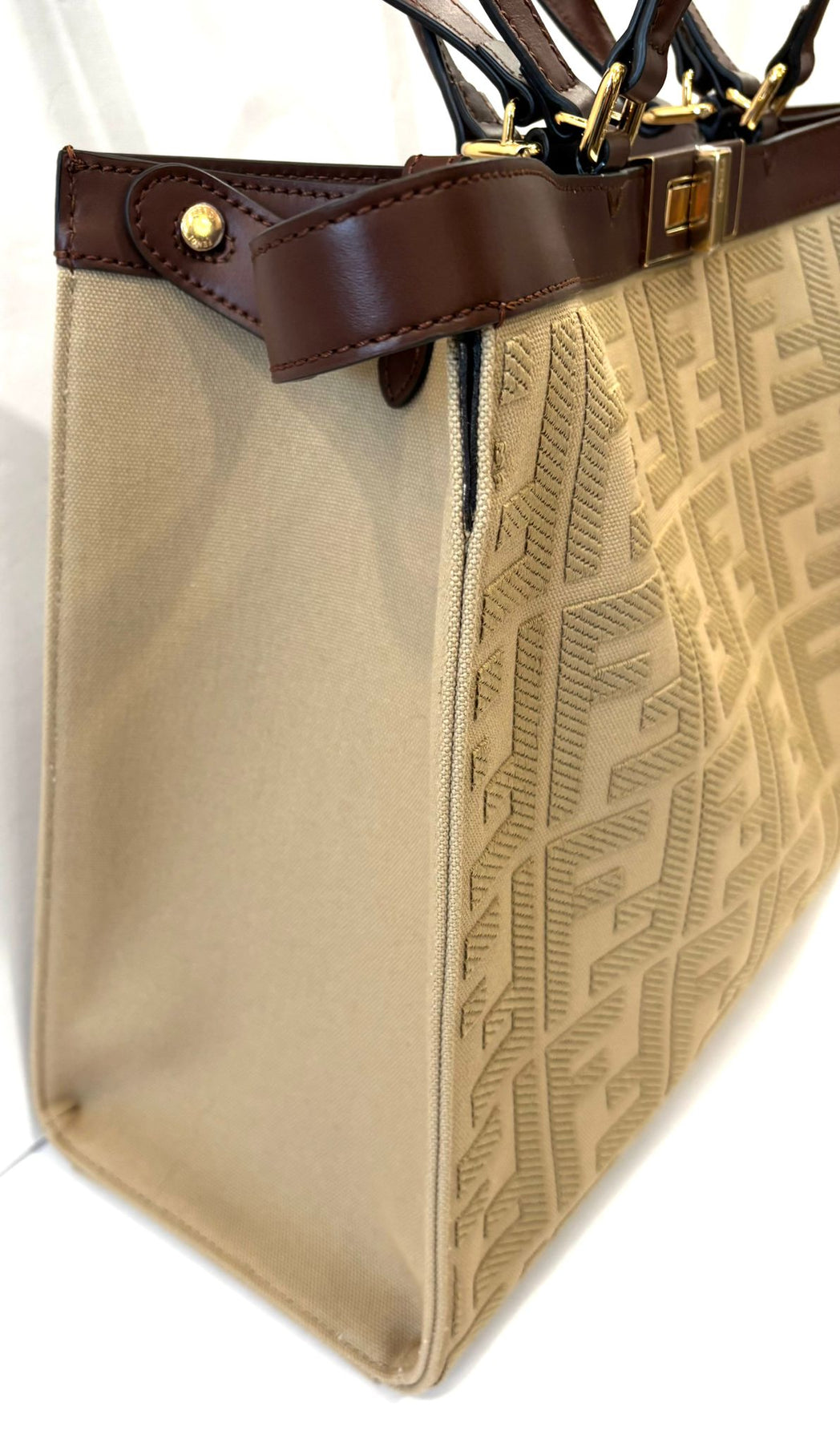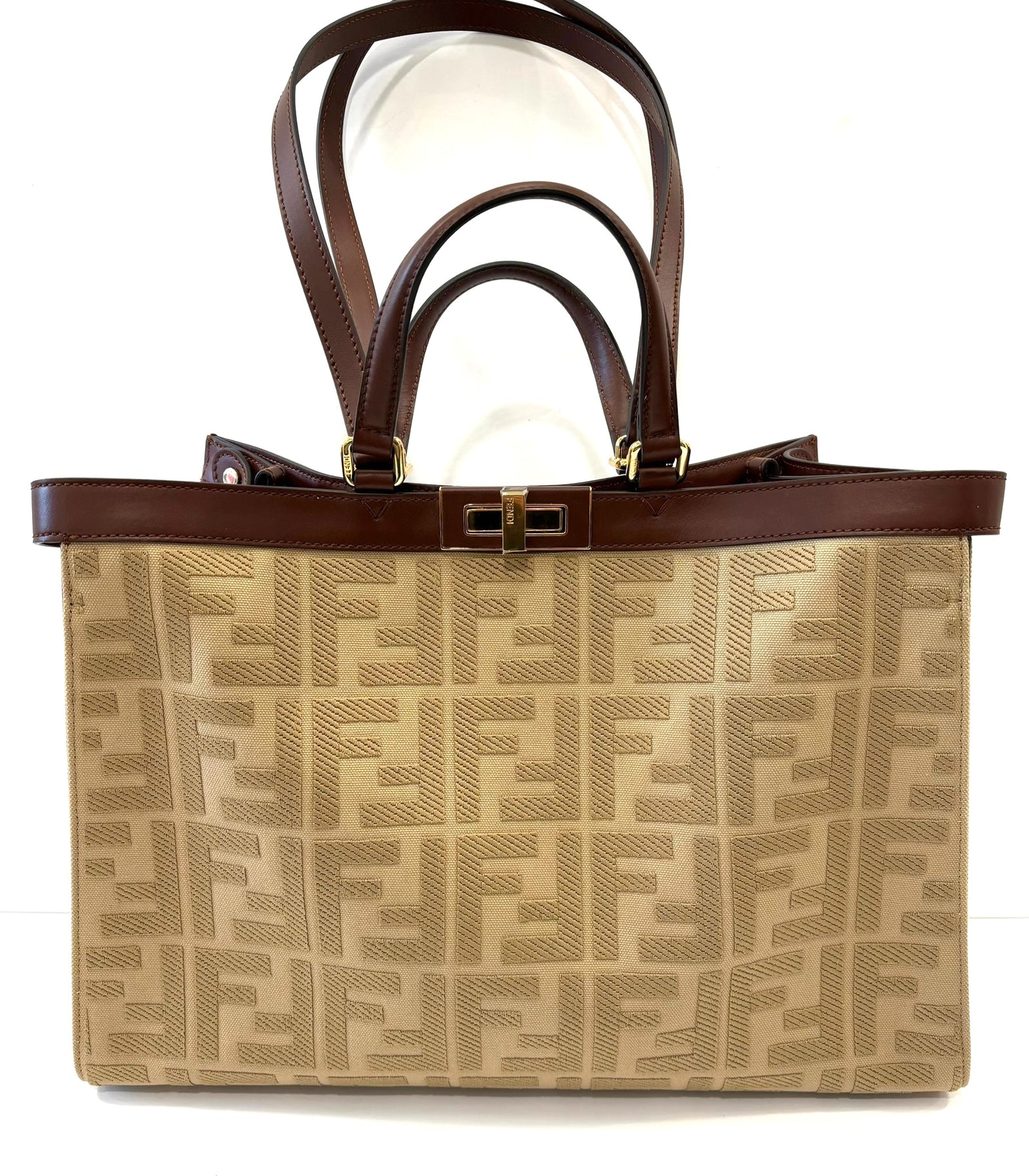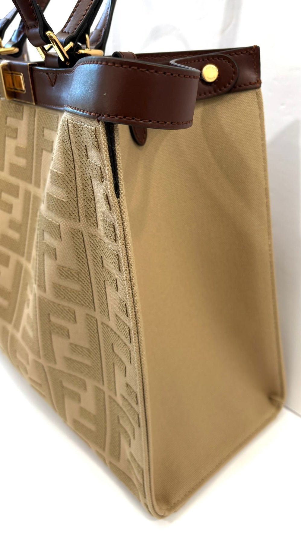 Elevate your Collection with this Stunning Fendi Peekaboo X-Lite Tote, crafted in beige Zucca canvas and paired with smooth brown leather trim. Lightweight yet beautifully structured, this iconic piece blends timeless luxury with effortless everyday functionality. The classic FF monogram pattern brings signature Fendi style, while the minimal interior keeps the bag easy to carry without added bulk.