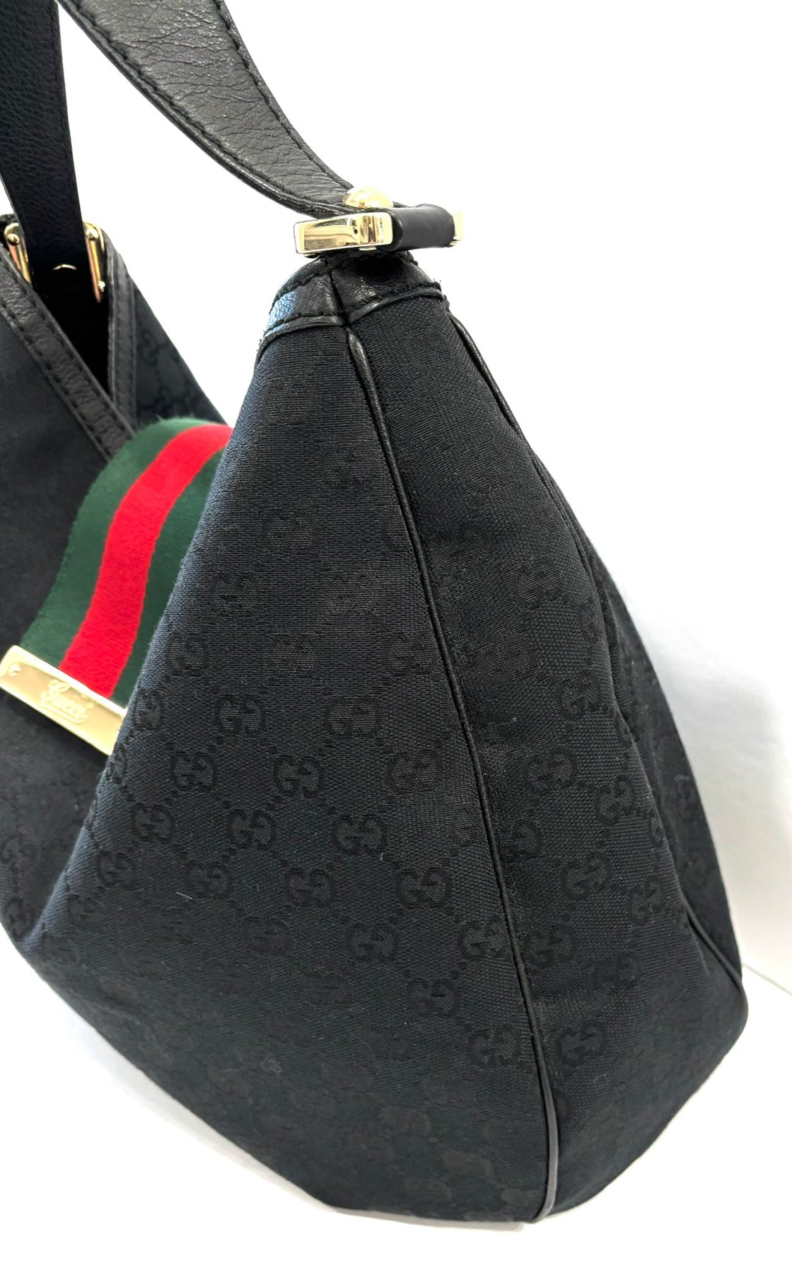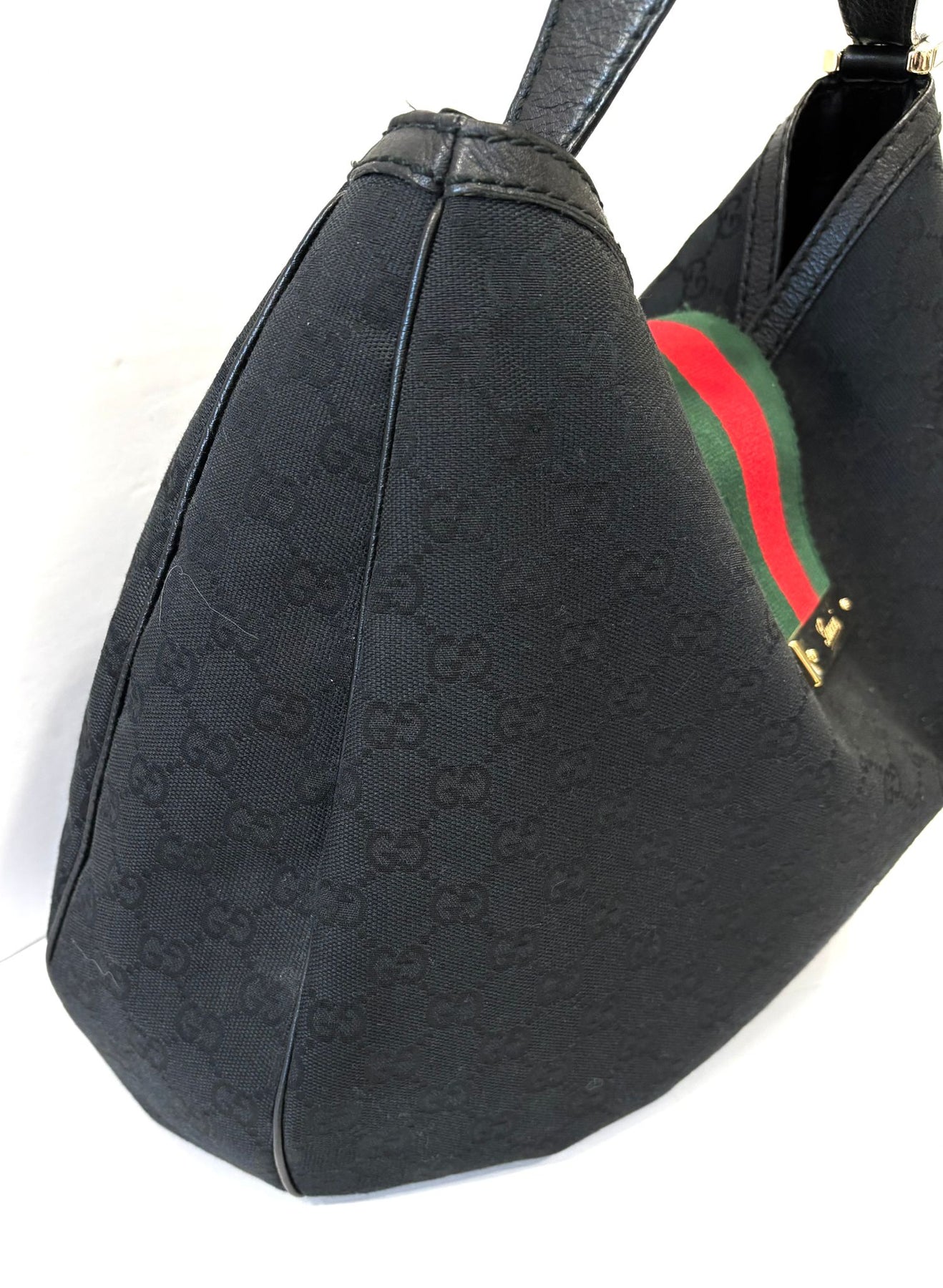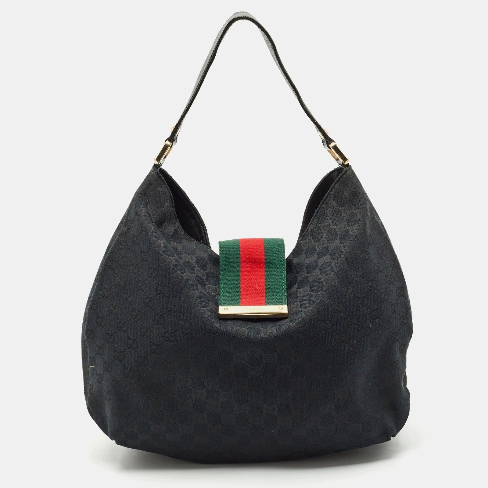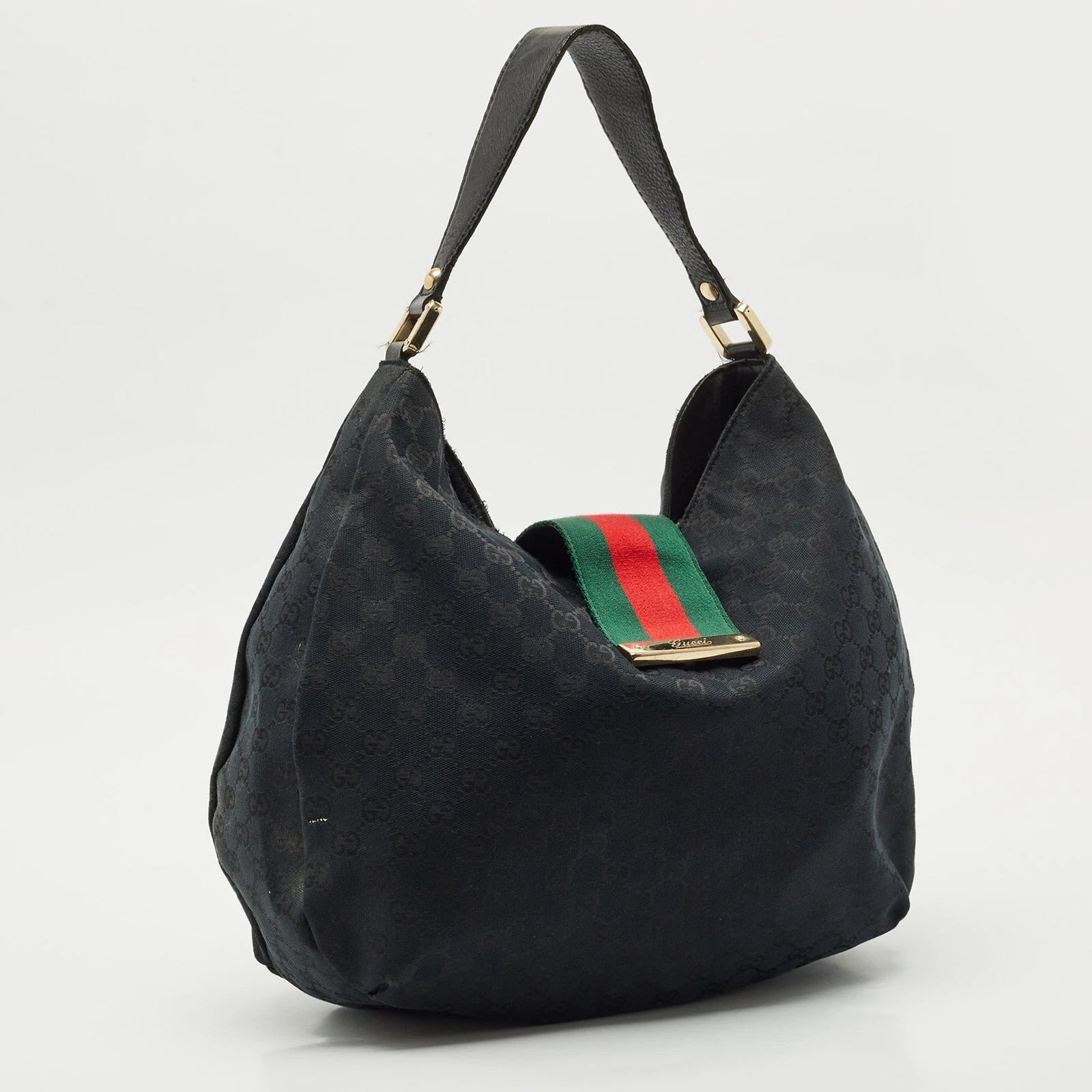 Effortlessly stylish and unmistakably Gucci, the Black GG Canvas & Leather Web Hobo Bag blends everyday functionality with signature luxury. Crafted from durable black GG Monogram canvas and accented with smooth black leather trim, this hobo silhouette offers a sleek, modern look that pairs seamlessly with any wardrobe.