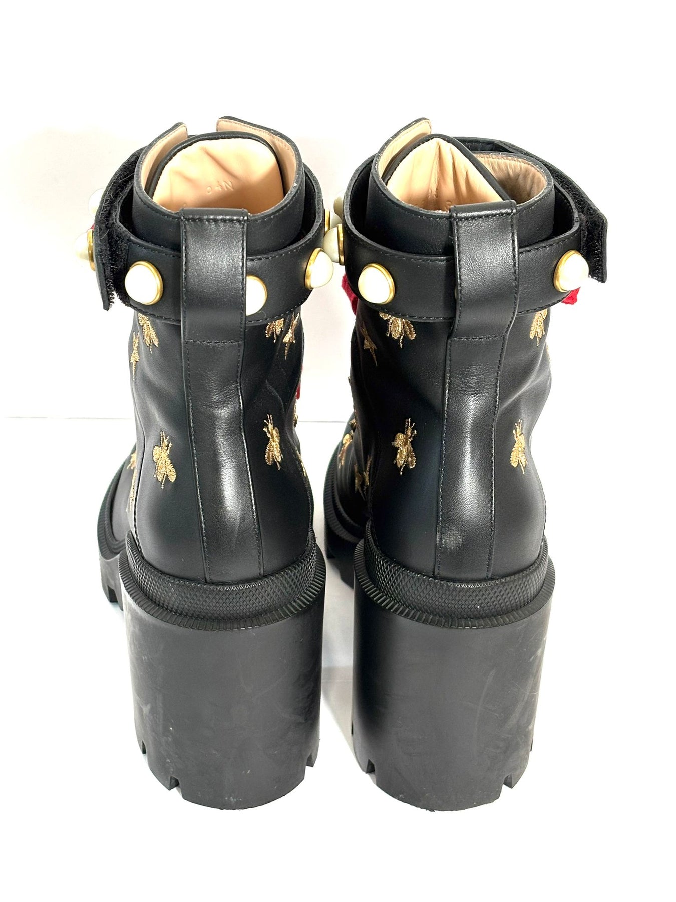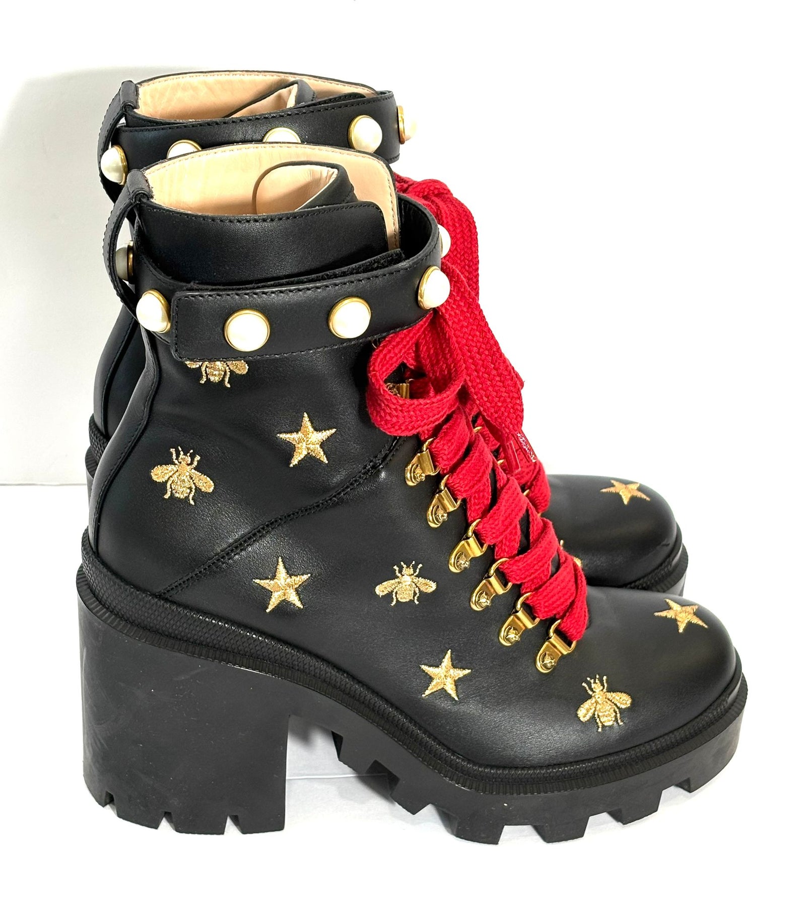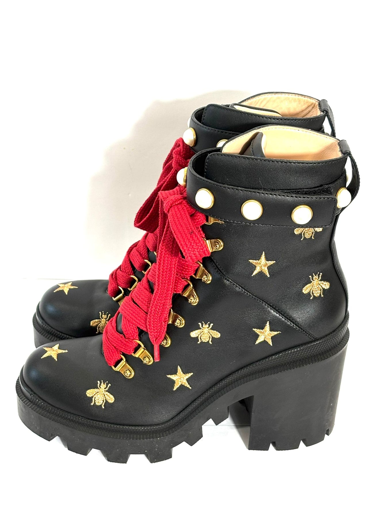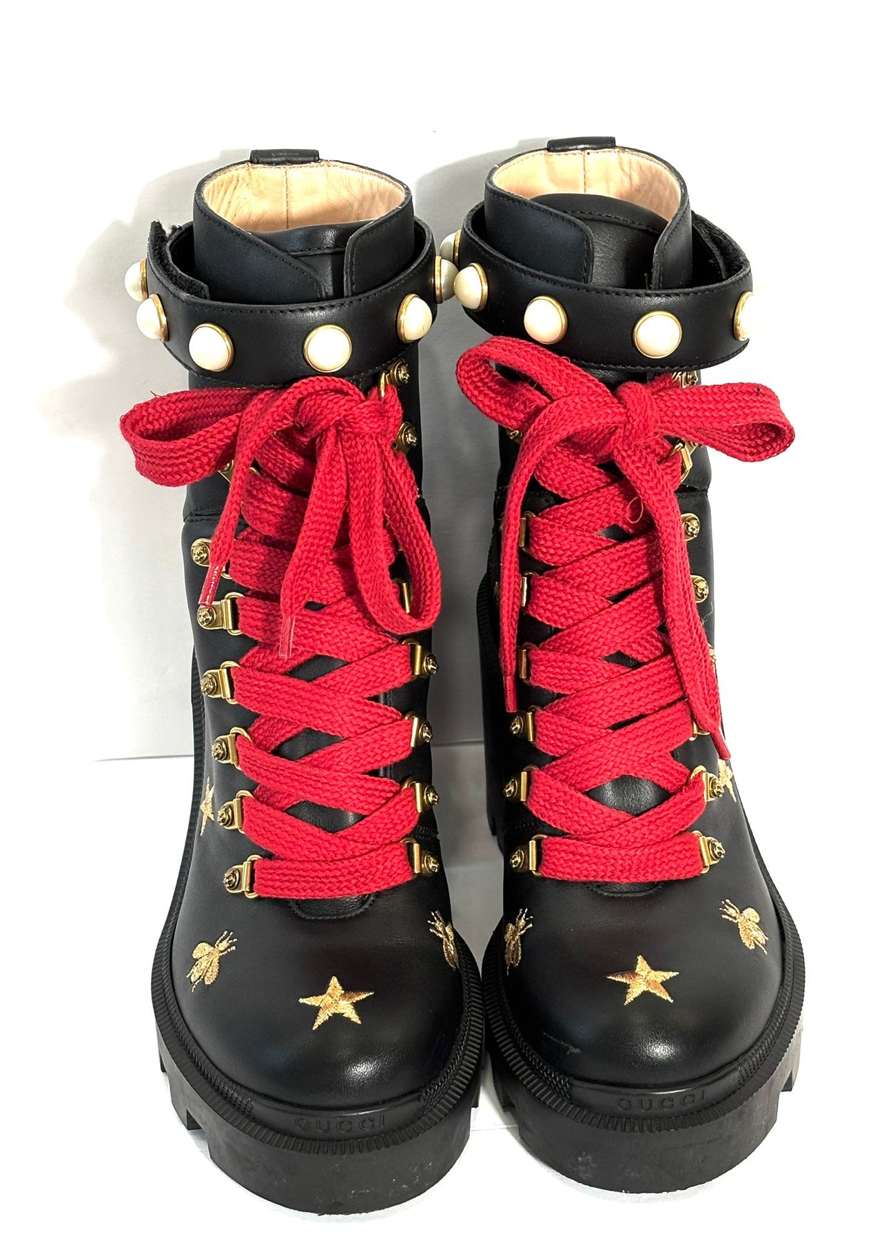GUCCI CALFSKIN EMBROIDERED LACE UP COMBAT BOOTS