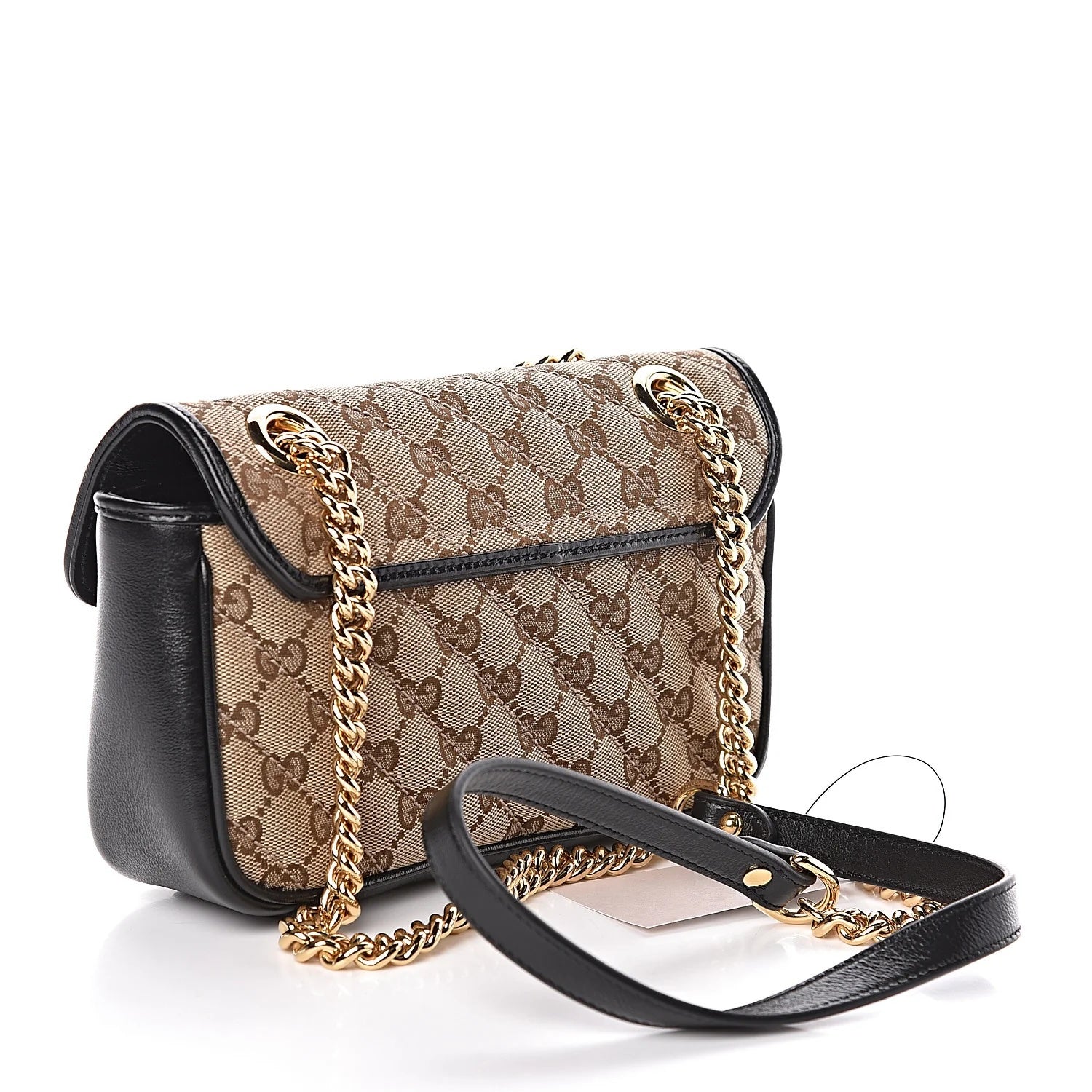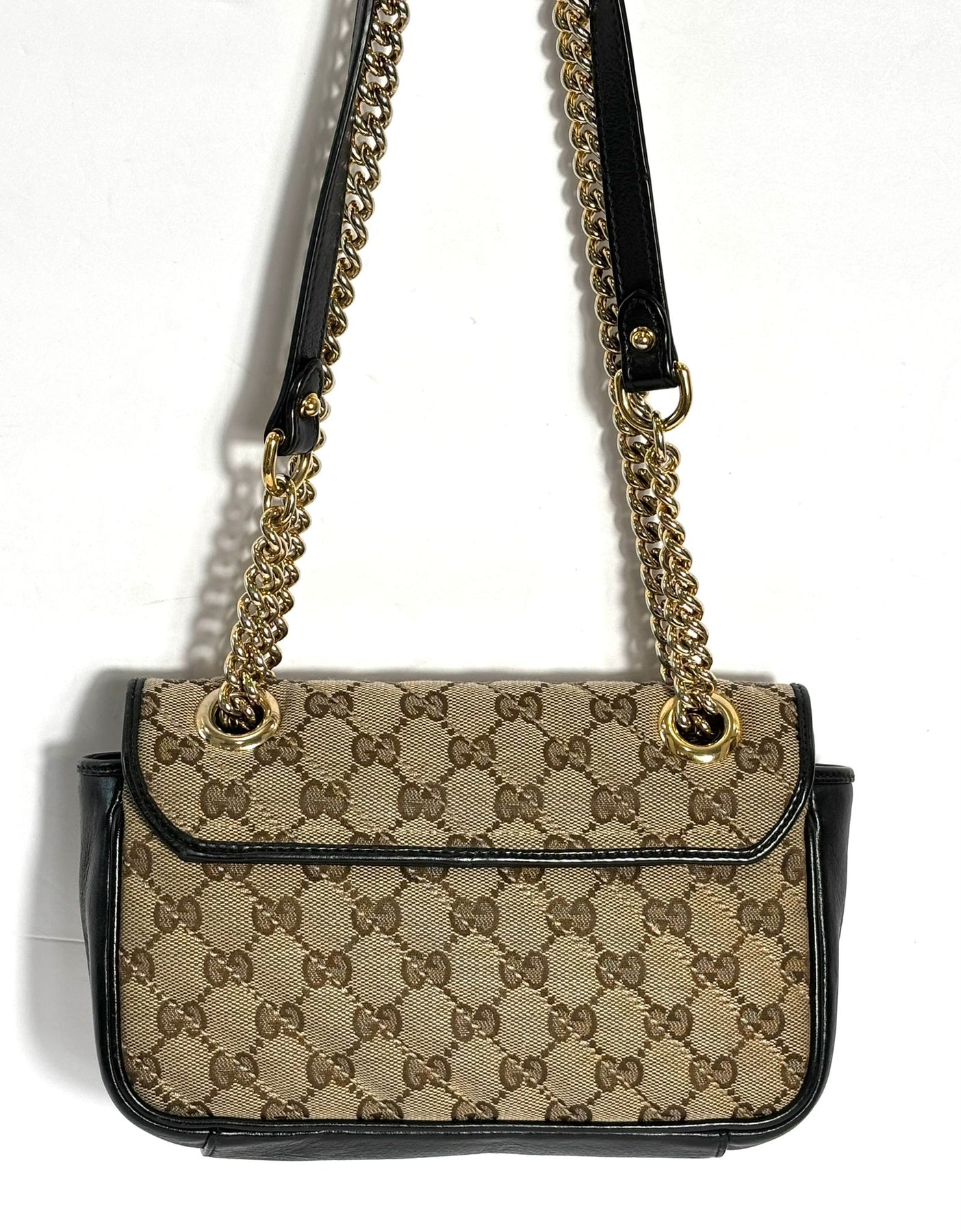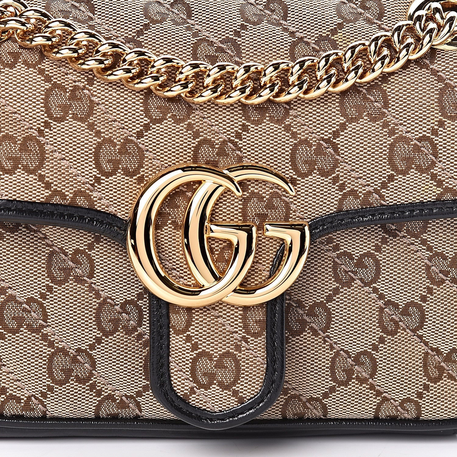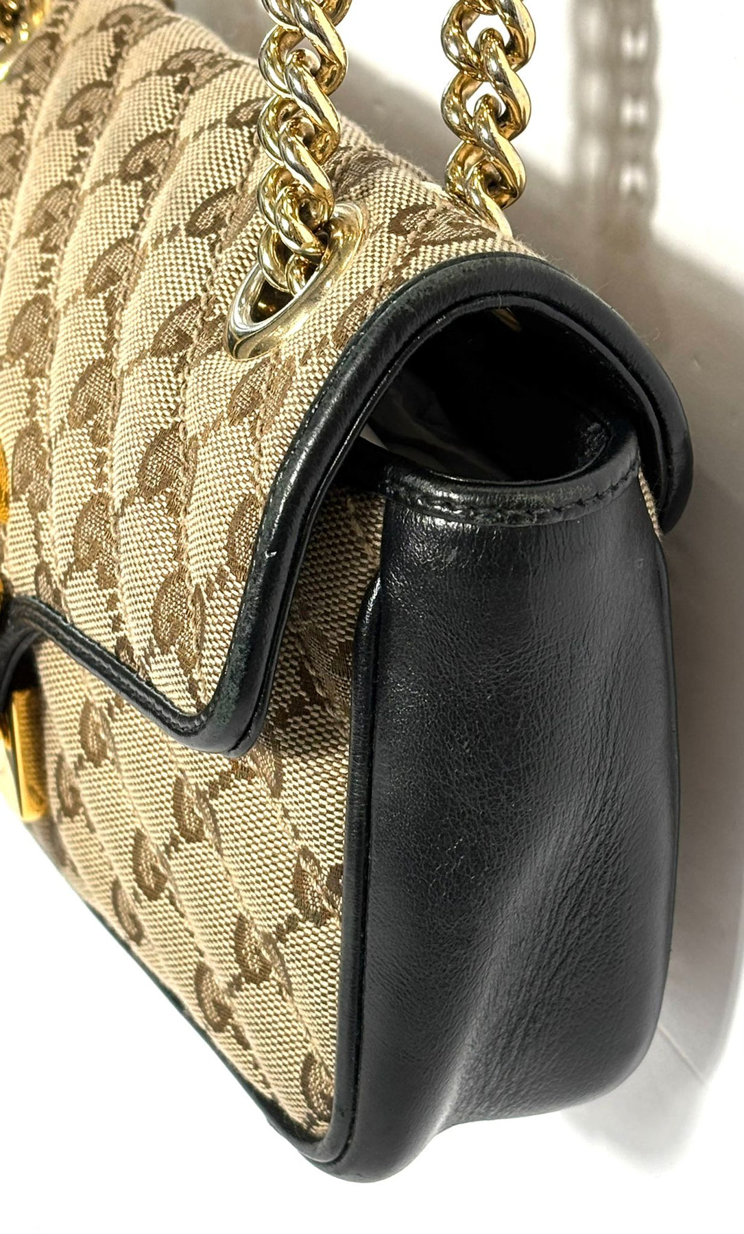 Gucci Mini Marmont Shoulder bag in intricately quilted Beige GG Monogram canvas, framed by black leather trim and finished with Gold-tone hardware. The front features the signature interlocking GG. A chain-and-leather shoulder strap with a leather pad offers comfortable wear. Flap opens to a beige microfiber interior with a patch pocket.