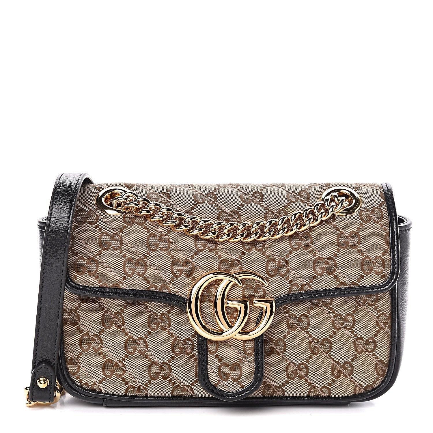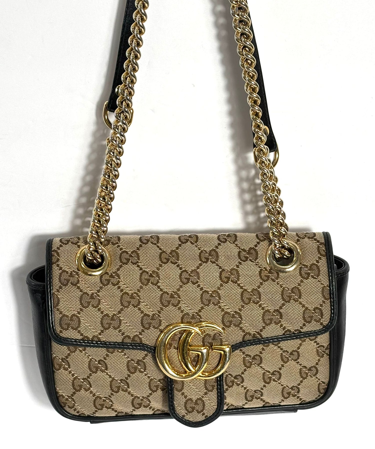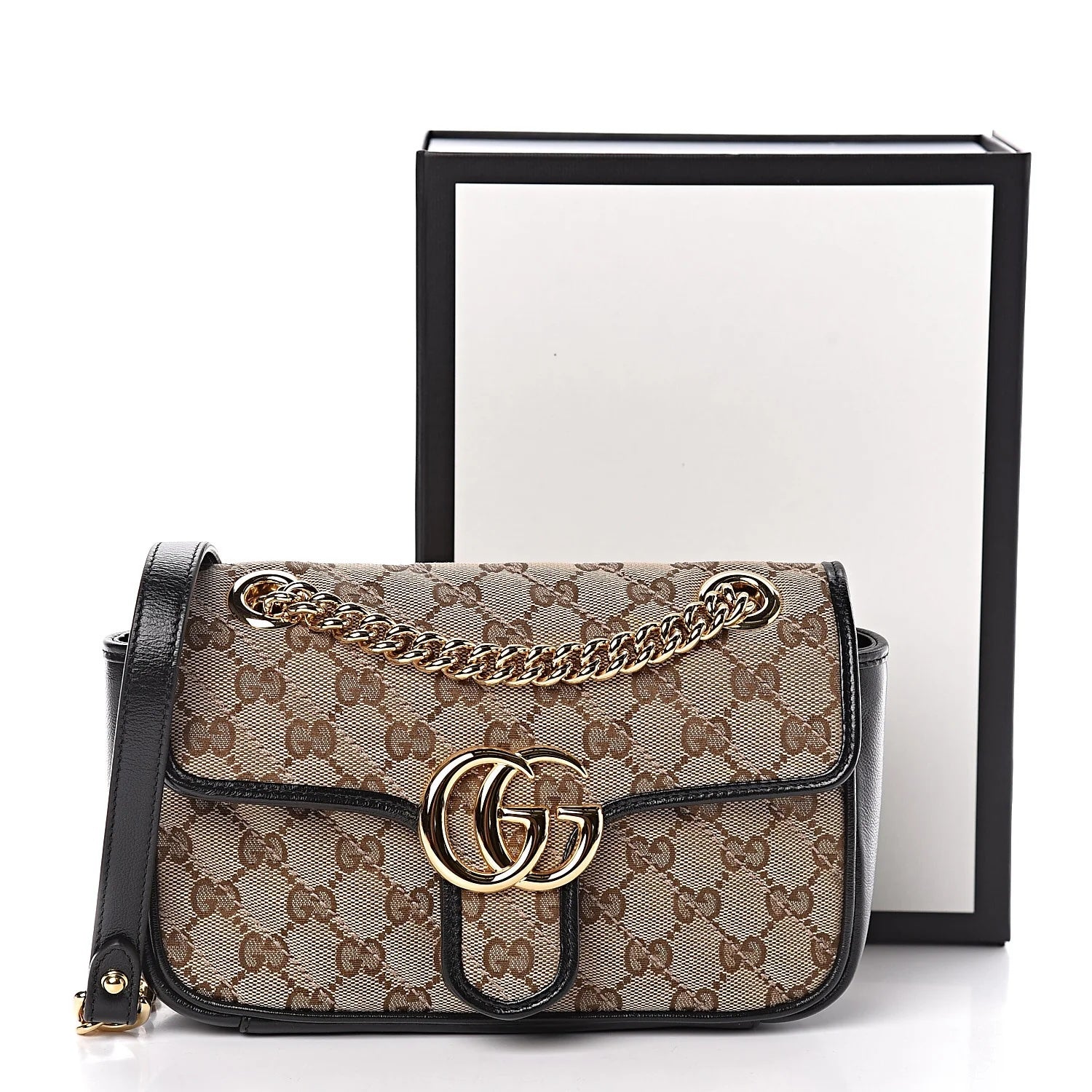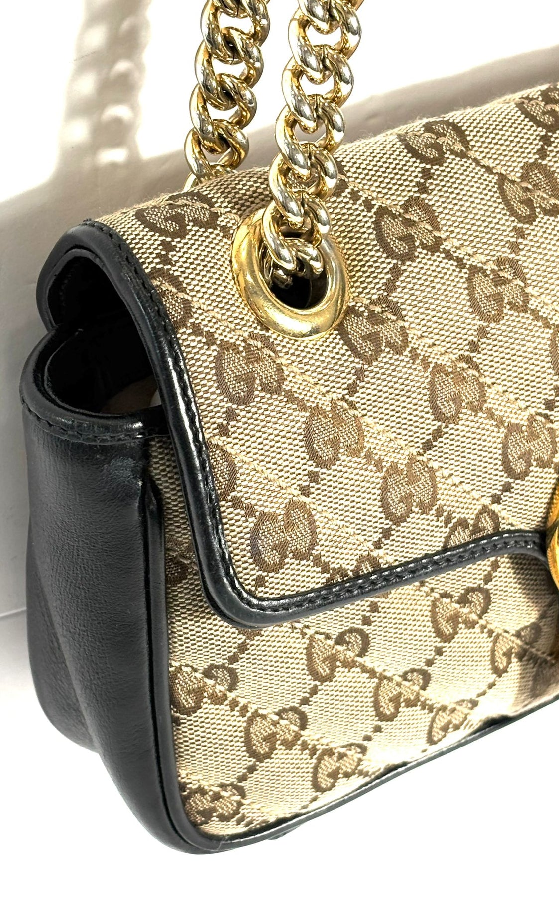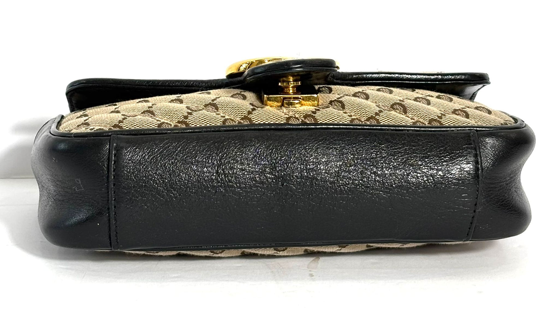 Gucci Mini Marmont Shoulder bag in intricately quilted Beige GG Monogram canvas, framed by black leather trim and finished with Gold-tone hardware. The front features the signature interlocking GG. A chain-and-leather shoulder strap with a leather pad offers comfortable wear. Flap opens to a beige microfiber interior with a patch pocket.