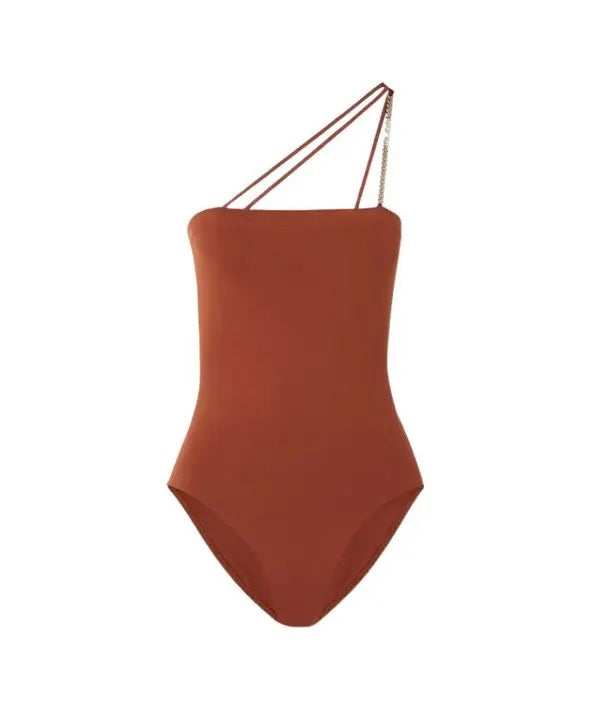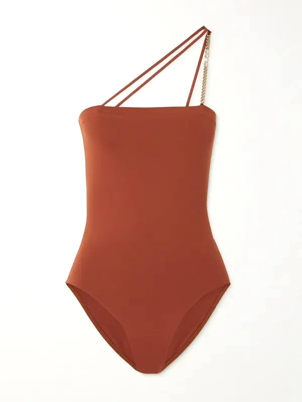 This Gucci One-Shoulder Chain Swimsuit combines sleek minimalism with a striking, modern edge. Crafted in a rich rust-brown hue, the design features a clean, streamlined silhouette that flatters the body with smooth, sculpting fabric.