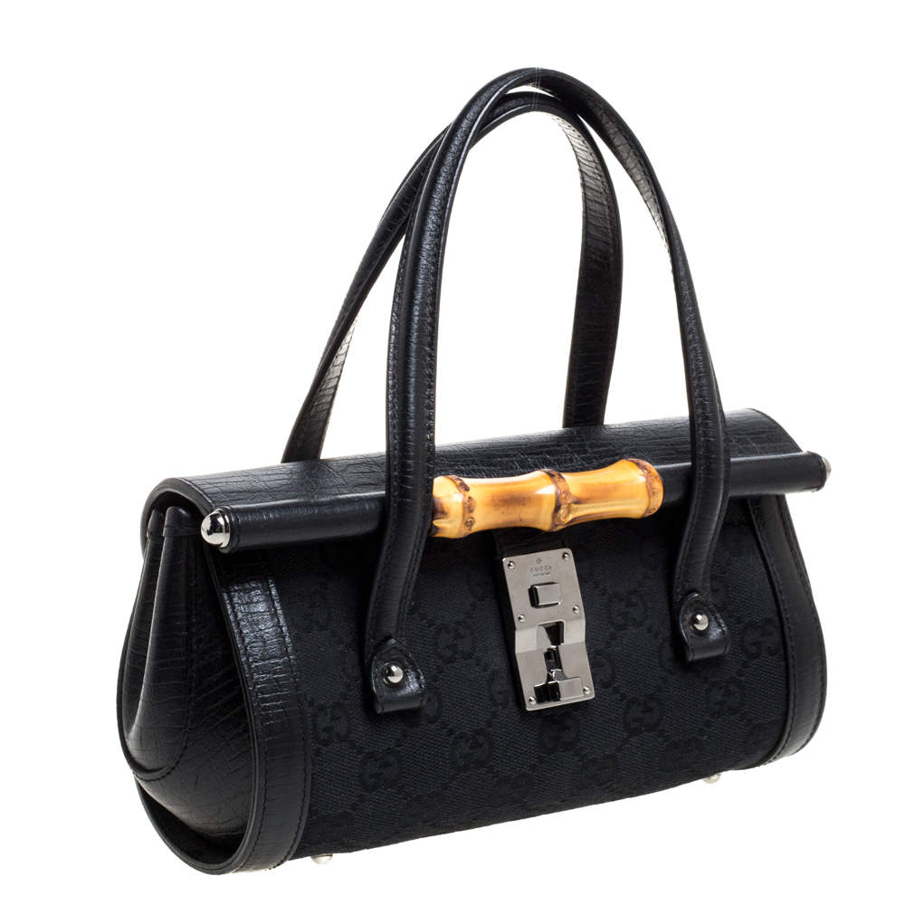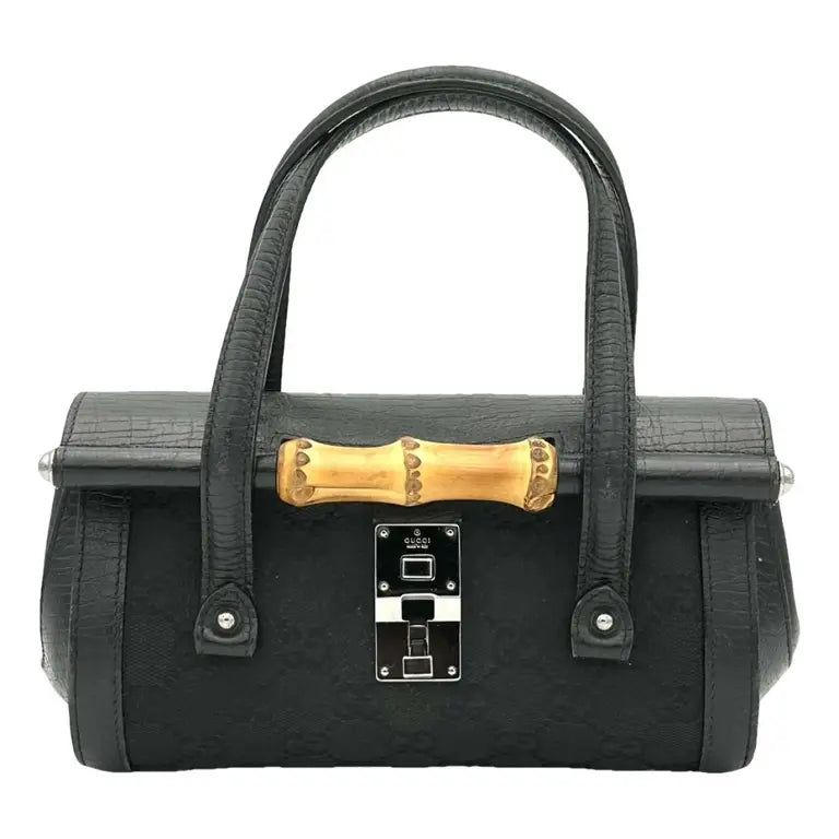 A striking blend of Heritage craftsmanship and modern edge, the Gucci Small GG Canvas Calfskin Leather Bamboo Bullet Bag is a collectible statement piece that showcases the House’s iconic codes. Crafted from classic GG Monogram canvas, this compact silhouette is accented with smooth leather trim and Gucci’s legendary bamboo hardware, sculpted and polished by hand for a distinctive finish.