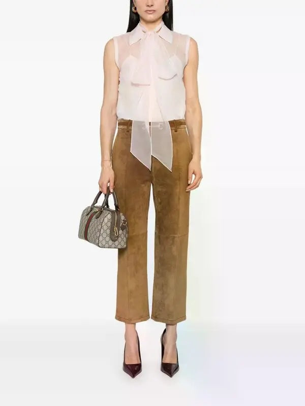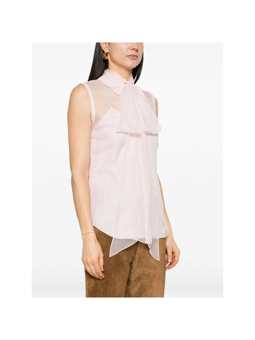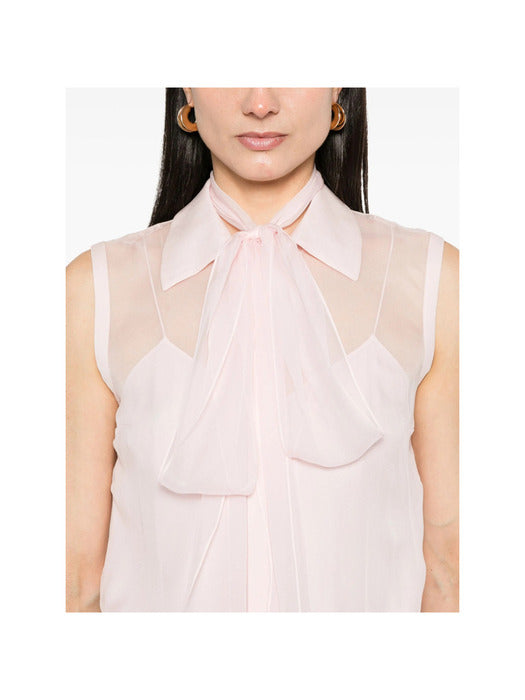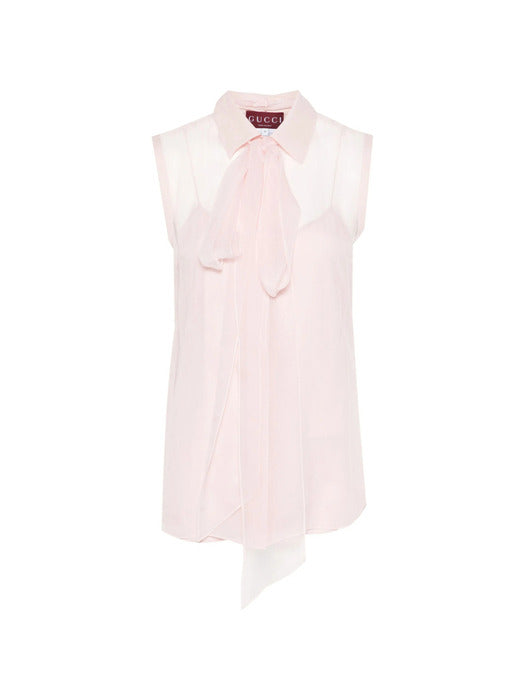 This Gucci Pink Silk Chiffon Sleeveless Bow-Tie Top exudes soft elegance and refined femininity. Crafted from a lightweight, airy fabric, the top drapes beautifully and offers a delicate, semi-sheer finish that enhances its romantic charm. The classic pointed collar is complemented by a flowing self-tie bow, adding a touch of timeless sophistication to the minimalist silhouette.
