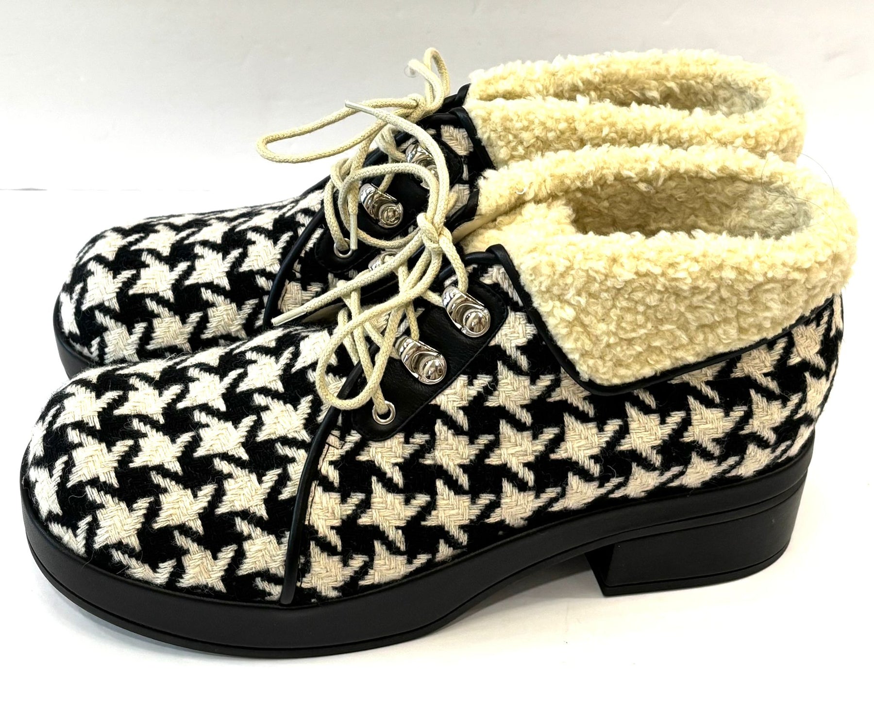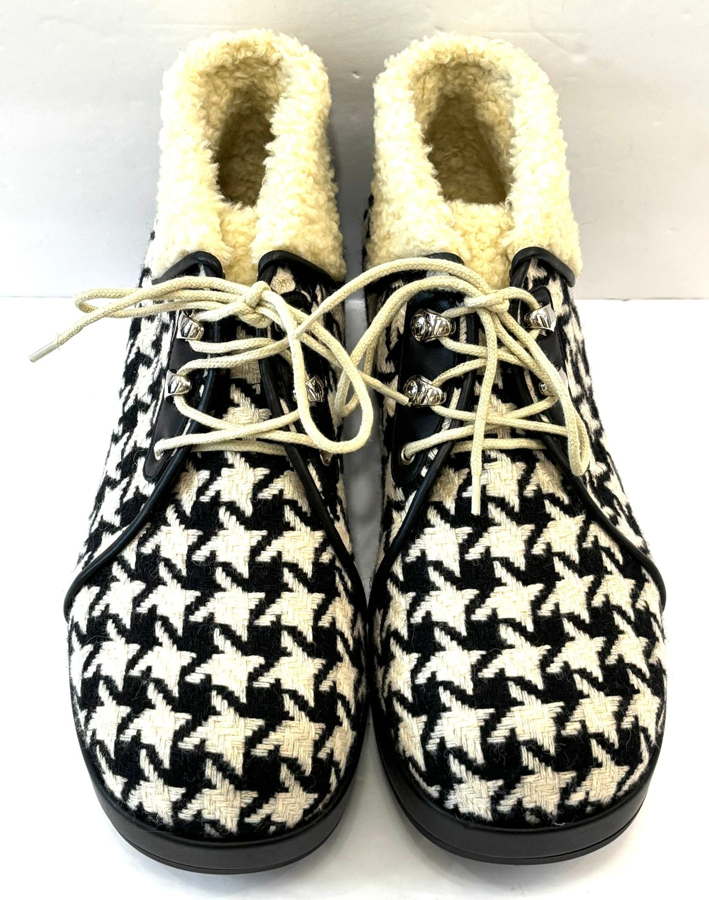Bold, luxurious, and built for statement-making style — the Gucci Wool Houndstooth Print Hiking Boots blend classic heritage with modern edge. Crafted in Italy, these boots feature a rich wool upper in a timeless houndstooth pattern, contrasted with smooth leather trim and polished gold-tone hardware for a sophisticated finish.