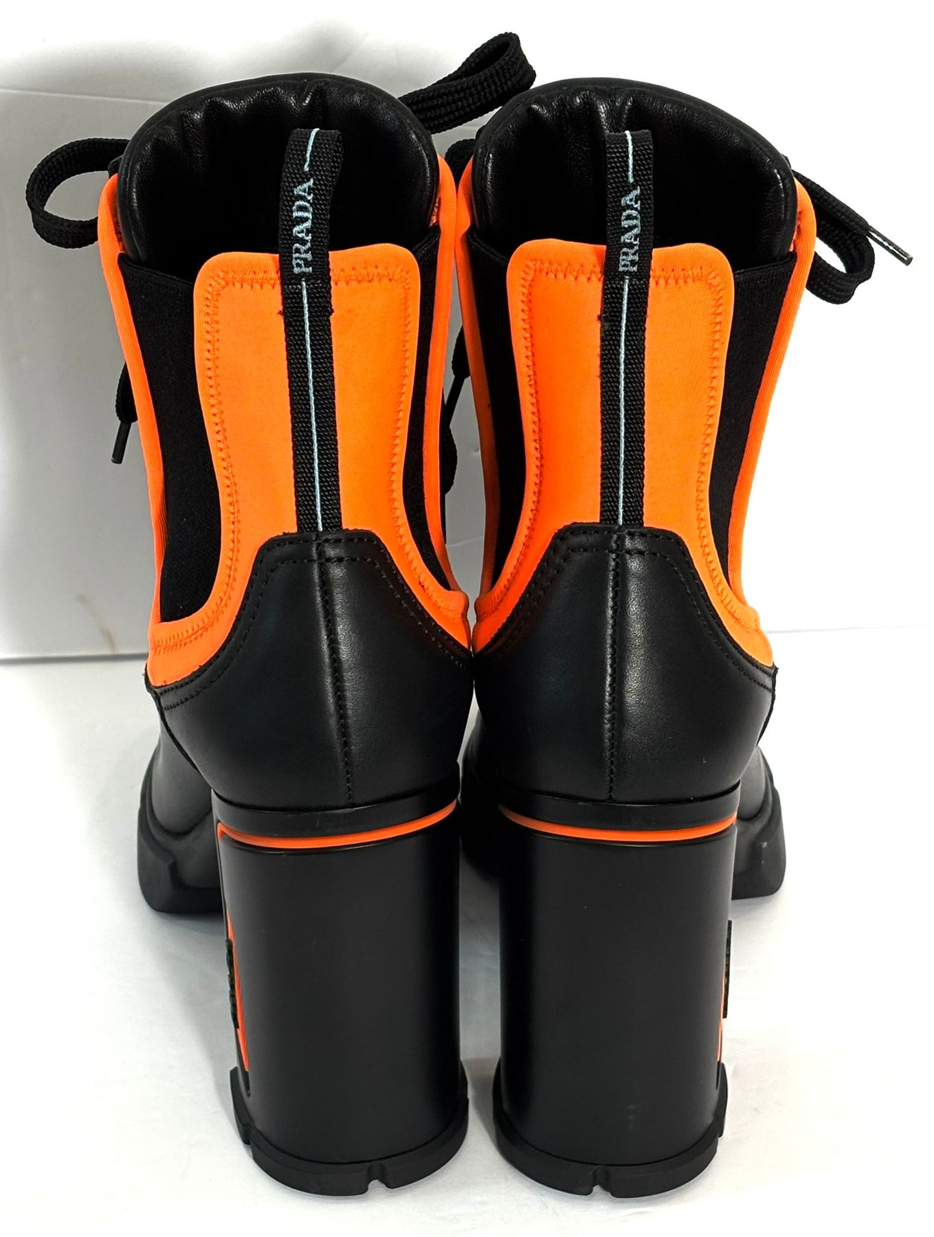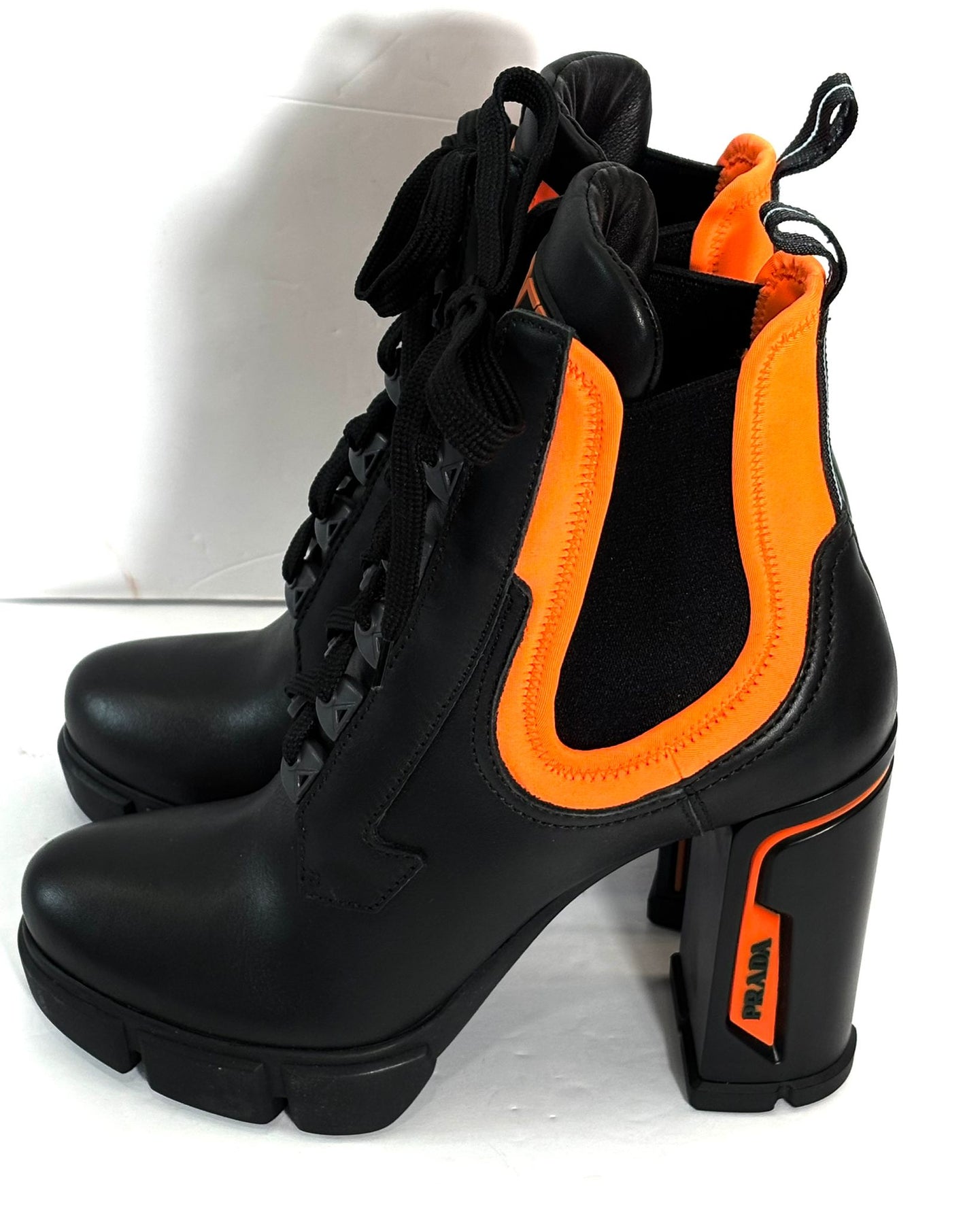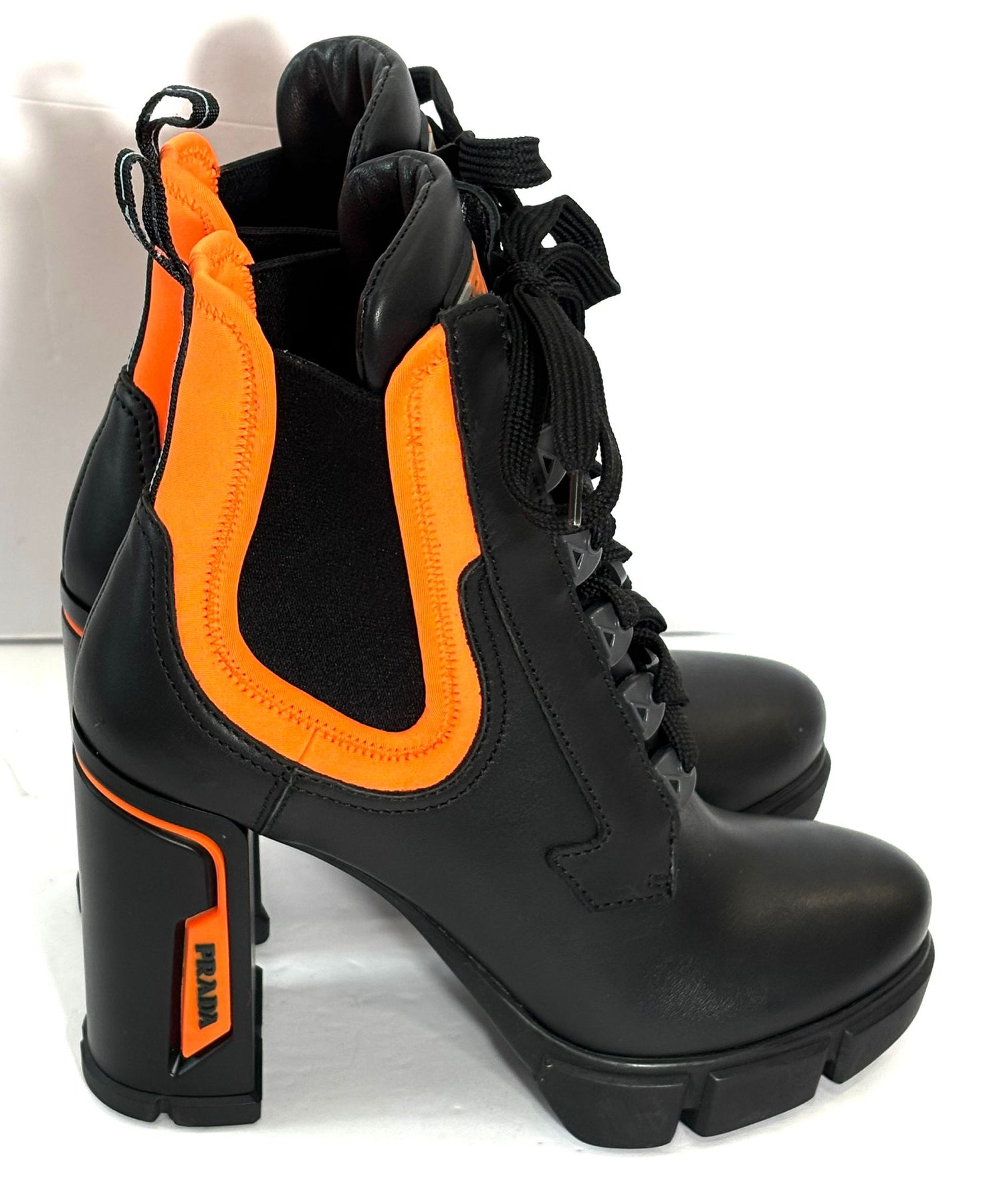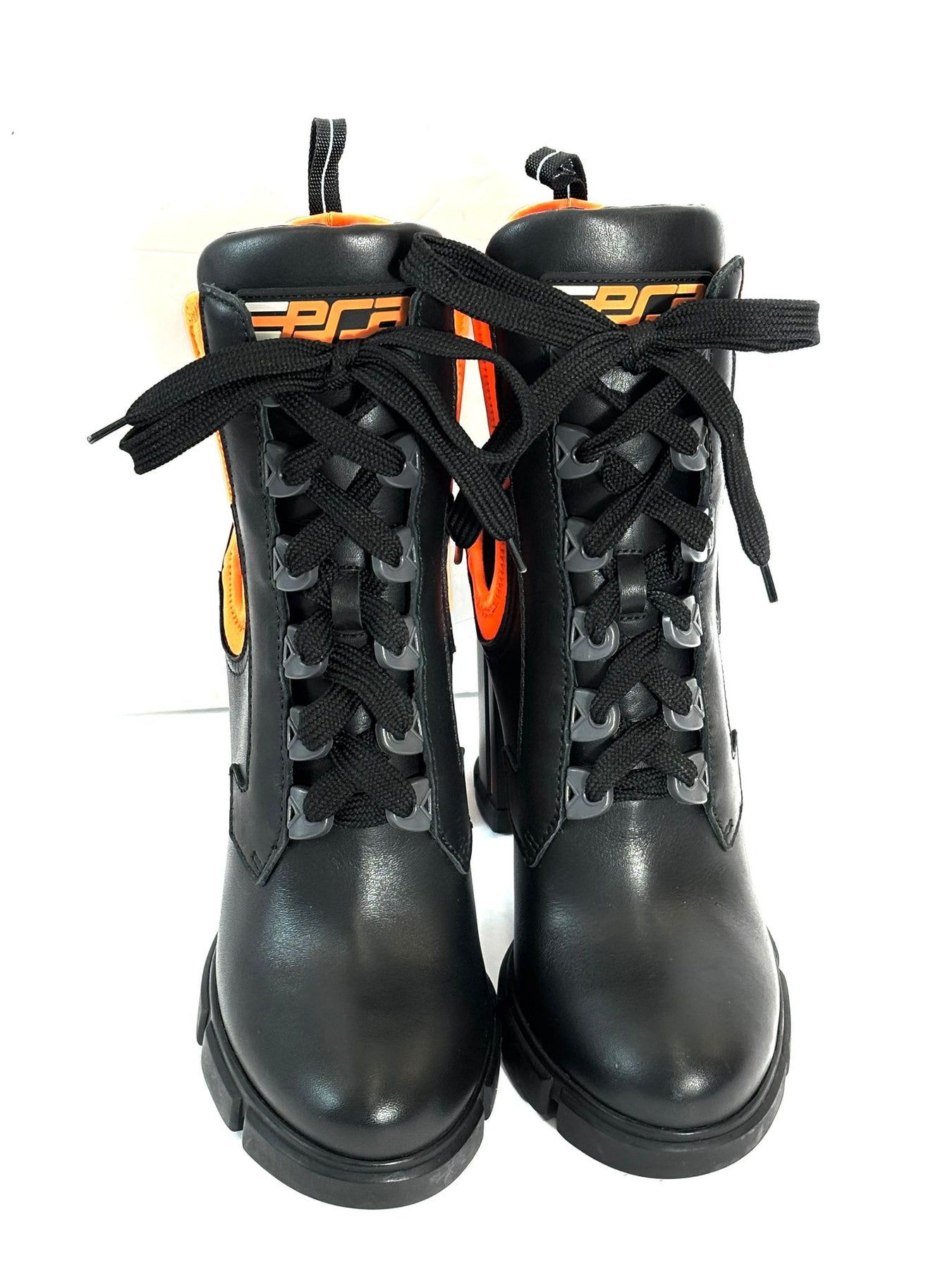 The lace-up front adds a classic combat boot touch, while subtle Prada branding—such as the enamel triangle logo or embossed heel tab—adds a signature luxury finish. Designed for both urban edge and all-day comfort, these boots are the perfect fusion of practicality and elevated design.