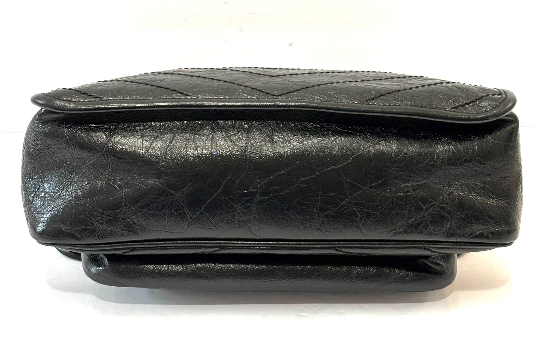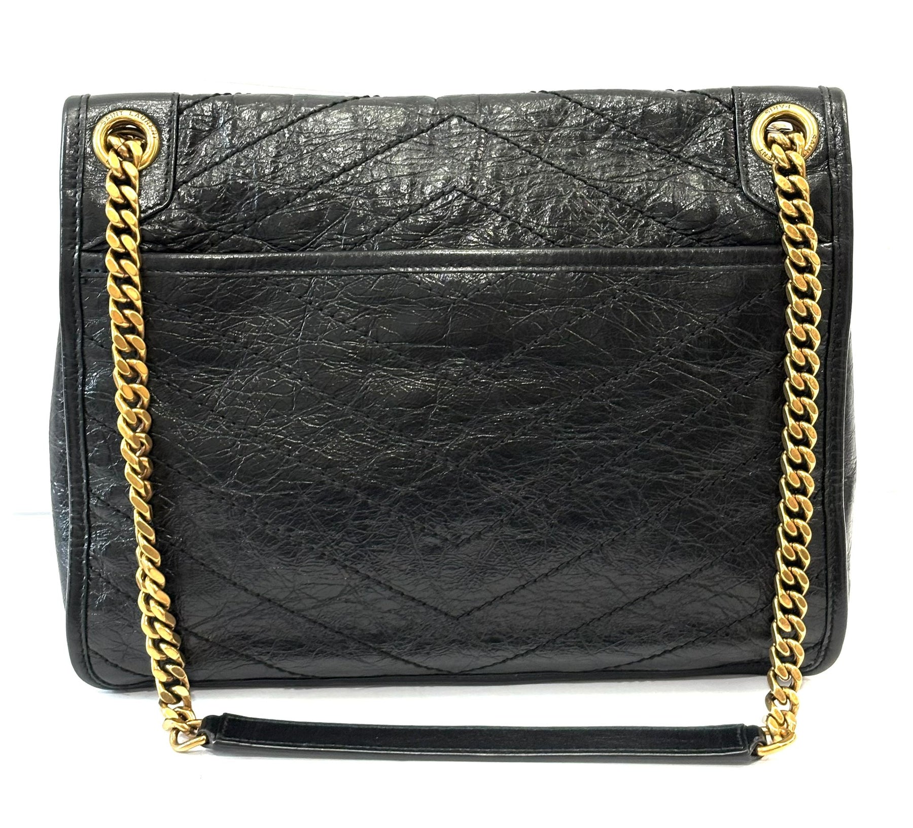 Modern sophistication meets vintage-inspired charm in the Saint Laurent Chevron Niki 2022 Black Shoulder Bag — a timeless icon reimagined with bold attitude and effortless elegance. Crafted in Italy from soft, crinkled calfskin leather, the bag features Saint Laurent’s distinctive chevron quilting and the signature tone-on-tone YSL monogram for a sleek, monochromatic finish.