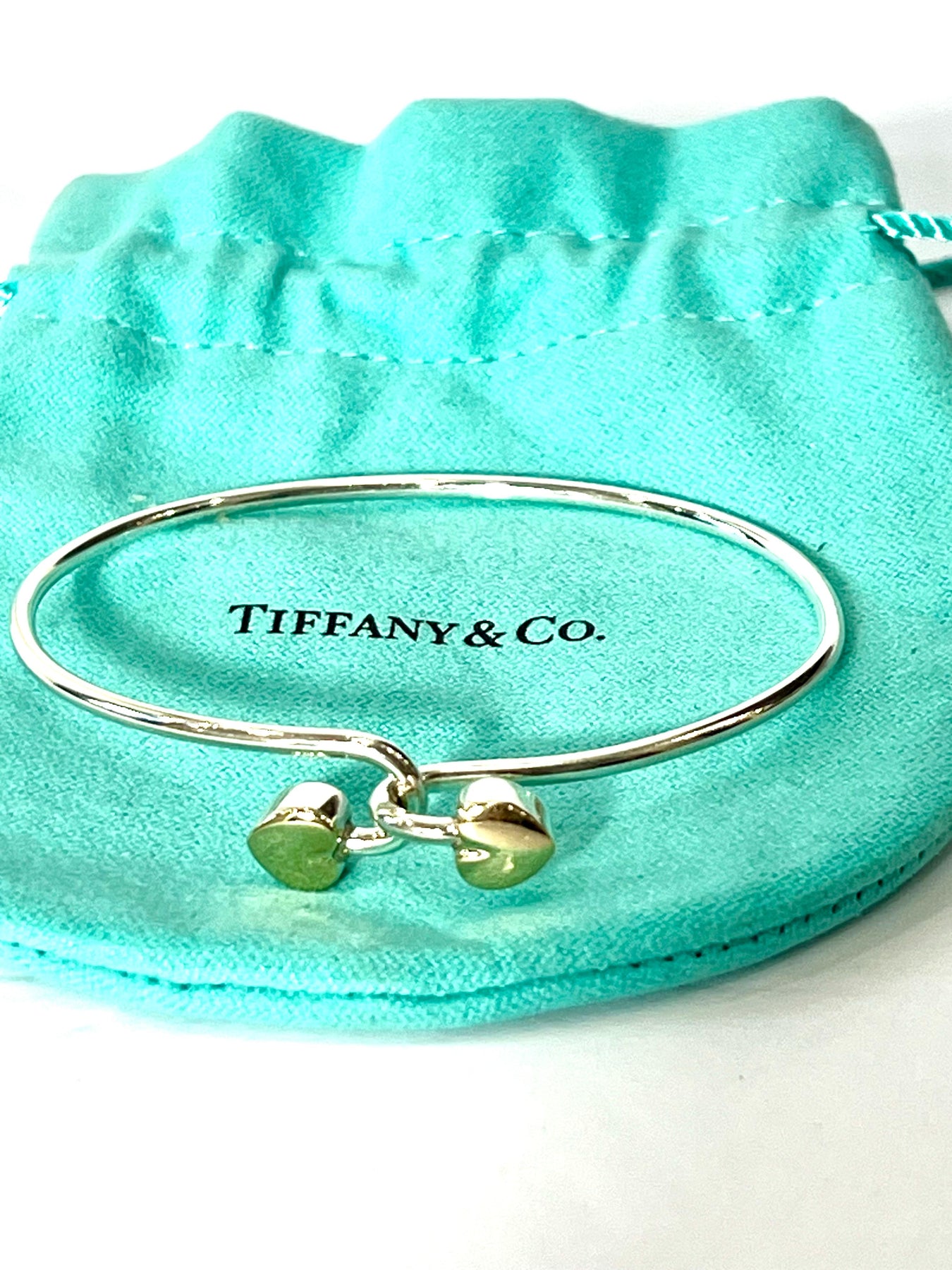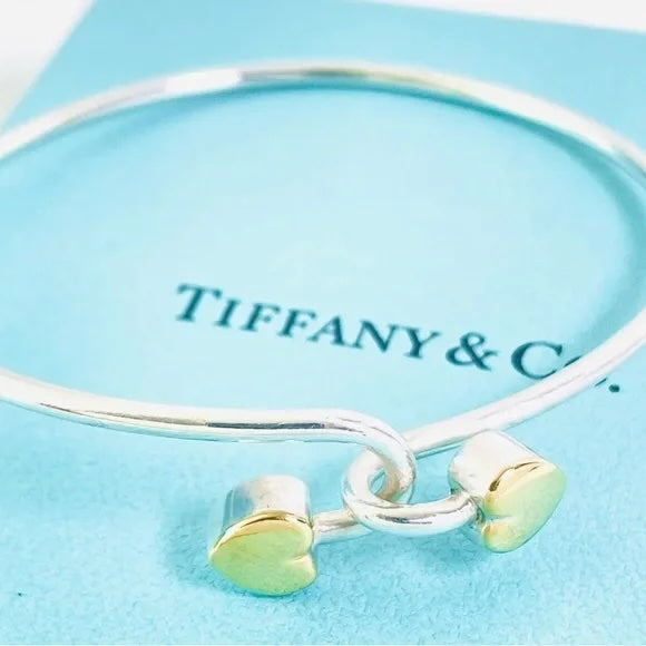 Timeless romance meets modern sophistication in the Tiffany & Co. Gold and Sterling Silver Heart Bangle Bracelet. Beautifully crafted from gleaming 925 sterling silver with 18K gold accents, this delicate design embodies Tiffany’s signature blend of simplicity and elegance.