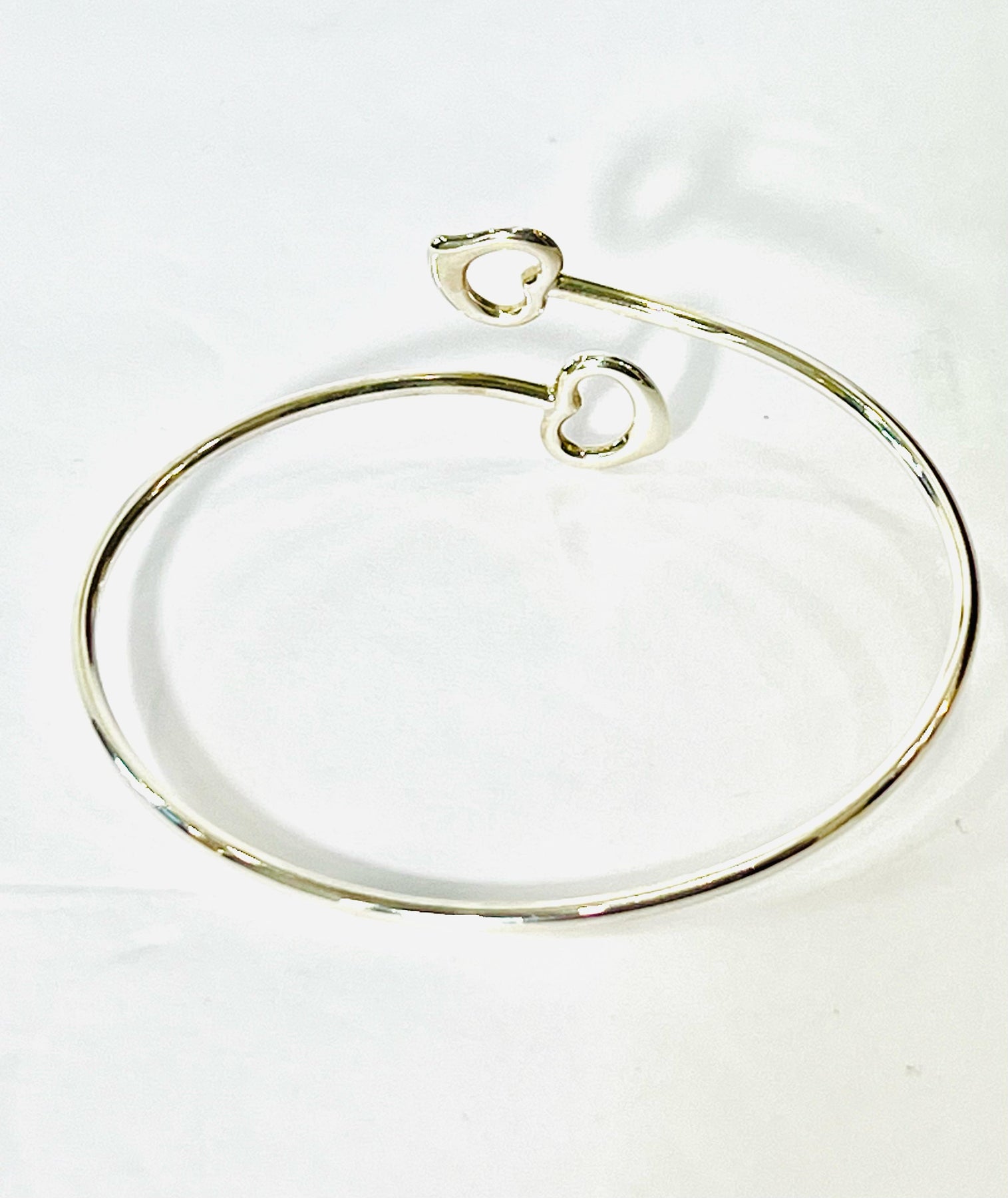 Delicate and timeless, the Tiffany & Co. Elsa Peretti Collection Double Heart Bangle Bracelet captures the brand’s signature elegance and romantic spirit. Expertly crafted from polished 925 sterling silver, this sleek bangle features two interlocking heart charms — a graceful symbol of love, connection, and enduring style.