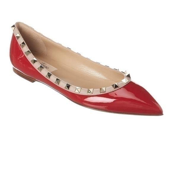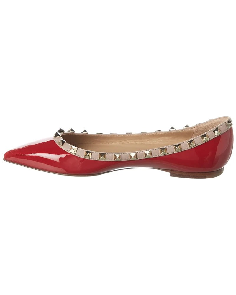 The iconic pyramid Rockstuds, each meticulously hand-applied, line the trim for a touch of rebellious sophistication. A sleek pointed toe adds refinement, while the supple leather interior ensures lasting comfort throughout the day. Perfect for elevating both casual and dressy looks, these flats offer effortless luxury with every step.